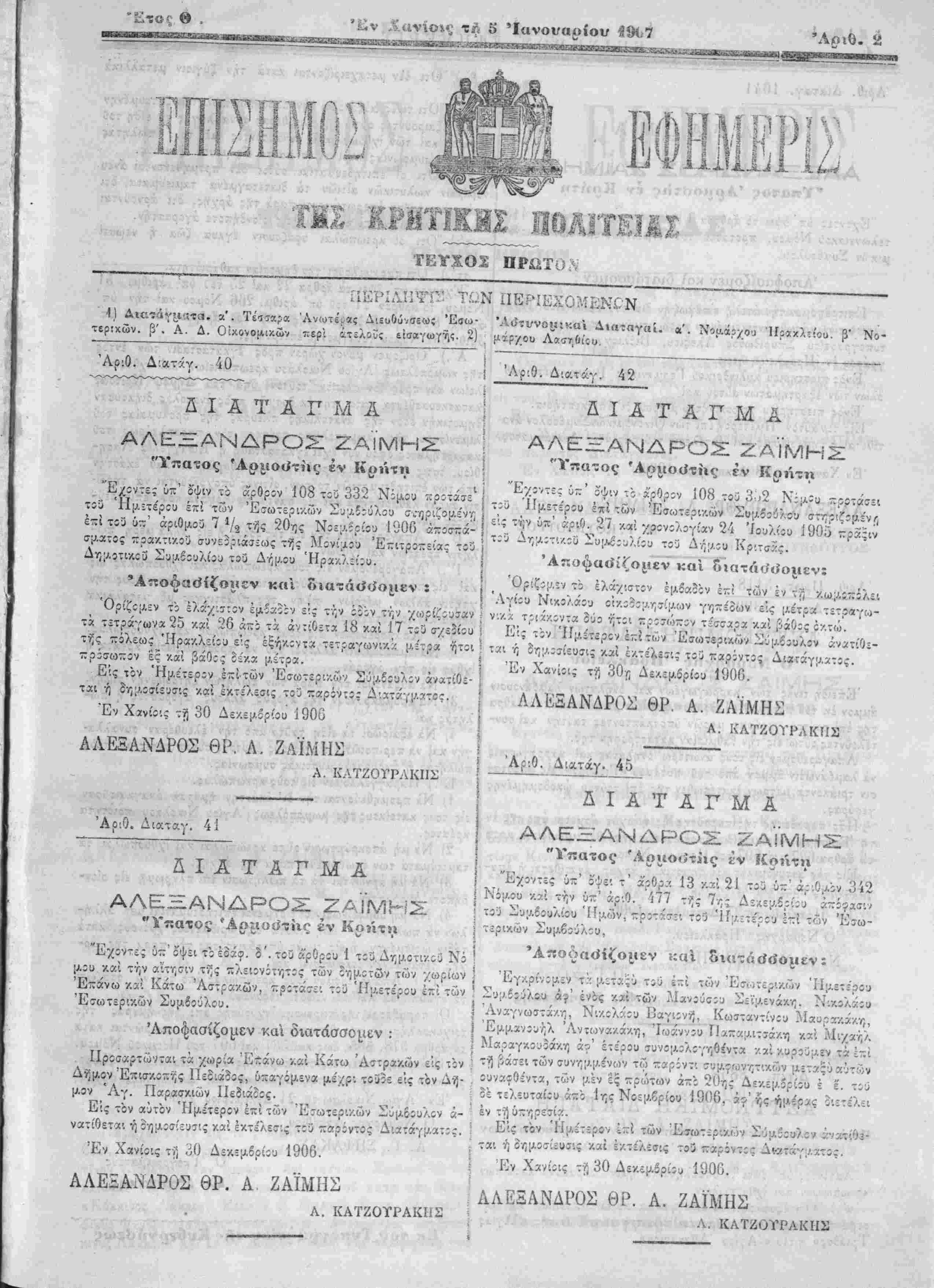 ') Λιατάγ^ΐίτα. α'. Τεαίκ^α Άνωτε^βς ΔιευΟΰνσε<ο; Έσω- 'ΛιίτννοιΐΐκαΊ Διαταγαί, α. Νοο.άρ/Ο'.ι Ιίρακλίίου β' Νο- ρ:χών. β', Α. Δ. ΟΙκονομικών ττερί ίτελοΐίί είσαγωγ'ϊ,ς. 2) μχρχου Λασηθίςυ τερ:χών Αριθ. Δ:ατ:<ν. Δ Ι Α Τ Α Γ Μ Έ. ΖΑΙΜΗ_: Αριθ. Διατάγ. 42 ΔΙΑΤΑΓΜΑ ΑΛΕΞΑΝΔΡΟΣ Ζ,Λ1*"' '*" " Ύπατος Άρι.ιοϋ'της έν Κρήτη ι . Εχοντες ύ~' όψιν .ό ά'ρθρΐν 108 -><υ 8 ^ Ε/όντε; ύπ' όψιν τΐ ά'ρθρΐν 108 τδϋ 332 Νίμου π πρίσωπίν ές καί βάθος ϊς·/.α με'τρα. ! Εις χον Ήμέτερΐν έ~ϊτών Έσωτϊρι/.ών Σύμβίυλίν άνατίθε- ται ή δη·;λασίεΐ)σ'.ς καί έκτε'λεσις τοθ παρίν:;ς Δ■.ατ?γ|Α5'τί^. Έν Χανίοις τί) 30 Δεκεμβρίου 1900 ΑΛΕΞΑΝΔΡΟΣ ΘΡ. Λ. ΖαΪΜΗΣ : Υ * -'/ < Α. ΚΛΤΖΟΓΡΛΚΙΙΣ Έν Χανίοις τ ν) 30/; Δε/.:μβρίίυ 1900. ΑΛΕΞΑΝΔΡΟΣ ΘΡ. Α. ΖΑΪΜΗΣ Α. ΚΛΤΖΟΥΡΛΚΤΙΣ Αριθ. Λιαταγ. 4ί ί Αριθ. Διατάγ. 45 ■....> -