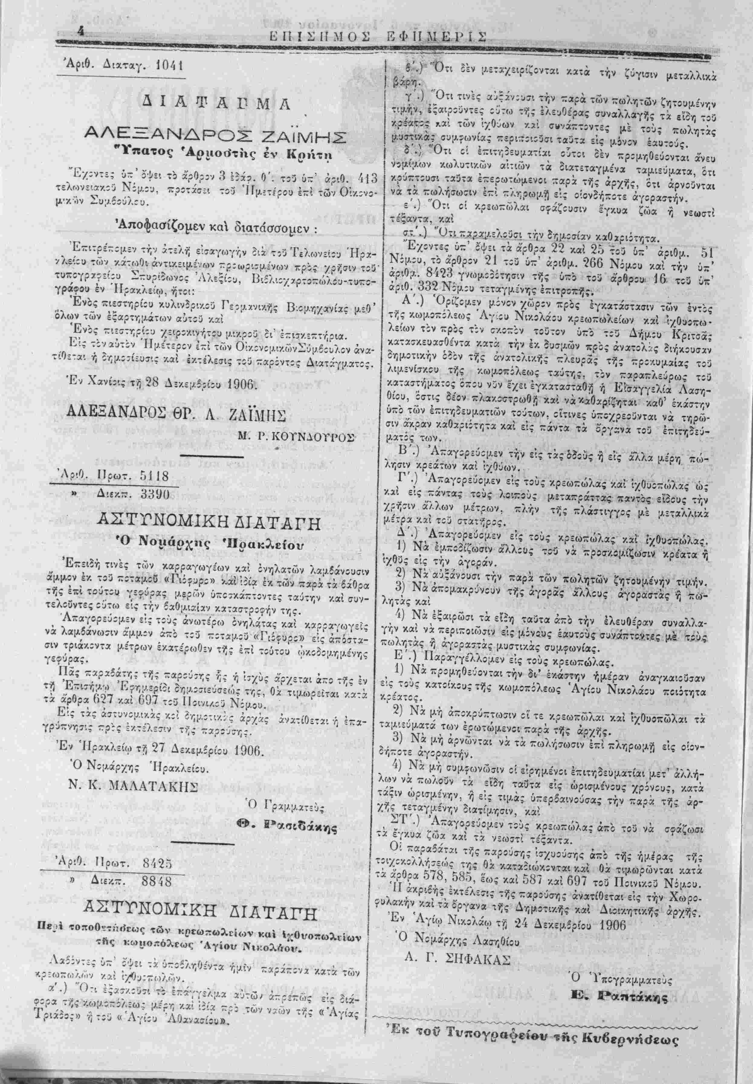 σιν τριάκοντα με'τρων έκα-ε'ρωθίν τής επί τούτου <)·/.ζοο[):Γι[).έ'/τις γε θύρας. Πας παραίάτής τής ^αρΐύΐης ή.; ή Ί-ς/ύς ά'ρχεται ά~8 τής έν τή 'Ε~υή;λΊ) Έ^ηΐ-'ίρίίί δημίΐΐίόσεο'); της, Οά τι;λωρΞίται /ατά τα ά'ρθρα 027 καί 697 τςϋ ΙΙίΐνι/.ίύ Ν:μου. Εις τάς αστυνομικάς κ:! ϊημίτικ. ς αρχάς άνατίθεται ή έ-α- γρύ-νητις ττρ'ςς έκτε'/.εσ'ν τ^ς -αρ;--ης. Έν Ηρακλείω τ?) 27 Δεκεμίρίΐυ 1906. Ό Νΐμάρνης Ηρακλείίυ. Ν. Κ. ΜΛΛΑΤΛΚΠΣ Ο Ρραμμ.α-Ξϋς Ο. 1>ασι6άκης