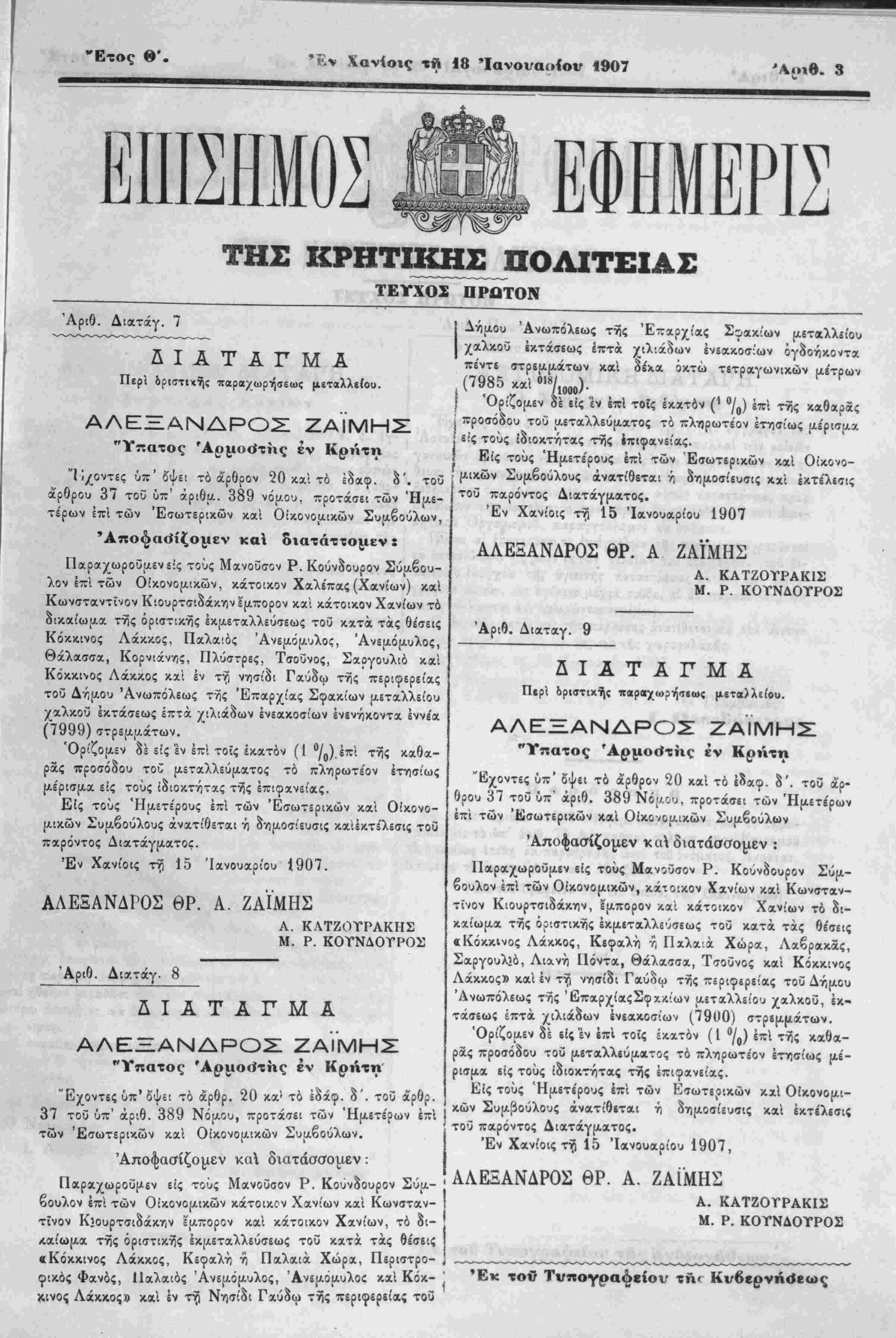 "Υπατος *Αρ«ο<ίττχς έν Κρήτη Ί ϊχοντες ύπ' δ'ψει τό άρθρον 20 κ,αί τό έδαφ. δ'. τού άρθρου 37 τοΰ ύπ' άριθμ. 389 νόμου, προτάσει των Ήμε- τε'ρων επί των Εξωτερικών καί Οικονομικήν Συμβούλων, Αποφασίζομεν καΐ διατάττομεν: Παραχωροΰμενεϊς τούς Μανοΰσον Ρ. Κούνδουρον Σύαβου- λον επί των Οικονομικήν, κάτοικον Χαλε'πας (Χανίων) καί Κωνσταντίνον Κιουρτσιδάκην έμπορον καί κάτοικον Χανίων τό οΊκαίωΐΛα ττϊς οριστικάς εκμεταλλεύσεως τοΰ κχτά τάς θέσεις Κόκκινος Λάκκος, Παλαιάς Άνεμόμνλος, Άνεμόμυλος, Θάλασσα, Κορνιάνης, Πλΰστρες, Τσοΰνος, Σαργουλιό καί Κόκκινος Λάκκος καί έν τη νησίδι Γαύδω της περιφερείας τοΰ Δήμου Άνωπόλεως της Επαρχίας Σφακίων μεταλλείου χαλκοΰ έκτάτεως έπτά χιλιάδων ένεακοίίίων ένενήκοντα Ιννεα (7999) στρεμμάτων. Όρίζομεν δέ είς εν επί τοίς εκατόν (1 °/ο)·^πί τ^ **θ*- ρχς προσόδου τοϋ μεταλλεύματος τό ϊϊλτιρωτε'ον έττισίως με'ρισμα είς τούς ιδιοκτήτας τνϊς έττιφανεί'ας. Είς τούς Ήα,ετέρους επί των Εξωτερικών καί Οίκονο- μικών Συμβούλους άνατίθεται ή δημοσίευσις καίέκτε'λεσις τοϋ —αρόντος Διατάγματοε. Έν Χανίοις τί) 15 Ίανουαρίου 1907. ΑΛΕΞΑΝΔΡΟΣ ΘΡ. Α. ΖΑΙΜΗΣ Ι Δτΐ|/.ου Άνωπόλεως της Επαρχίας Σφακίων μεταλλίίου Ι χαλκοΰ εκτάσεως έπτά χιλιάδων ένεα,κοσίων ογδοήκοντα χεντε στρεμμάτων κα'ι δέχα όκτώ τετραγωνικών μέτρων (7985 καί ··"„„). } Όρίζομεν δέ είς εν επί τοίς εκατόν (1 °/0) επί της καθαρϊς | προσόδου τοΰ αεταλλεύματος τό πληρωτέον ετησίως μερισμα | είς τοϋς ιδιοκτήτας της επιφανείας. Ι Εις τοΰς Ήμετε'ρους επί των Έσωτερικών καί Οϊκονο- • μικων Συμβούλους άνατίθεται ή δημοσίευσις κχί εκτέλεσις τοϋ παρόντος Διατάγματος. Έν Χανίοις τη 15 Ίανουαρίου 1907 ΑΛΕΞΑΝΔΡΟΣ ΘΡ. Α ΖΑΪΜΗΣ Α. ΚΛΤΖΟΥΡΛΚΗΣ Μ. Ρ. ΚΟΤΝΔΟΤΡΟΣ Αριθ. Διατάγ. 8 Α. ΚΑΤΖΟΥΡΑΚΙΣ Μ. Ρ. ΚΟΤΝΔΟΤΡΟΣ Αριθ. Διαταγ. 9 ΔΙΑΤΑΓΜΑ *5ί ΑΛΕΞΑΝΔΡΟΣ ΖΑΙΜΗΣ "Υπατος 'Αομοιίττις έν Κρήτη Έχοντες ύπ'όψει τό άρθρ. 20 κα1 τό έδάφ. δ'. τοΰ ά'ρθρ. 37 τοΰ ύπ' αριθ. 389 Νόμου, -ροτά<.ει των Ήμετέρων επί των Εξωτερικών καί Οίκονομικών Συμβούλων. Αποφασίζομεν καί διατάσσομεν: Παραχωροΰμεν είς τοΰς Μανοΰσον Ρ. Κουνδουρον Σύμ¬ βουλον επί των Οϊκονορ,ικών κάτοικον Χανίων καί Κωνσταν¬ τίνον Κ'ουρτσιδάκην έμπορον καί κάτοικον Χανίων, τό δι- λαίωμα τής όριστικίΐς εκμεταλλεύσεως τοΰ κατά τάς θέσεις «Κόκκινος Λάκκος, Κεφαλή η Παλαιά. Χώρα, Περιστρο- φιχ,ός Φανός, Παλαιός Άνεμόμυλος, Άνεμομυλοε κ*ί Κόκ- | κινος Λάκκος» καί έν τίϊ Νησίδι Γχύδω τής περιφερείας τοϋ ΔΙΑΤΑΓΜΑ ΠερΊ δριστιχής παραχωρήιτΐω; μεταλλείου. ΑΛΕΞΞΑΝΔΡΟΣ ΖΑΙΜΗΣ "Υπατος 'Αρμο<ίτης έν Κρήτη Έχοντες ύπ' όψει τό άρθρον 20 καί τό έ^αφ. δ'. τοϋ άρ¬ θρου 37 τοϋ ύπ' αριθ. 389 Νόμου, προτάσει των Ήμετε'ρων επί των Έσωτερικών καί Οικονομικωσ Συμβούλων Αποφασίζομεν κα διατάσσομεν : Παρα,χωροΰμεν είς τούς Μαν5ΰσον Ρ. Κουνόουρον Σύμ¬ βουλον επί των Οικονομικήν, κάτοικ.ον Χανίων καί Κωνσταν¬ τίνον Κιουρτσιδάχην, έμπορον χα'ι κάτοικον Χανίων τό δι- κα.ίωμ* τΫΐς όριστική; εκμεταλλεύσεως τοΰ κατά τάς θέσεις «Κόκκινος Λάκκος, Κεφαλή τ, Πχλα'ά. Χώρα, Λχβρακας, Σαργουλιό, Λιανή ΙΙόντα, Θάλασσα, Τσοΰνος καί Κόκκινος Λάκκος» καί έν τί) νιοσίδι Γαύδω τίΐς περιφερείας τοϋ Δήμου Άνωπόλεως τής 'βπχρχίαςΣφχΛΐων μεταλλείου χχλκοΰ, εκ¬ τάσεως έπτά χιλιάδων ένεακοσίων (7900) στρεμμάτων. Όρίζομεν δέ είς εν επί τοίς έκχτόν (Ι °/0) επί τή"ς καθα- ρα,ς προσόδου τοΰ (/.εταλλεύματος τό πληρωτε'ον ετησίως μέ- ρισμα είς τούς ιδιοκτήτας τής επιφανείας. Είς τοΰς Ήμετε'ρους επί των Εσωτερικήν κ,χί Οίκονθ(Αΐ- ί κων Συμβοΰλους άνατ