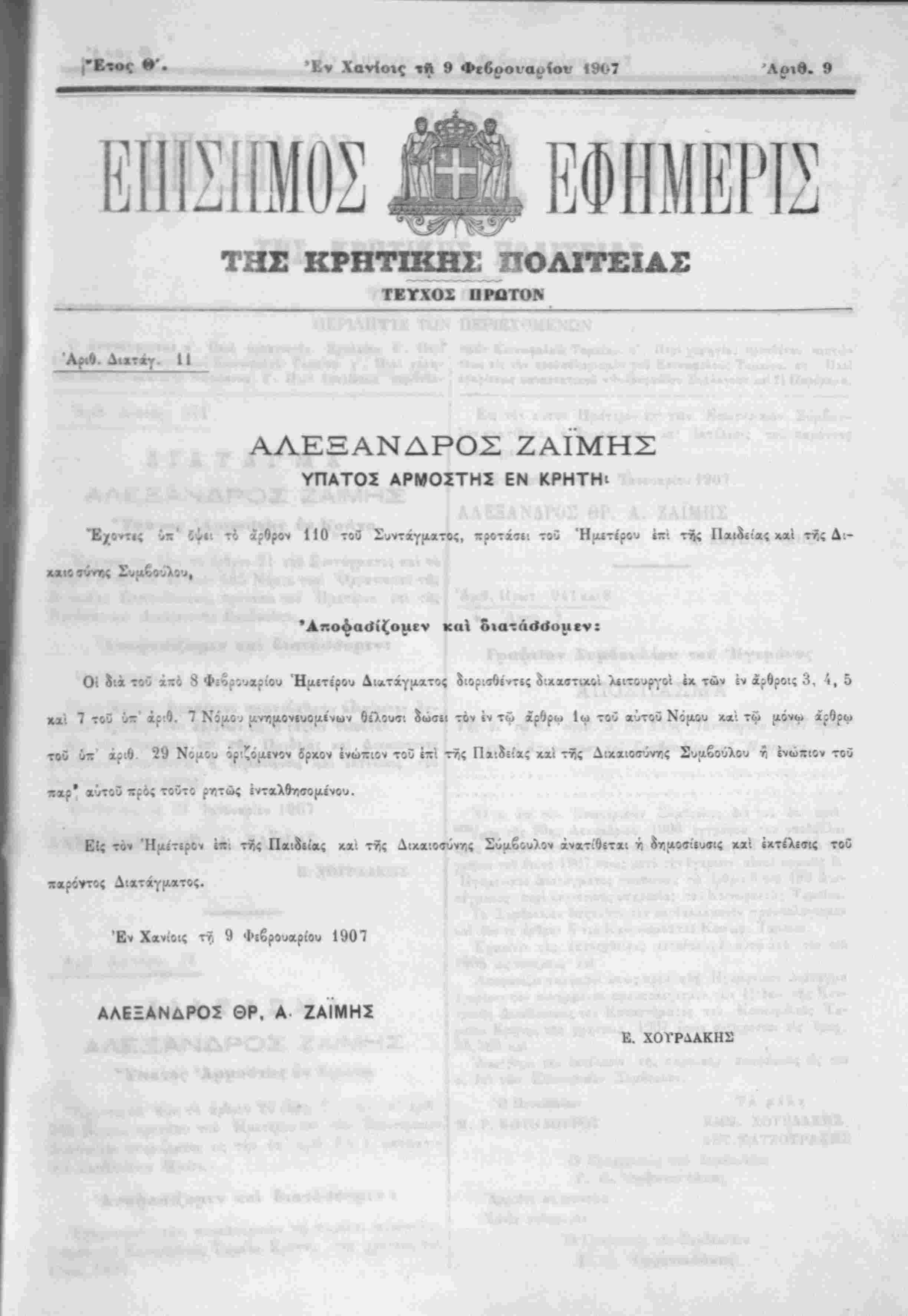 καί 5ιατά<Ι<Ιυ|ΐεν: Οί δια το·3 άχο 8 Φίορουχρίου Ήμετίρου Δι*τάγμχτος διορκΐίΐιντες δικχβτικο'ι λειτουργοί έκ των έν χρθροις 3, 4,5 χχί 7 τοΰ ύιτ" άρ:θ. 7 Νόαο^ μνημθνευου.ε'νων θίλοκι·. δωιει τόν ϊν τώ ίρθρω Ιω τ&Ο χΰτοϋ Νόμύυ χχ'. τω |ΐόνω ζρθρω τού «« άριβ 29 Νομου όρ'.ζομινον δρκον ΐνώπιον τοϋ έτ ττ,ς Πχ:δΕ;χς κχί ττ,ς Δίκχιοσΰντ,ς Συαβούλου η ενώπιον τοΰ ρ* αύτοΰ «ρός τουτο ρητώ; έντ ** * Είς τόν Ήμίτιρον έ«: τ^ς Πχιδιία,ς κχί ττ,ς Δικχιοτνντ,ς Σύμβουλον άνατίθετχι γ, δηιι.θ(τίίυβις κχί έκτέλΕϊΐς τοϋ παρόντος Διχτάγμ*τος. Έν Χανίοις ττ. 9 Ψιβρουαρίου 1907 ΑΛΕΞΑΝΔΡΟΝ ΘΡ. Α. ΖΑΙΜΗΣ Ε. ΧΟΤΡΛΑΚΗΣ