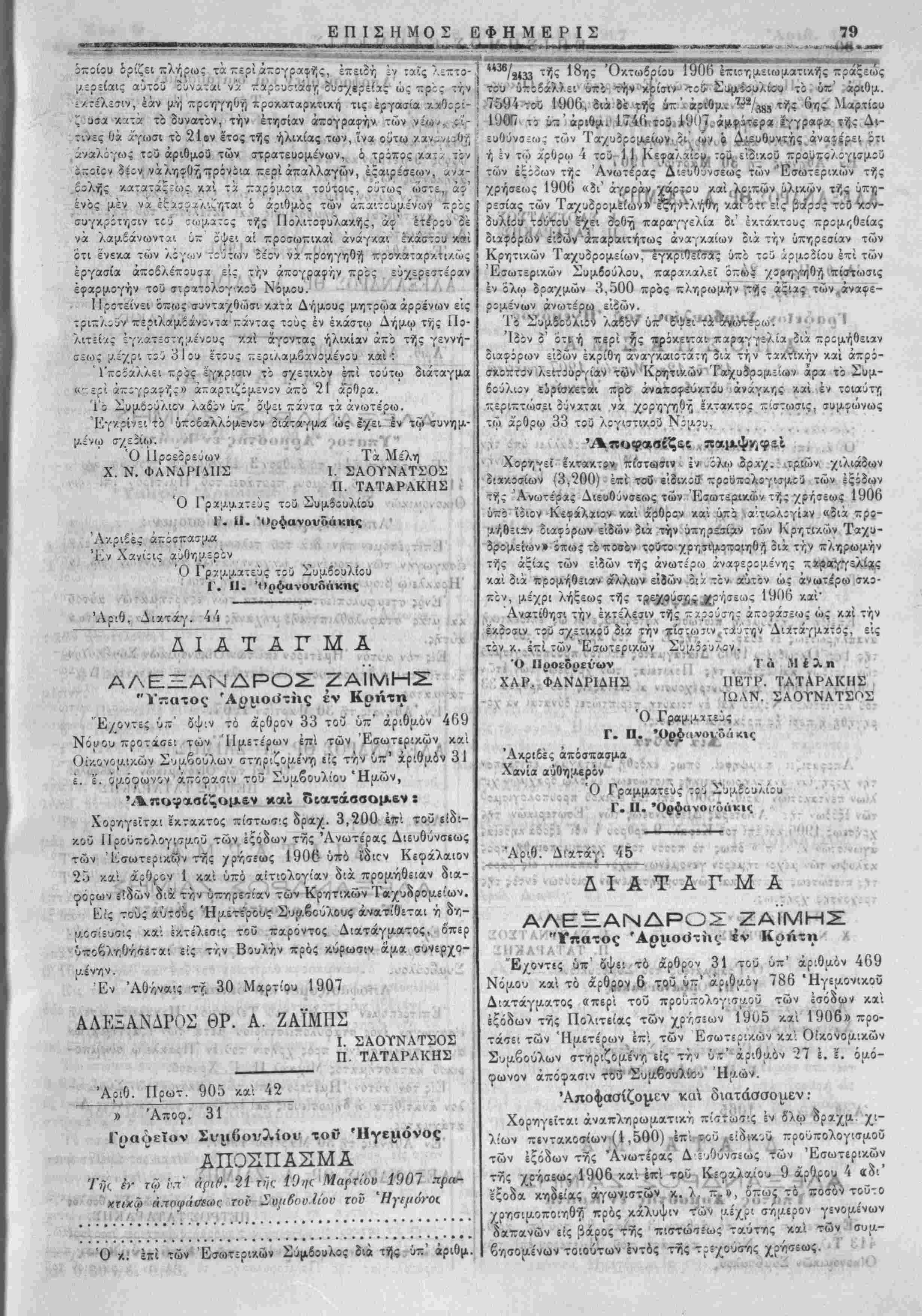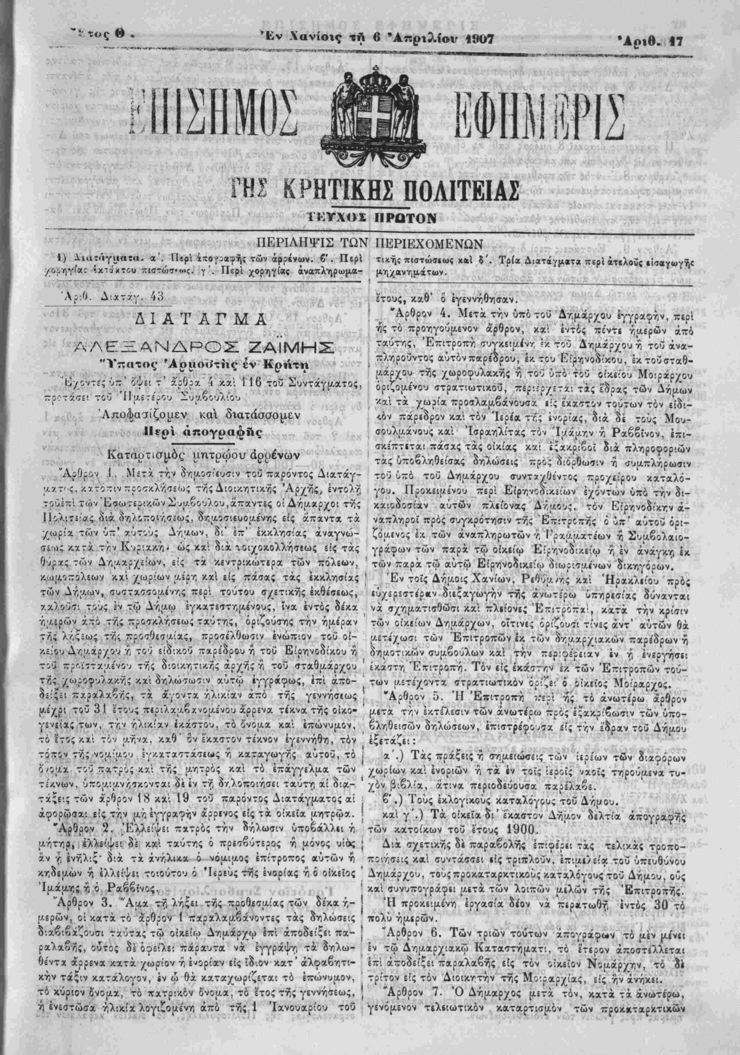 Τ»·Γν<~ - *. ,'γ ' . .0, ^^νΛΕΞΑΝΔΡΟΣ ΖΑΪΜΗΣ V· "Υίτατος 'Αριιο«Ιτης έν Κρήτη * " -χτχχ φ , , , ΰ^οντί; υ— όψει τ αρΰρχ -4 κα; προτάσει τοΰ 'ΊΙμετε'ρου Συμβουλιου [ χ.( Άπΰφασίζοαεν καϊ δαατασσομε,ν "· Α*νΰβ;·<»1»'ρί μητρώου αρρενων -'5Λχ:< "Άρθρον Ι. Μετχ. την δημοσίευσιν τοΰ πχρόντο; Διατάγ- μ>7' ς. /.χτοτιν προσκλήσεως τής Διοικητικώς Άρχής, έντολή
