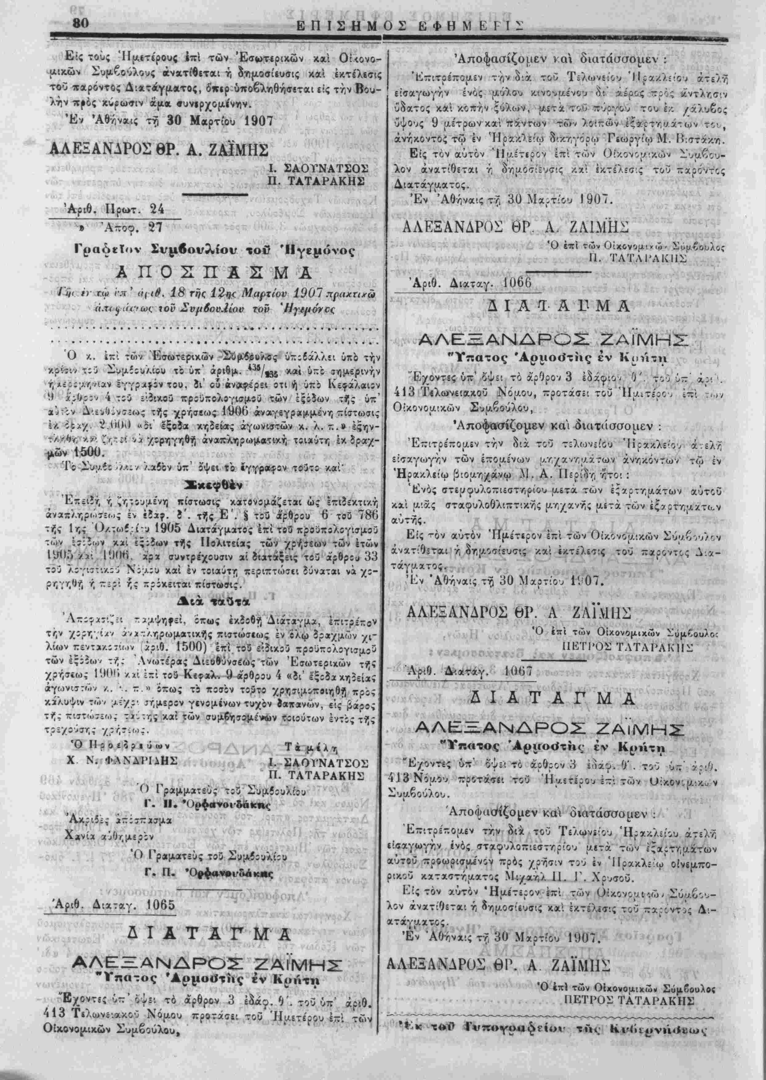 τής άίςίας των ε'.ϊών τής ανωτέρω άναφερομε'νης πα<6»γγελία,ς καί διά προμήθειαν άλλων είϊών οι^ τϊν αΐιτόν ώς ανωτέρω σκο¬ πόν, μέχρι λήξεως τής τβε^ιίσκΐυ,ι^ρόσεως 1906 καί' Λ Ανατιθητι, -ήν εκτέλασιν τής τζζροϊζ^: ά-ορά-εως ώς καί την ΦΑΝΔΡΙΔΗϋ Ο Άκριδες απόσπασμα^ Χανιά αΰθη;α.ερον*' '" "Λ* ' Γ. Π.,.'ϋρφίΐνο^'δά κ«ς ιιις* τοί ΧΙιμΤιιιλΐί'ιι ΠΕΤΡ. ΤΑΤΑΡΑΚΗΣ ΊΩΛΝ. ΣΑΟΤΝΑΤΣ022 ':"ί» ί ος^βς; Αριθ. Δι'χτάγ. 45" -ίοτ -·?: :τν? νω?^ ^νϊ" Α Τ Α Γ Μ Α ΑΛΕΞΑΝΔΡΟΣ ΖΑΪΜΗΣ Έ/οντίς ΰπ' όψει τό άρθρον 31 τοϋ ύπ' αριθμόν 469 /.αί τό ά'ρθβρν,.6 τςί5,ιν^' άρ^α,όν 786 Ήγεμονικοϋ Διατάγματος «περί τοϋ προυπολογισαοΰ των έσόδων κχί έξόδων της Πολιτείας των χρήτεων 19υ5 καί 1906» προ- τάιει των Ήμετέρων επί των Εσωτίρι/.ών κχί Οϊκονομικών Συμβούλων στηριζθμε'νη είς τή·' ύ,τ'άριθαόν 27 έ. Ι. όμό- φωνον απόφασιν τϋίυ 'Συΐ£€"θ"τΜίου Ή|Αών. Άποφασίζου-εν καί διατάσσου.εν: ; χρήσ&ως 1906 καί επί τοθ Κεφχλχίου 9 αρβψοχ 4 «δι' δα κης)ίίας άιγων;στών ^.λ, π^,ν, όπως τό ποσόν τουτο χρησιμοποιή πρός κάλυψιν '-τ-ών 'μέχρί'-......." οαπανών είς βάρος της πιστώιΐως ταύ¬ της εξο? σημερον γενομένων αύτης κχί βησου-ένων τοιούτων έντδς της τρίχούιττις χρήσεως των <τυ α.- Γ Ι,ίί· **'*■-*«,■*. *.--