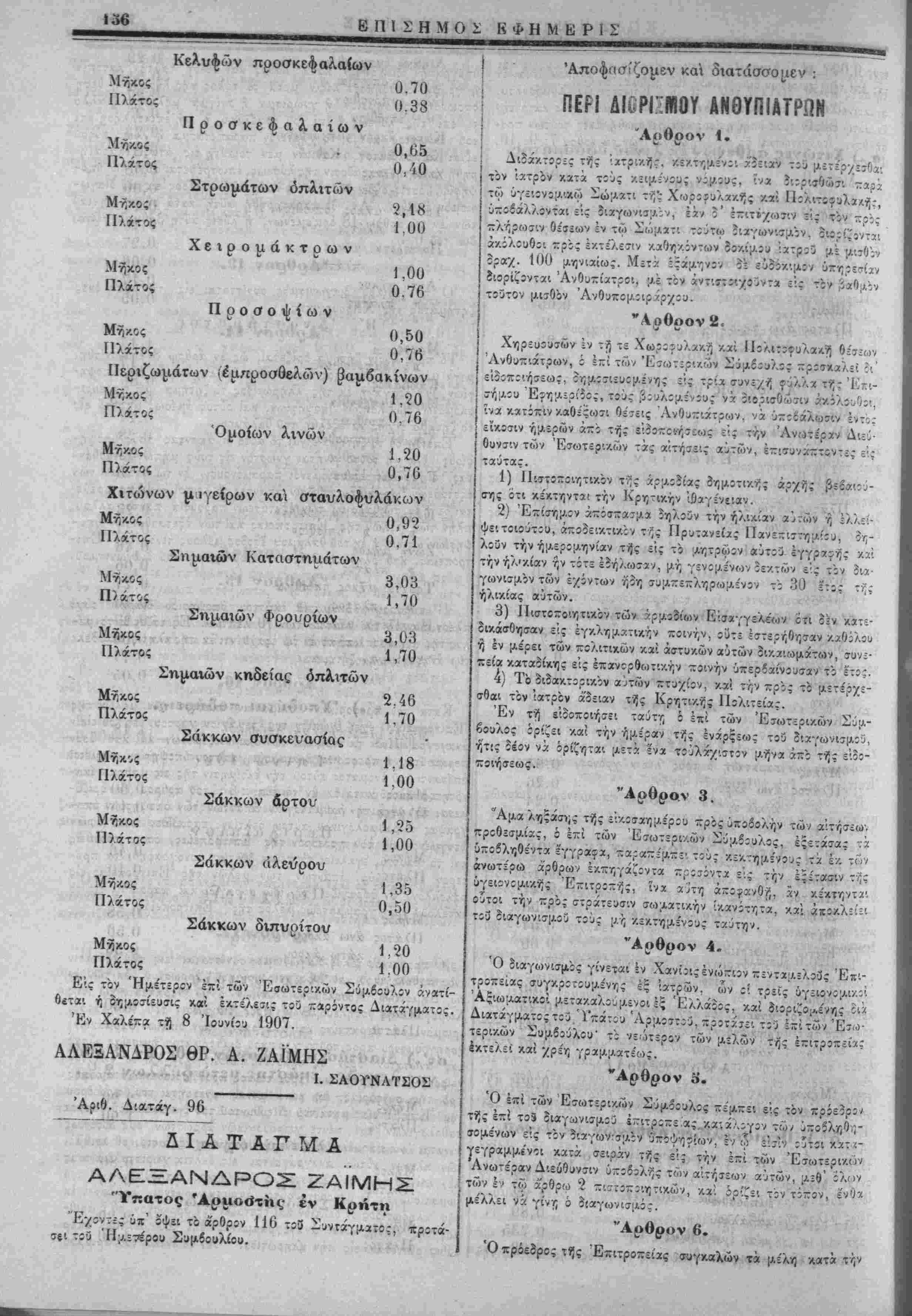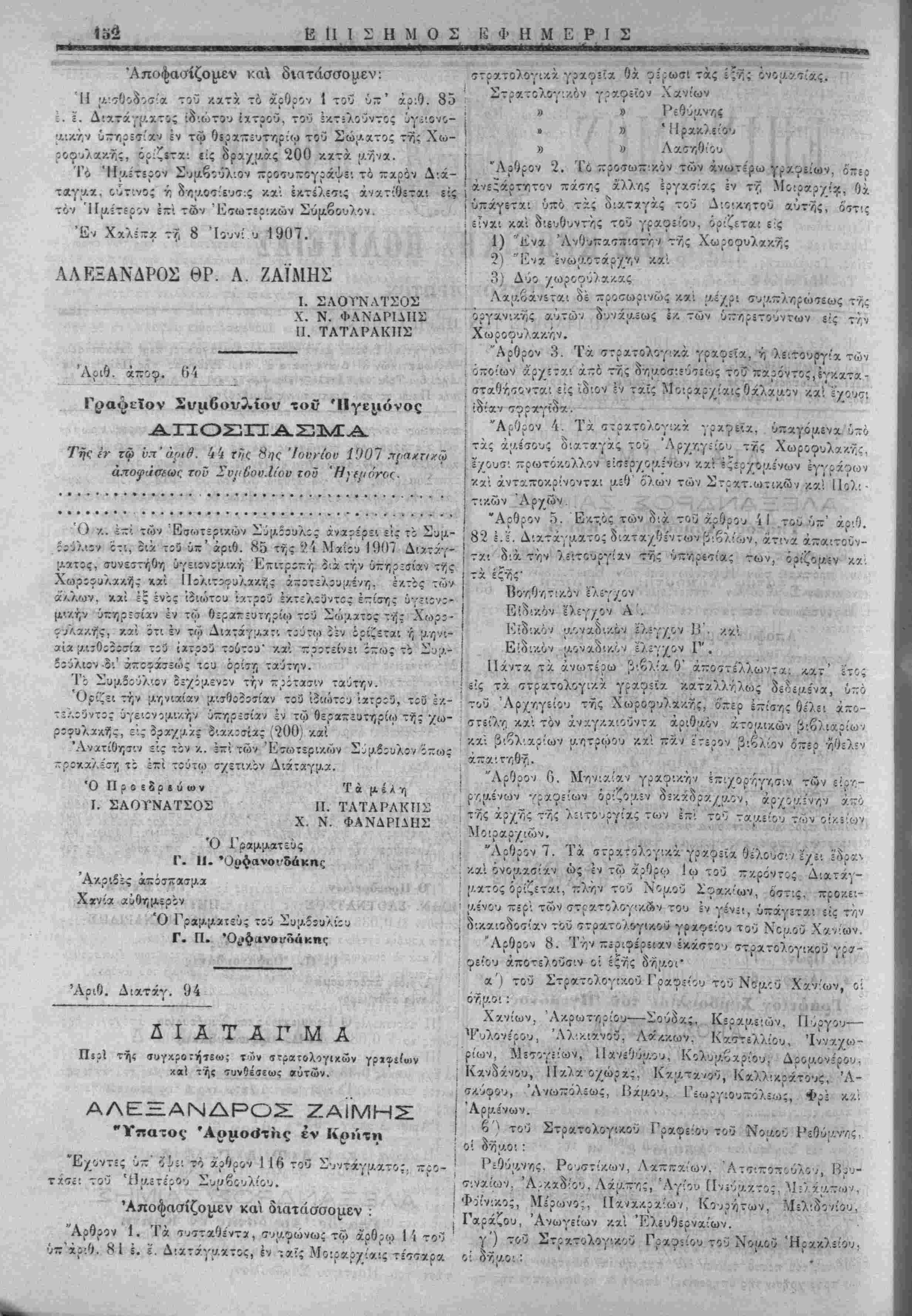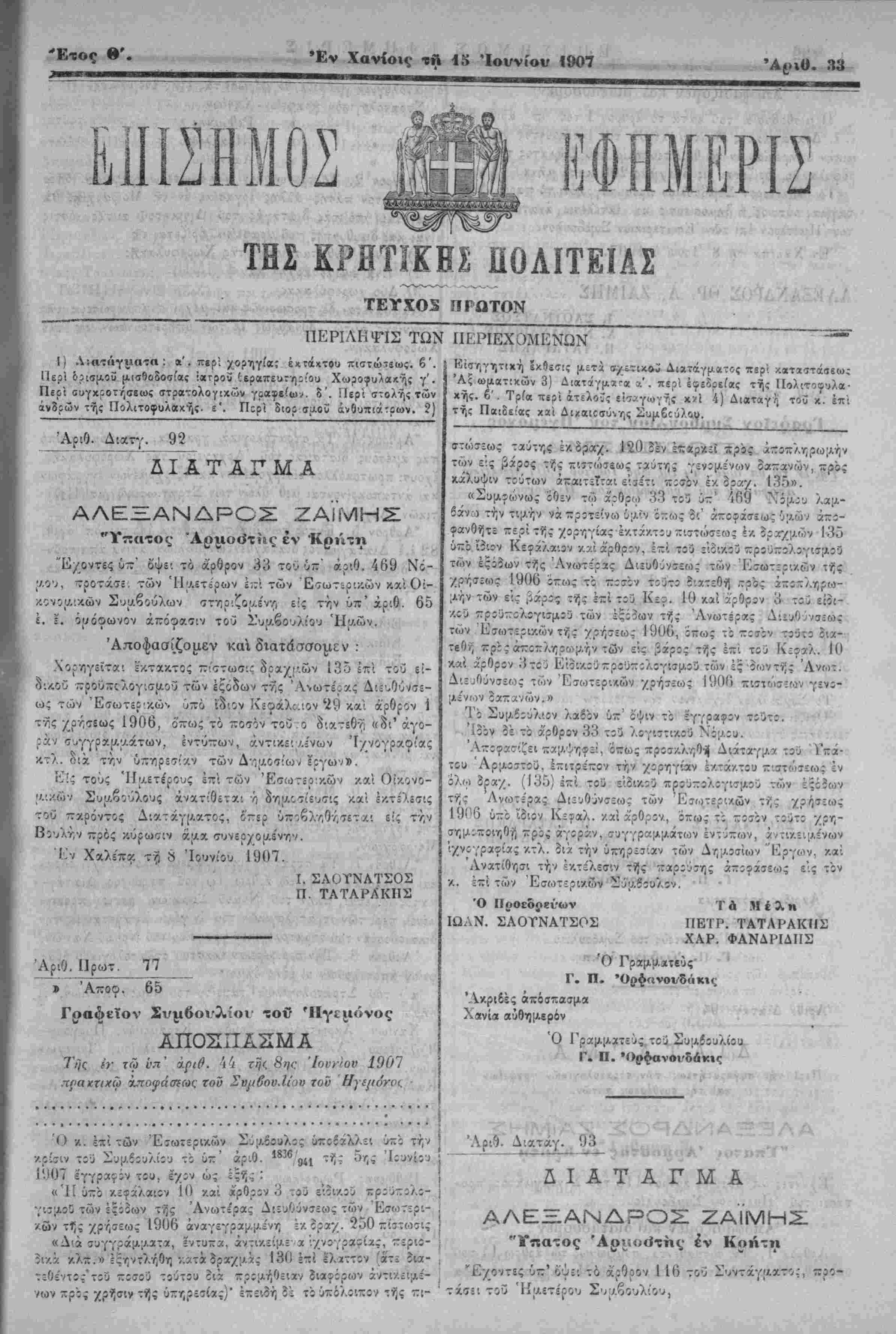 Ιΐερΐ όίισμοΰ μισθοδοσι'ας ϊατροΰ ίεραΛευτηΐ'Όυ Χ<ύ^ογ^α<'ς γ'. Περί ουγχροτήσεως στρα-τολογικών γραφε'ω,·. Β'. ΓΙερΊ στολής των άνδΐών τής Πολιτοφυλακής. £*. Πςρΐ διορ σαοί άνθυπιά-ρων. 2) Αριθ. Δίατ· "δΥαταγμα ΑΛΕΞΑΝΔΡΟΣ ΖΑΪΜΗΣ "Αριιοό'τίις έν 'Κρήτη "Εχοντες ΰ—' όψει το άρθρον 33 τού ΰ~' αριθ. 469 Νό- ν.θ'ν, "ροτκσε. των ΊΙ|Αετορων ϊ;- των "Εξωτερικών κχίθί- ΛθννΐΛΐκών Συΐλβούλων ΐϊτηριζομέν·/) είς την ύπ' αριθ. 65 ι. ϊ. όυόοωνον απόφασιν τοϋ Συμβουλίου Ημών. Αποφασίζομεν καχ ΧορΌγεϊται εΛταχ,τος π'στωσι: δρα^|·.ών 13ο επί τοΰ εί- δΐΑθϋ προϋπςλογισμοϋ των ές&δων τνϊς Ανωτέρας Διευθύνσε¬ ως των Εσωτερικώ1, υπό ίδιον Κίφάλε.ιον '29 και άρθρον 1 τνίς χρήσεως 1906, όπως τό ποίον τού ο διατεθή «δι1 αγο¬ ράν συγγρχ(Α7.άτων, έντΰπων, άντικε; Λί'νων Ίχνογραφίας κτλ. διά την ΰπηρε>7'''/ν των ΔηΐΛθσιω; εογων».