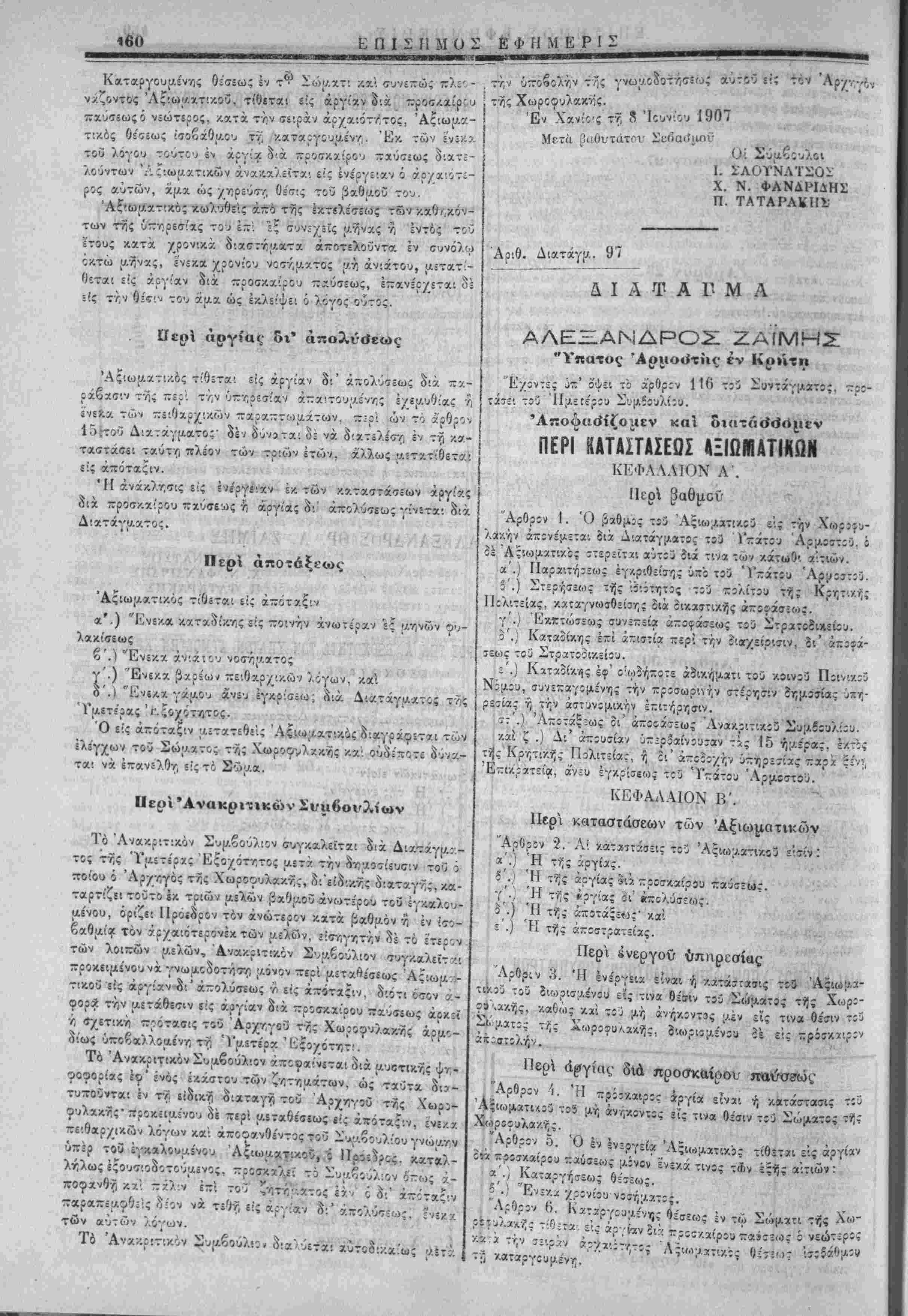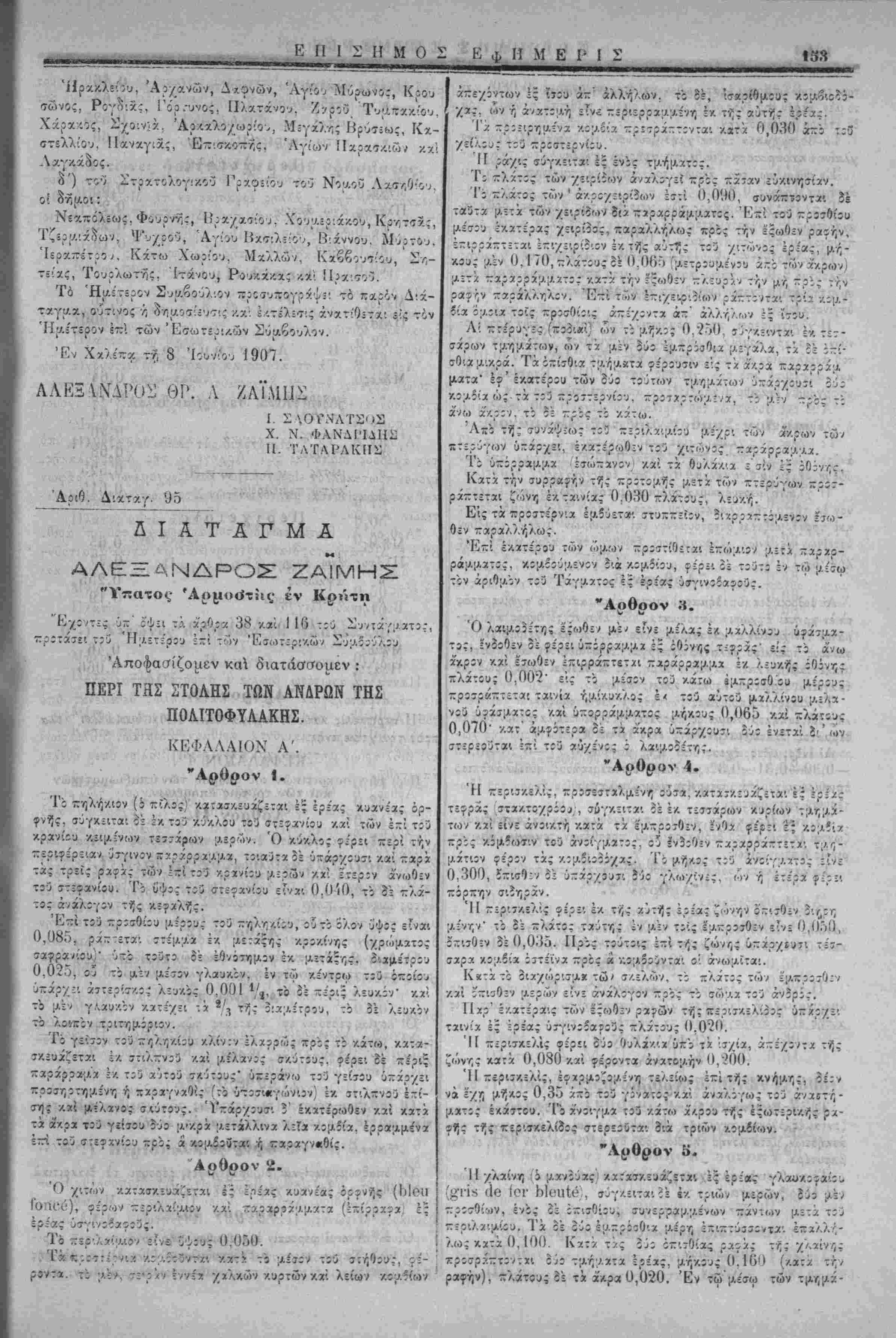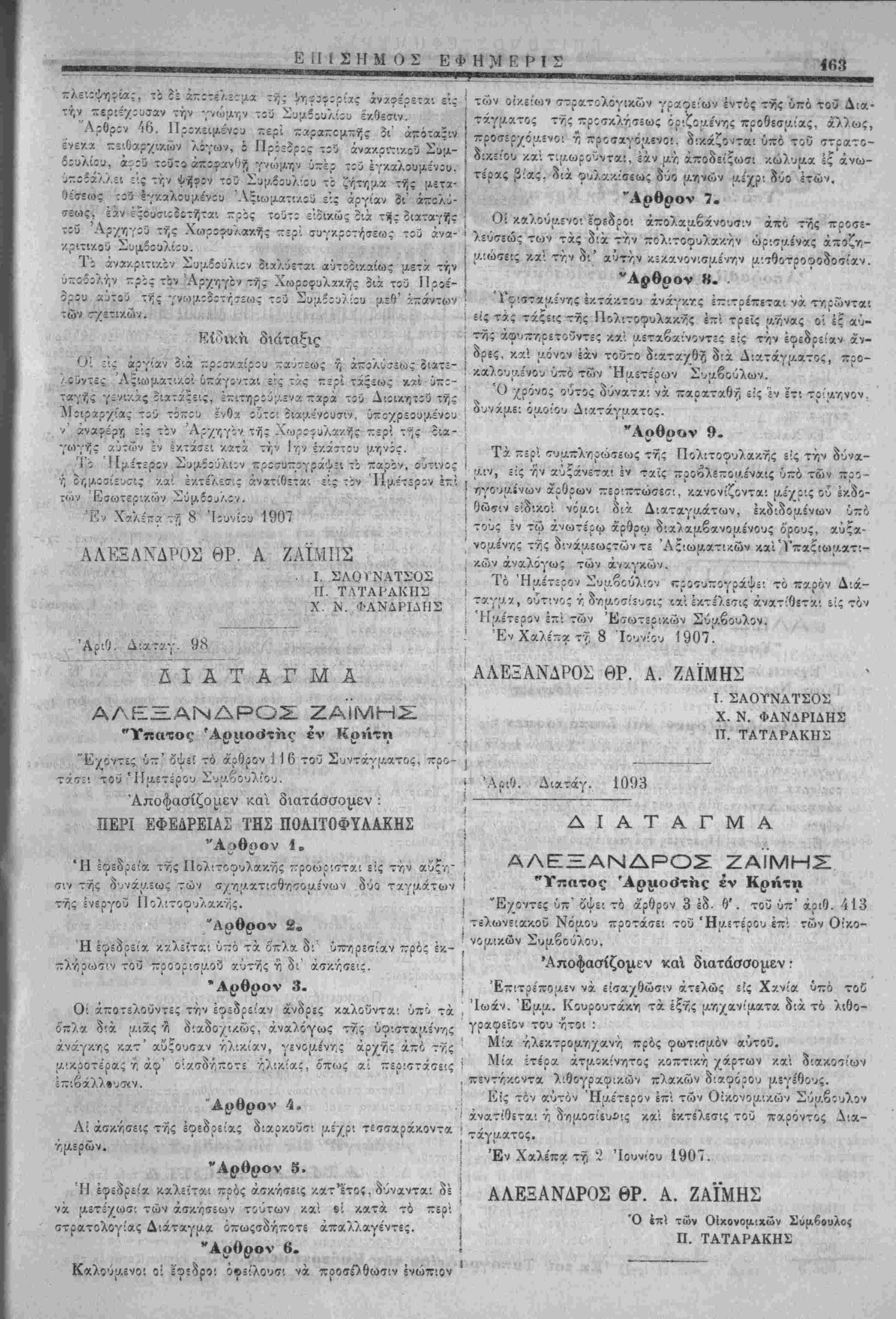 / ί'ύντίς Άςιωματ'.χοι ύκάγοντχι ε"'ς τί<ς τ.ζρι τάξεως καί ύπ;- ταγής γςνι/,άς ϊιατάςεις, έ-ιτηρ:ύ;.·.ενα -αρά τ:ύ Διβιχητ:3 τής Μ;ιραρχίας τ;ύ τόττίυ ένθα ίύτΐι οια;ο.ένουσιν. ύποχρεουμένΐυ ν' άνίΐ^έρτ; εις τϊν Άρχηγΐν τής Χωρΐιυλακής περ'. τί/ς δια- γωγής αυτών έν ;κτάσει κατά την Ιην εκάστου μηνίί. Τι 'ίΐμίτεριν Συμίίύλι;ν ::ρΐσυ~;γράψίΐ τό τζοιρζν, ούτι άθ ί ΙΙ Τι ίΐμίτεριν Συμίίύλι;ν ::ρΐσυ~;γράψίΐ τό τζοιρζν, ούτι ή θΓ,μοΐίίθίΐς ν.αί έ/.τέλ£θ··.ς άνατίθετα'. είς· τ;ν ΙΙμετερον των Έσωτερι/.ών Σΰμβΐϋλ:·/. Έ. Χαλ£-.ντ?ί 8 Ίίυνίί!) 1907 ΑΛΕΕΛΧΔΡΟΣ ΘΡ. Α ΖΑΪΜΙΙΣ νος έι:ί Ι. ΣΛθνΝΑΤΣΟΣ Π. ΤΛΤΑΓΑΚΙΙΣ Χ. Ν. ΦΑΝΔΡΙΛΙΙΣ 98 των οί/.όί'ωι ιτρα.τολόγικων γραφείων έντός ζ^ς υπό τοδ Δια- τάγματος ττ,ς -ροτκλ7,5=ως όριζον.ε'νης προθεσμΐας, άλλως, προσίρχόαίνο: ·?, προαγόμενοι. δ:κάζονται υπό τοΰ στρατο- οικει'ου κχι τιμωροϋντα:, εάν ιλ-λ, άποδε''^ωο·ι -/.ώλυΐΑα ές ανω¬ τέρας βίας. οια ουλα.κΐ'σεως οΰο μτινών υΐί'χρ'. 8νο Ιτών. "Αρθρον 7. Οί κα/.οΰ{ΛΕΌ·. εφρ-δρθ! άπολαμβάνουίΐν άπό τνΐς προσε¬ λεύσεως των τάς διά. ττ,ν πολ'.τοφυλακην ώρ:σ;/.ένας άποζη- ν.ιώσεις ν.χ την δι" αντν;ν κίκανονισμένν;ν μιτθοτροοοδοσίαν. "Αρθρον «. · Ύθ'.στχ(Α5νγ;ς έ/τά/.του άνάγκτς έττιτρέπεται νά τ-Λ,ροίνται είς τας τάςεις της Πολ·.τοφυλχκν;ς έ~ΐ τρείς (Λτίνας οί έξ αυ¬ τής άφυττϊϊρετοϋντίς καί αίταβαίνοντίί εις τ^ν έοεδρείχν άν- ορες, γ.οά ρ.όνον εάν τουτο οΊ.χτχγθ-7, διά Διατάγματος, προ- •Λαλουαενον υπό των Ημέτερον Συαβούλων. Ό χρόνο; ούτος ύύνατχ: νά, παρχταθίί είς 'ίν ίτι τ·ρι'«,ν;νον, δυνάμει όαοι'ου Διχτάγιιατος. "Αρθρον 9. Τα π=ρί συα,ιτλτ,ρώσεως τίς Πολιτοου'λακης είς την δύνα¬ μιν, ίίς ην χΰ'άνότχ! έν ταίς προβλίπομέναίς υπό των ■—ρο- ηγουμίνων άρθρων περιτττώσει:, /.ανονίζοντ*: [λέχρις ού έκδο- θώιΐιν είδ'.κοί νόι/.οι δια Διαταγαάτων, εκδιδομε'νων υπό τους έν τω ανωτέρω ά'ρθρω δια'λαα.βανοι/.Ινους ό'ρους, αύςα- νομένης της δινά;ο.5ωςτών τε Ά$!ωματικων καίΎπαζι&)«.ατ!- κ,ών αναλόγως των άνχγκών. Τό Ημέτερον ΣυΐΛοούλιον προουπογράψει τό παρόν Δ'.ά- Τ3·γ;/3ί, ούτινος τ, δτιΐΛ0(7ί2υ7ΐς ι% έκτίλίτις άνατίθίτκι &!ς τον Ημέτερον επι των Έσωτ£ρ!κ.ών Σύα Έν Χαλέττα τ7, 8 Ιούνιον 1907! ■Ίί ■ ν/-» Π Α Τ Α Γ Μ Α ' ΑΛΕ.ΞΞΑΝΔΡΟ-: ΖΑΪΜΗΣ "Υπατος Άρ«.ιο<Ιττ»ς έν Κ«)··τη "Εχοντες ύτΐ' δψίί τό άρθρον ] 16 τοϋ Συντάγι/.ατ&ς, προ- Τ7σ:·. τού ΊΙιχετέρου Συ;ο.βουλίου. Αποφασίζομεν και διατάσσομεν : ΠΕΡΙ ΕΦΕΔΡΕΙΑΣ ΤΗΣ ΠΟΑΙΤΟΦΥΑΑΚΗΣ "Αοθοον 1. Ή Ιοεδρεία τνΐς Πολ'.τοουλακης ΤΓροώριτται είς την αΰξΥ," τιν τής όυνάαίως των (Τ/'η^.χτΐίΐθντϊομΙνων ούο ταγμάτων τής ένεργοϋ ΙΙολιτοφυλα,κνΐς. "Αρθρον 2. Ή έφεδρείχ κκλίίτα: υπό τα οπλα δι' ύπτ,ρεσίαν -ρος ϊκ- ~λν)οω7ΐν τοο —ΐοοριΐϊΐΑθ8 χύτης η όι' άσγ.τ,ΐϊί'.ί. "Αρθρον 3. Ο; αποτελούντες την έφϊδρείαν άνόρες καλοθνται υπο τα οπλα διά μιας '/) οΊχοΌνι/.ώς. αναλόγως της ύο·.στα|Αε'ν·/ις άνάγ/.τ,ς /.ατ' αΰςουσαν τ,λΐκίαν, γενοιχέντ,ς άρχϊίς *πο τν;ς [Λ'.κροτε'ρας */; άφ' οίχσ-δτίποτί ήλικίας, οττως αί π£ρ:<7τάο·εις β ΑΛΕΞΑΝΔΡΟΝ ΘΡ. Α. ΖΑΪΜΗΣ Ι. ΣΑΟΤΝΑΤΣΟΣ ,Χ. Ν. ΦΑΝΔΡΙΔΗΣ ΪΤ. ΤΑΤΑΡΑΚΗΣ Αρθρον 4. Αί χα-ΛΥ,σας τής Ιοεδρίίας διαρκοΰσ'. μ=/_ρ'. τεισαράκοντοι •ψερών. "Αρθρον 5. Ή έφόδρεία καλείται πρός άτκητε'.ς κχτΐτοί, δύνανται δί νά α,ότίχωσι των άσκήσ£ων τούτων /.αί ίί χ.ατα τό περί στρατολογίας Διάταγμα όπωςιδηττοτί άπαλλαγε'ντες. "Αρθρον 6. Καλούι/.ενο: οί ΪΏίδρο: οφείλουσι νά. προ<τέλθωτιν ενώπιον • Αριθ. Διατάγ. 1093 , - : ΔΙΑΤΑΓΜΑ Ι ΑΛΕΞΞΑΝΔΡΟΣ ΖΑΪΜΗ_: ! "Υ—ατος 'Αριιοο*της έν Κρήτη "Ένοντίς ύπ" ό'ψε: τό άρθρον 3 έδ- Η'. τοο ύπ' αριθ. 413 τέλωνειακοθ Νόμου ττροτάσε: τοΰ 'Ηρ-ετε'ρου επί των 