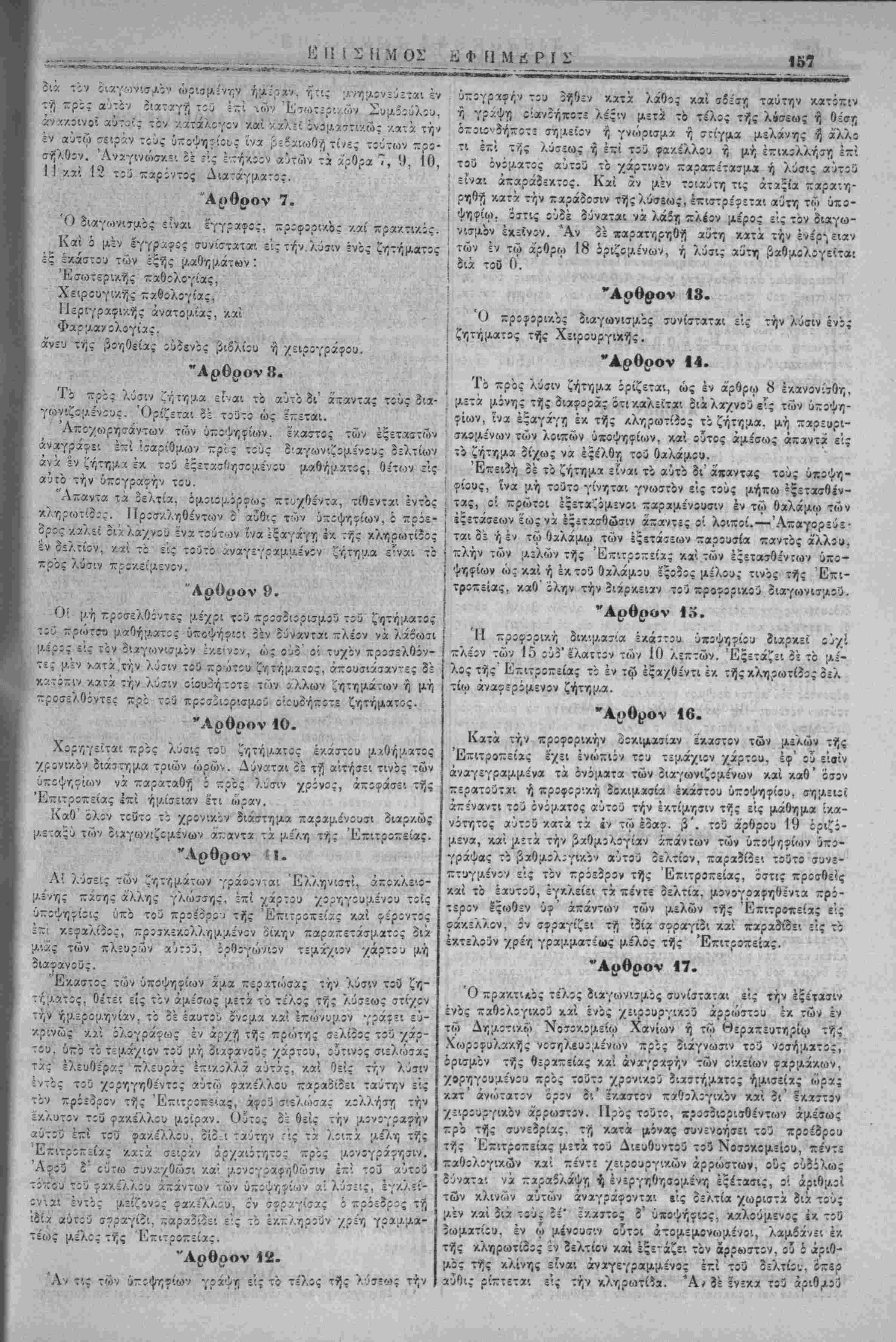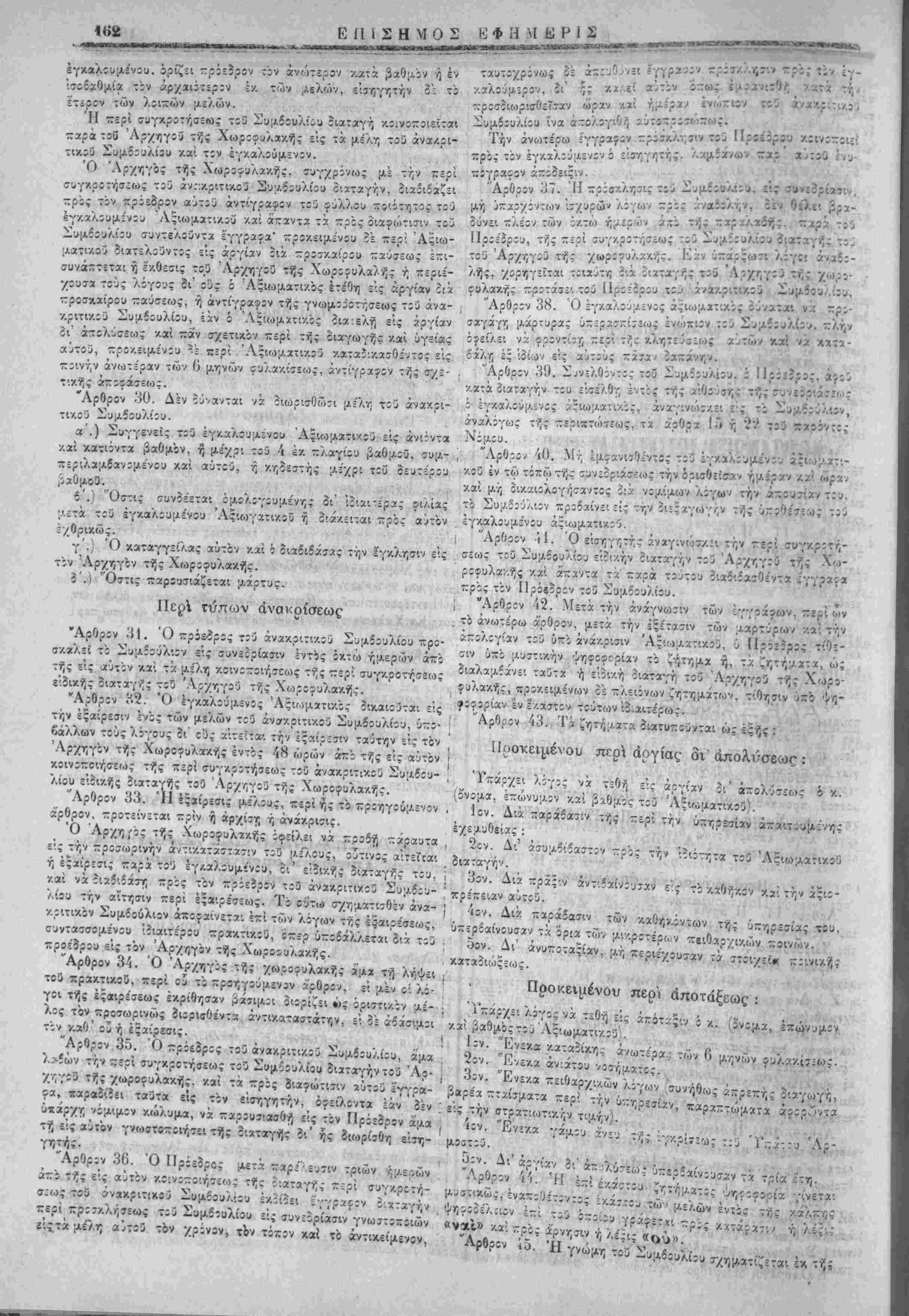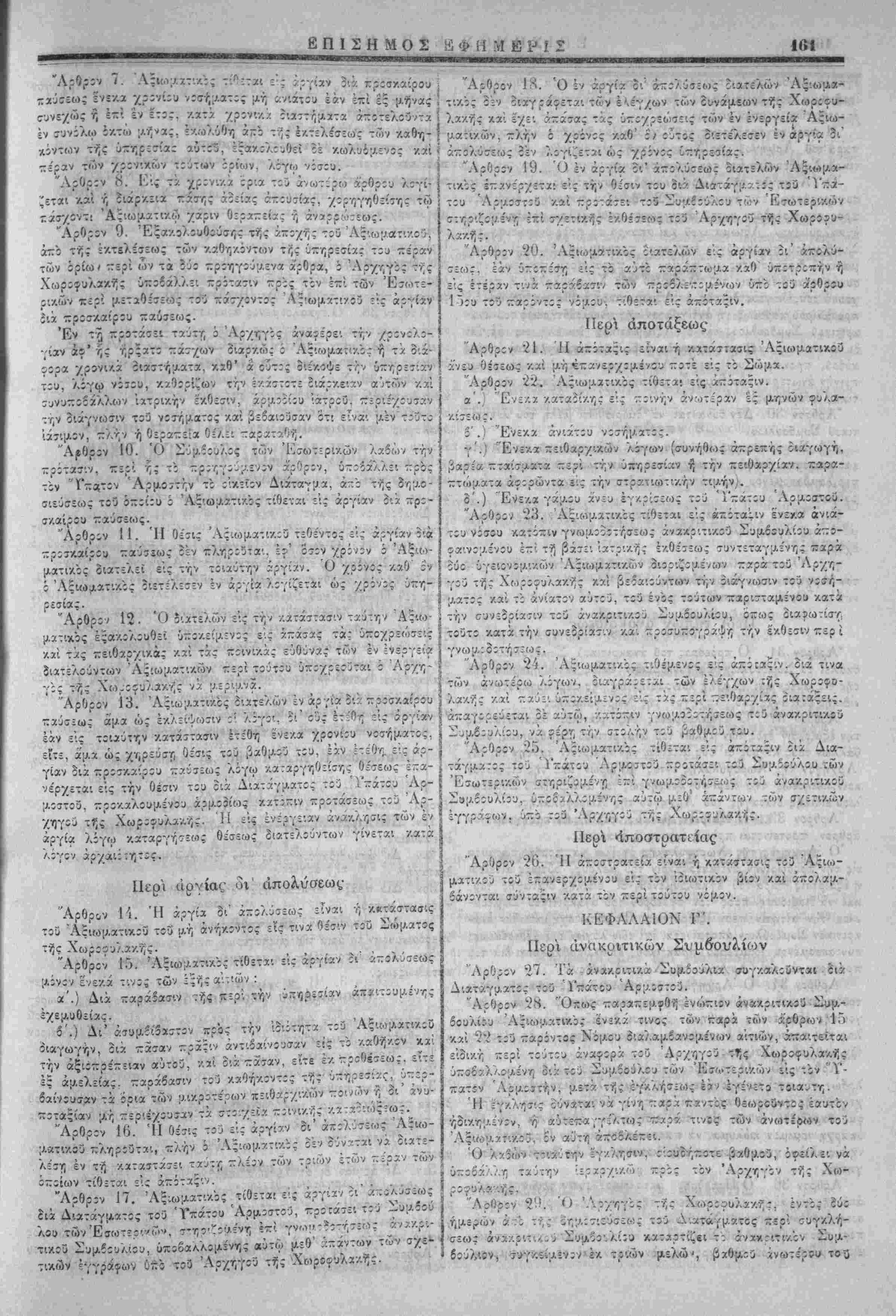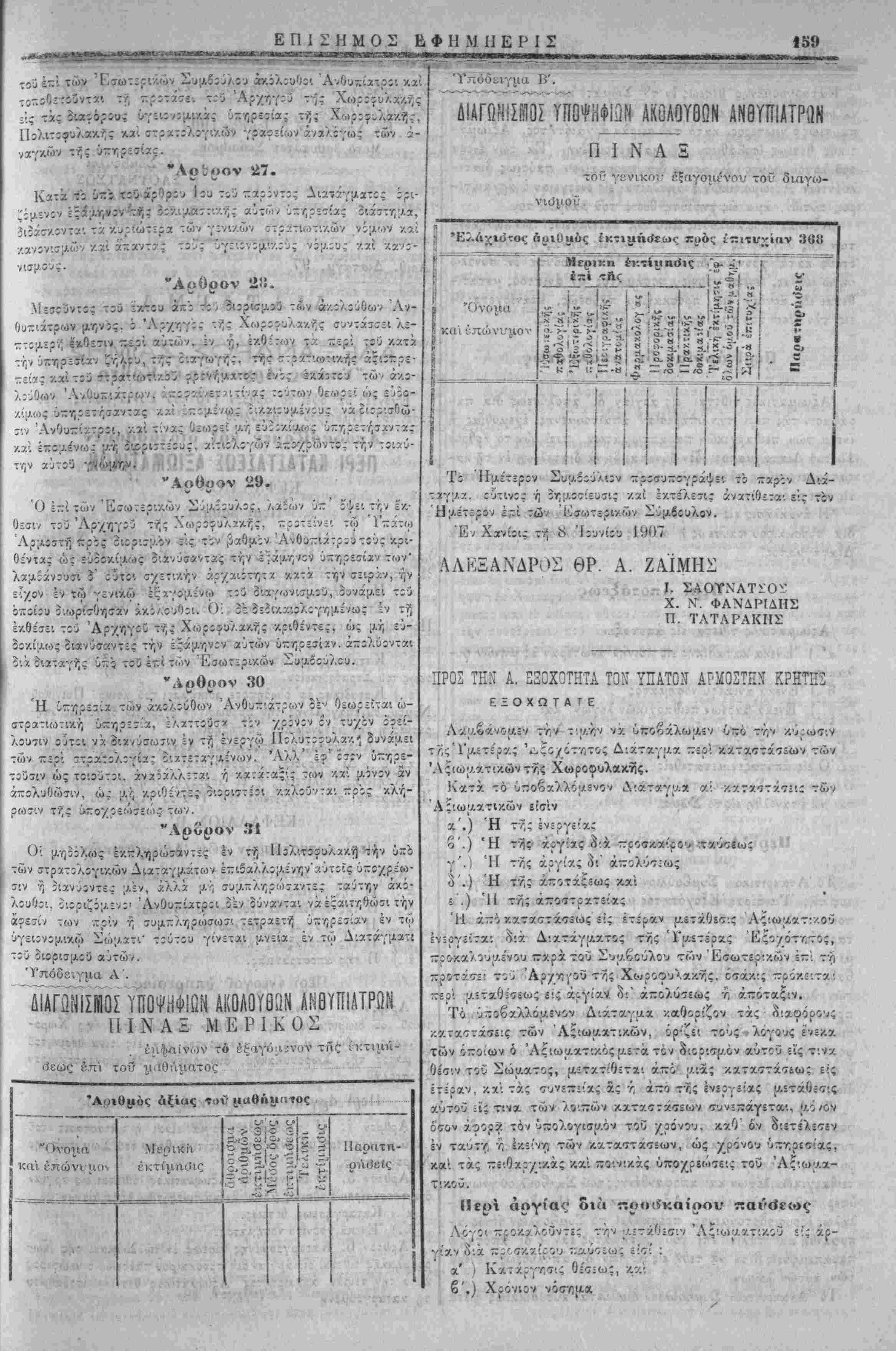 / ί'ύντίς Άςιωματ'.χοι ύκάγοντχι ε"'ς τί<ς τ.ζρι τάξεως καί ύπ;- ταγής γςνι/,άς ϊιατάςεις, έ-ιτηρ:ύ;.·.ενα -αρά τ:ύ Διβιχητ:3 τής Μ;ιραρχίας τ;ύ τόττίυ ένθα ίύτΐι οια;ο.ένουσιν. ύποχρεουμένΐυ ν' άνίΐ^έρτ; εις τϊν Άρχηγΐν τής Χωρΐιυλακής περ'. τί/ς δια- γωγής αυτών έν ;κτάσει κατά την Ιην εκάστου μηνίί. Τι 'ίΐμίτεριν Συμίίύλι;ν ::ρΐσυ~;γράψίΐ τό τζοιρζν, ούτι άθ ί ΙΙ Τι ίΐμίτεριν Συμίίύλι;ν ::ρΐσυ~;γράψίΐ τό τζοιρζν, ούτι ή θΓ,μοΐίίθίΐς ν.αί έ/.τέλ£θ··.ς άνατίθετα'. είς· τ;ν ΙΙμετερον των Έσωτερι/.ών Σΰμβΐϋλ:·/. Έ. Χαλ£-.ντ?ί 8 Ίίυνίί!) 1907 ΑΛΕΕΛΧΔΡΟΣ ΘΡ. Α ΖΑΪΜΙΙΣ νος έι:ί Ι. ΣΛθνΝΑΤΣΟΣ Π. ΤΛΤΑΓΑΚΙΙΣ Χ. Ν. ΦΑΝΔΡΙΛΙΙΣ 98 των οί/.όί'ωι ιτρα.τολόγικων γραφείων έντός ζ^ς υπό τοδ Δια- τάγματος ττ,ς -ροτκλ7,5=ως όριζον.ε'νης προθεσμΐας, άλλως, προσίρχόαίνο: ·?, προαγόμενοι. δ:κάζονται υπό τοΰ στρατο- οικει'ου κχι τιμωροϋντα:, εάν ιλ-λ, άποδε''^ωο·ι -/.ώλυΐΑα ές ανω¬ τέρας βίας. οια ουλα.κΐ'σεως οΰο μτινών υΐί'χρ'. 8νο Ιτών. "Αρθρον 7. Οί κα/.οΰ{ΛΕΌ·. εφρ-δρθ! άπολαμβάνουίΐν άπό τνΐς προσε¬ λεύσεως των τάς διά. ττ,ν πολ'.τοφυλακην ώρ:σ;/.ένας άποζη- ν.ιώσεις ν.χ την δι" αντν;ν κίκανονισμένν;ν μιτθοτροοοδοσίαν. "Αρθρον «. · Ύθ'.στχ(Α5νγ;ς έ/τά/.του άνάγκτς έττιτρέπεται νά τ-Λ,ροίνται είς τας τάςεις της Πολ·.τοφυλχκν;ς έ~ΐ τρείς (Λτίνας οί έξ αυ¬ τής άφυττϊϊρετοϋντίς καί αίταβαίνοντίί εις τ^ν έοεδρείχν άν- ορες, γ.οά ρ.όνον εάν τουτο οΊ.χτχγθ-7, διά Διατάγματος, προ- •Λαλουαενον υπό των Ημέτερον Συαβούλων. Ό χρόνο; ούτος ύύνατχ: νά, παρχταθίί είς 'ίν ίτι τ·ρι'«,ν;νον, δυνάμει όαοι'ου Διχτάγιιατος. "Αρθρον 9. Τα π=ρί συα,ιτλτ,ρώσεως τίς Πολιτοου'λακης είς την δύνα¬ μιν, ίίς ην χΰ'άνότχ! έν ταίς προβλίπομέναίς υπό των ■—ρο- ηγουμίνων άρθρων περιτττώσει:, /.ανονίζοντ*: [λέχρις ού έκδο- θώιΐιν είδ'.κοί νόι/.οι δια Διαταγαάτων, εκδιδομε'νων υπό τους έν τω ανωτέρω ά'ρθρω δια'λαα.βανοι/.Ινους ό'ρους, αύςα- νομένης της δινά;ο.5ωςτών τε Ά$!ωματικων καίΎπαζι&)«.ατ!- κ,ών αναλόγως των άνχγκών. Τό Ημέτερον ΣυΐΛοούλιον προουπογράψει τό παρόν Δ'.ά- Τ3·γ;/3ί, ούτινος τ, δτιΐΛ0(7ί2υ7ΐς ι% έκτίλίτις άνατίθίτκι &!ς τον Ημέτερον επι των Έσωτ£ρ!κ.ών Σύα Έν Χαλέττα τ7, 8 Ιούνιον 1907! ■Ίί ■ ν/-» Π Α Τ Α Γ Μ Α ' ΑΛΕ.ΞΞΑΝΔΡΟ-: ΖΑΪΜΗΣ "Υπατος Άρ«.ιο<Ιττ»ς έν Κ«)··τη "Εχοντες ύτΐ' δψίί τό άρθρον ] 16 τοϋ Συντάγι/.ατ&ς, προ- Τ7σ:·. τού ΊΙιχετέρου Συ;ο.βουλίου. Αποφασίζομεν και διατάσσομεν : ΠΕΡΙ ΕΦΕΔΡΕΙΑΣ ΤΗΣ ΠΟΑΙΤΟΦΥΑΑΚΗΣ "Αοθοον 1. Ή Ιοεδρεία τνΐς Πολ'.τοουλακης ΤΓροώριτται είς την αΰξΥ," τιν τής όυνάαίως των (Τ/'η^.χτΐίΐθντϊομΙνων ούο ταγμάτων τής ένεργοϋ ΙΙολιτοφυλα,κνΐς. "Αρθρον 2. Ή έφεδρείχ κκλίίτα: υπό τα οπλα δι' ύπτ,ρεσίαν -ρος ϊκ- ~λν)οω7ΐν τοο —ΐοοριΐϊΐΑθ8 χύτης η όι' άσγ.τ,ΐϊί'.ί. "Αρθρον 3. Ο; αποτελούντες την έφϊδρείαν άνόρες καλοθνται υπο τα οπλα διά μιας '/) οΊχοΌνι/.ώς. αναλόγως της ύο·.στα|Αε'ν·/ις άνάγ/.τ,ς /.ατ' αΰςουσαν τ,λΐκίαν, γενοιχέντ,ς άρχϊίς *πο τν;ς [Λ'.κροτε'ρας */; άφ' οίχσ-δτίποτί ήλικίας, οττως αί π£ρ:<7τάο·εις β ΑΛΕΞΑΝΔΡΟΝ ΘΡ. Α. ΖΑΪΜΗΣ Ι. ΣΑΟΤΝΑΤΣΟΣ ,Χ. Ν. ΦΑΝΔΡΙΔΗΣ ΪΤ. ΤΑΤΑΡΑΚΗΣ Αρθρον 4. Αί χα-ΛΥ,σας τής Ιοεδρίίας διαρκοΰσ'. μ=/_ρ'. τεισαράκοντοι •ψερών. "Αρθρον 5. Ή έφόδρεία καλείται πρός άτκητε'.ς κχτΐτοί, δύνανται δί νά α,ότίχωσι των άσκήσ£ων τούτων /.αί ίί χ.ατα τό περί στρατολογίας Διάταγμα όπωςιδηττοτί άπαλλαγε'ντες. "Αρθρον 6. Καλούι/.ενο: οί ΪΏίδρο: οφείλουσι νά. προ<τέλθωτιν ενώπιον • Αριθ. Διατάγ. 1093 , - : ΔΙΑΤΑΓΜΑ Ι ΑΛΕΞΞΑΝΔΡΟΣ ΖΑΪΜΗ_: ! "Υ—ατος 'Αριιοο*της έν Κρήτη "Ένοντίς ύπ" ό'ψε: τό άρθρον 3 έδ- Η'. τοο ύπ' αριθ. 413 τέλωνειακοθ Νόμου ττροτάσε: τοΰ 'Ηρ-ετε'ρου επί των 