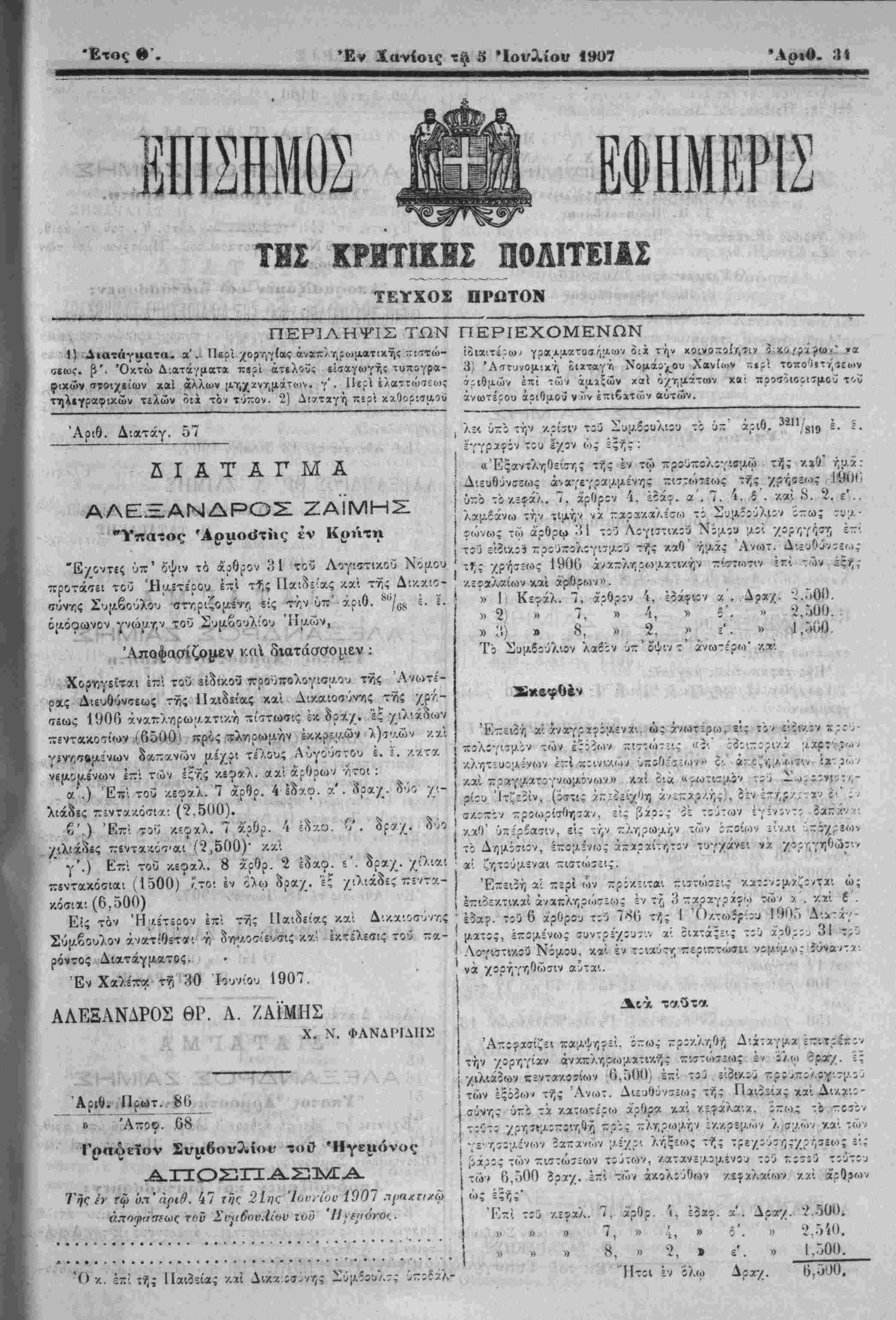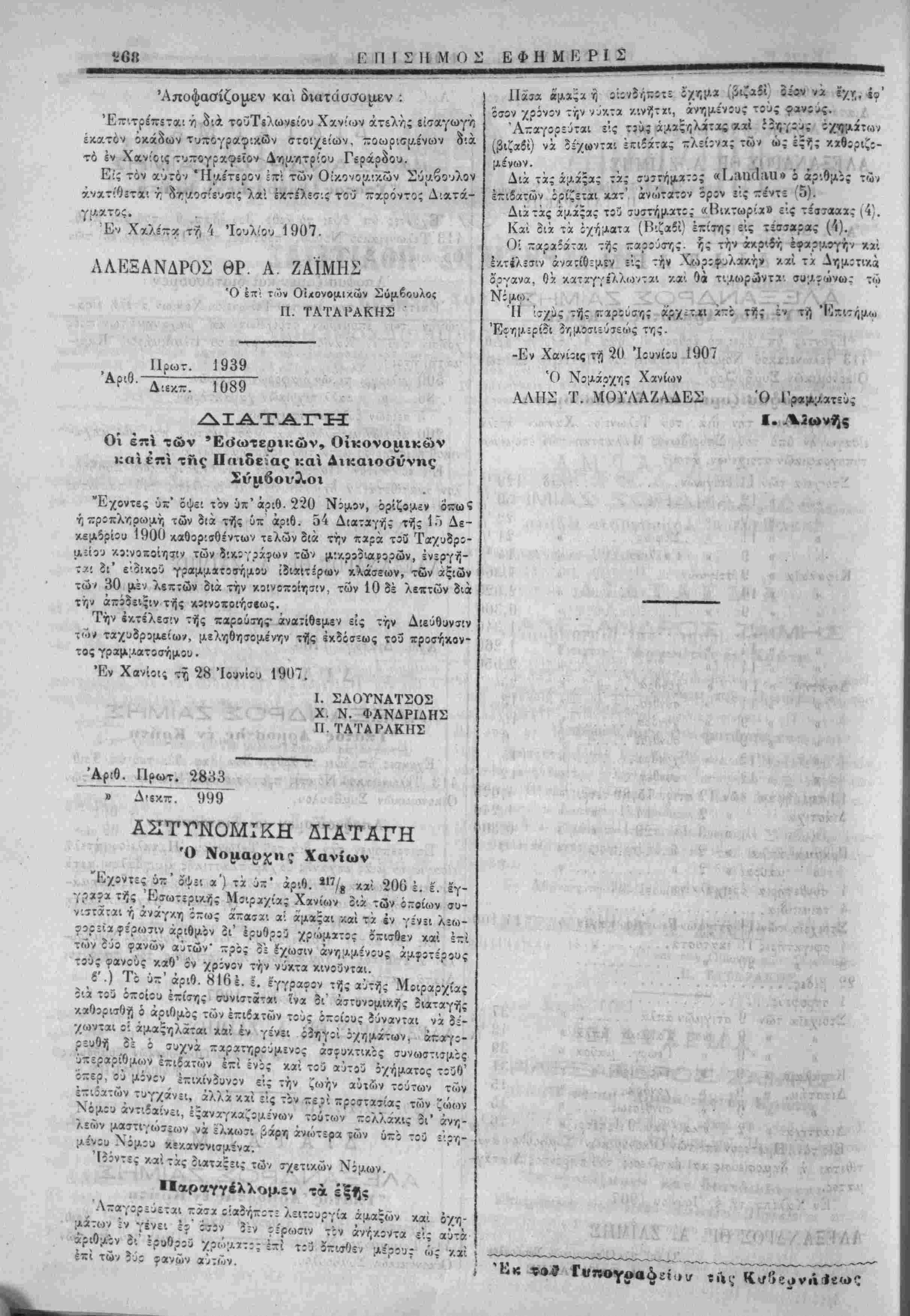 μ^ ζ <^/μί II '·σχΰς τής «ιρίύση; αρχΐτ^ι ϊ~*ϊ τή; ςν τή ΊΟχιτή Έΐημ:ρίδι 3/;μοσΐϊ^τεώς της. -Εν Χανίοις τ·ή 20 Ίουνίου 1907 Ό Νίμάρχης Χανίων ΑΛΠΣ Τ. μΌυΛΑΖΑΑΒ&,,ο^λ/Θ. Λ ι, ,,- Ι. «>