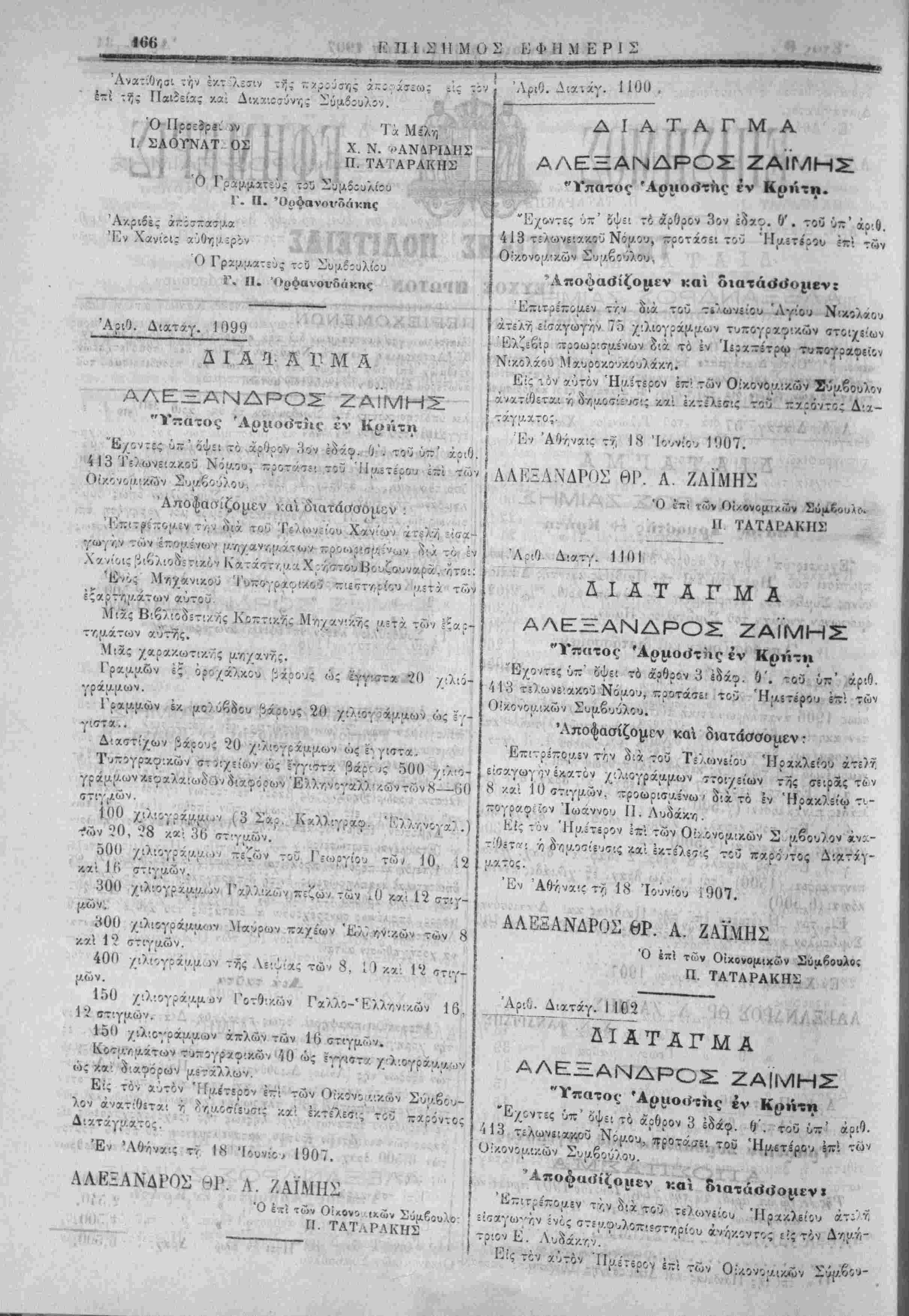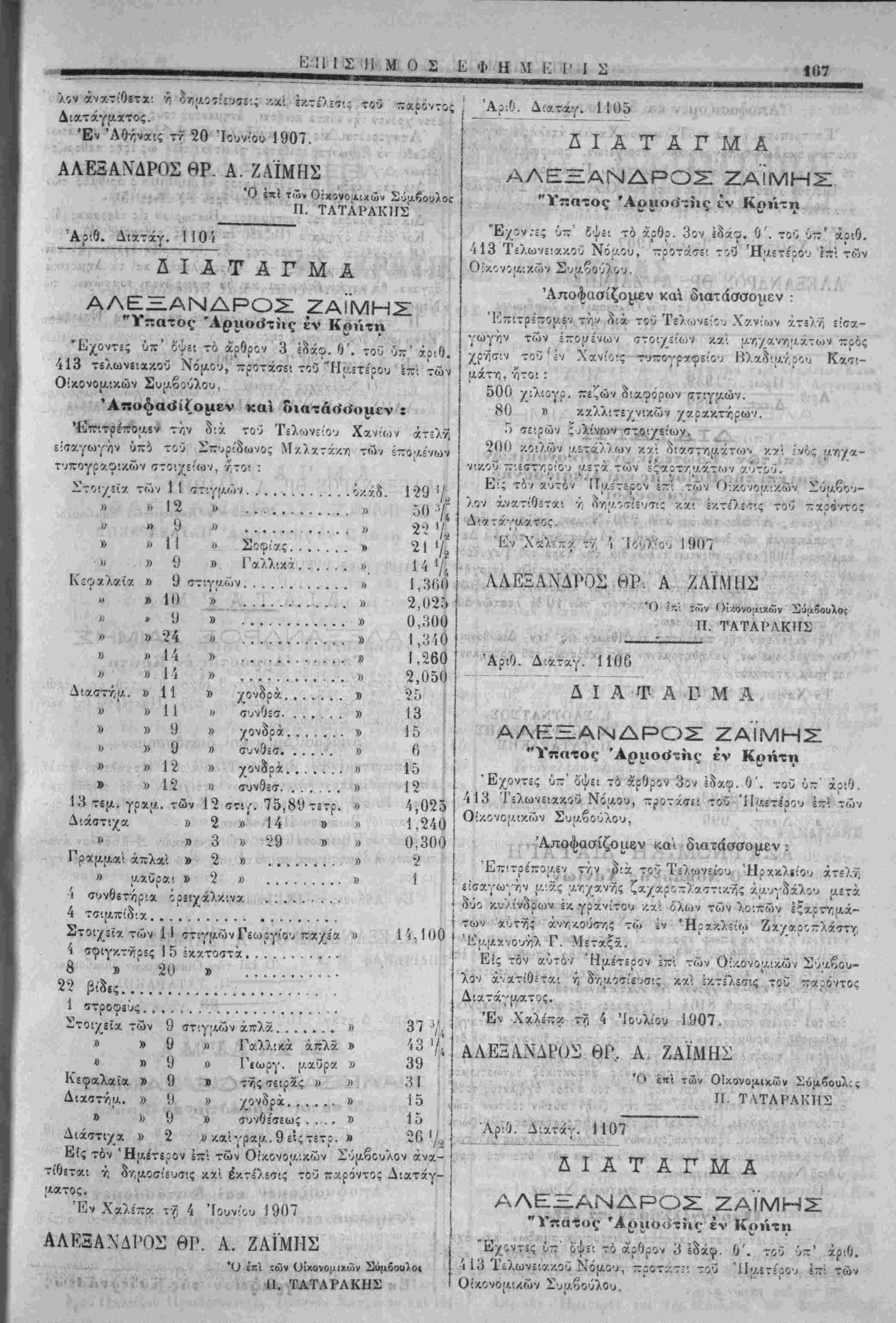 Έπιτρ5πθ{λδν την <)(* τοϋ Τε)ωνε·ί^ Χ^νων 7.Τ5)7, =:σα- γωγήν των ίπο^ένων στοιχίίων κα! υ./,/ανη,Λατον πρός χρήσιν τοϋ' έν Χανίο·ς τνττογραφε'Όυ Βλαδ'7/Λίθυ Κακ7'.- αάτη, 'ίίτθ! : 500 ^ιλιογρ. ττεζών διαφόρων στιγ^/.ών. 80 » ■/.χλλώ Γ) χειρών ςΑίνων σχο 200 κο·7ών ν.ίτ;αΑ}ων κ?ί όιαιτνιαάτων καί ίνος νκον ~'εσττ,ρ'ου αεχα των ες-αρτ^ν.α.των αυτίιυ. Ε'ς τό / χϋτον 'ΓΤΐΑί'τεοον εττ' των Ο'/ονοΐΑ'.κων Σΰαί λον ά.νατιθίται ■/; (νηΐΛθ^ίίυτις κα' Ικτ·ί'7:·7ις τού " ^γ,'Ί Ίουλ'ου 1907 ΑΛΕΞΑΝΔΡΟΣ ΘΡ. Α ΖΑΪΜΗΣ £*:'; των Οί/Μνομιχων ϊάμό' Π. ΤΑΤΑΡΛΚΗΣ Λ -ν ·*■ 4*'ί Αριθ. Δικταγ. χίί06 Δ Ι Α Φ Α Γ· Μ Α ΑΛΗΞΞΑΝΔΡΟΣ ΖΑΪΜΗΣ "Υποτος 'Αριιοιίτης· έν Κρήτη 'Εχοντες (ιτ:' όψει τα άρθρον 3ον Ιδχφ. Ο'. τοί ΰ-' αριθ. 413 Τελωνειακόν Νόαου, προτάσι; τοϋ Ήι/.ετερου ϊζ των Συι/,βουλου, . 'Α>ποφασίζομε.ν καΊ διατάσσομεν :