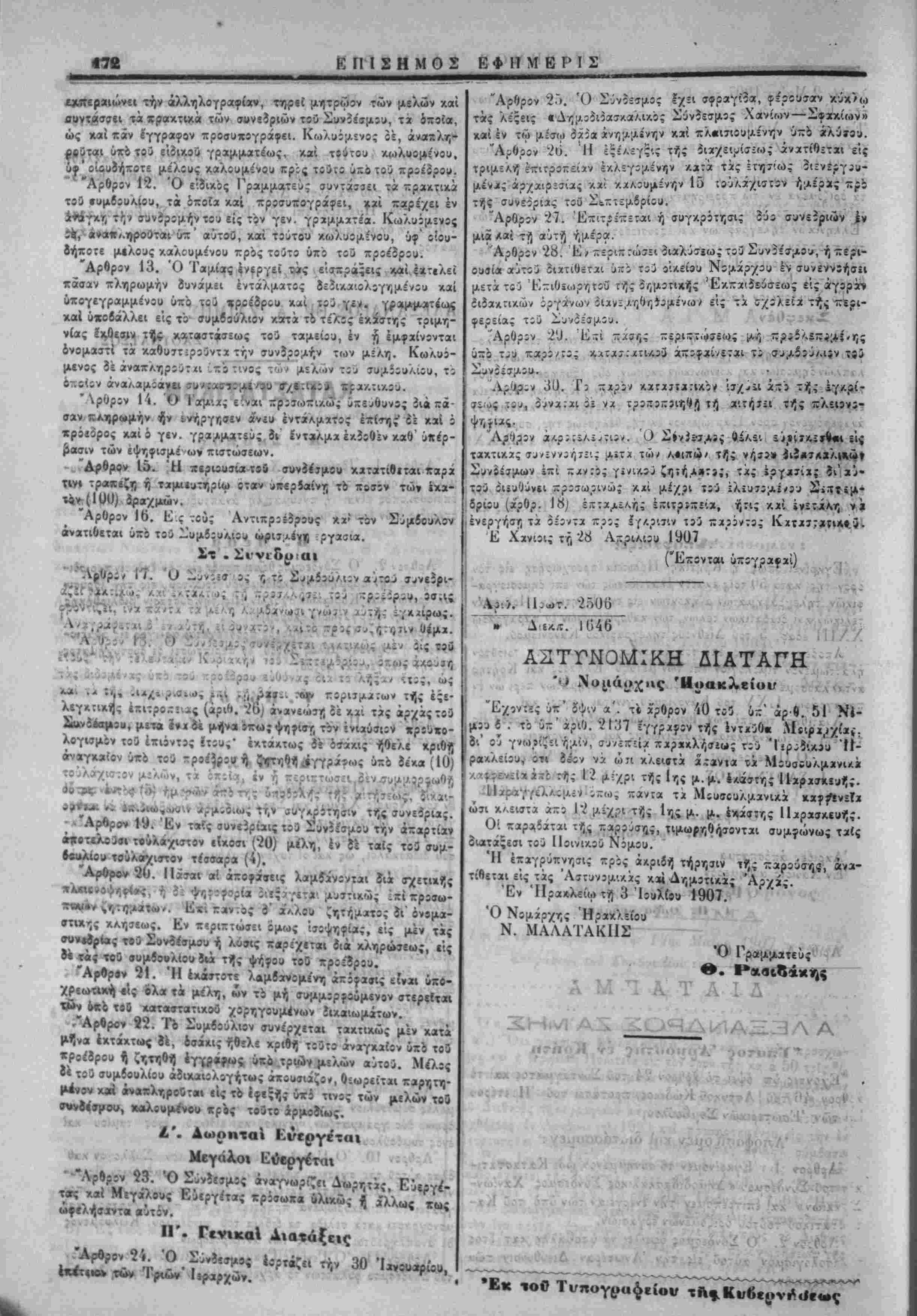 ίμϊ» '-^<ος παντα τα Μουσουλμανικα ώσι κ/,ειστα αζ5 12 μίχρι τής 1η; μ. μ. έχάστης II. Οί παρ^ίάται τ^ παρο^σςς, τιμωρηθήσονται συμφώνως ταίς διατάξεσι τού Ποιναού Νόμου. Ή επαγρυπνήση πρός άλριίή τήρησιν ' τ^ς ιταροΰσηί/ «ι»α- τίθεται είς τάς Αστυνομικάς κ» Δημΐτικάς Άρ/ίς. Έν "Ηρακλείω τί) 3 Ιουλίου 1907. Ό Ν9μίρ·/ης Ηρακλείου Ν. ΜΑΛΑΊΆΚΙΙΣ "Ο Γραμματεύς Θ. Ρασιδάκης ΑΜΊΑ,.ΐ Α-1 /,