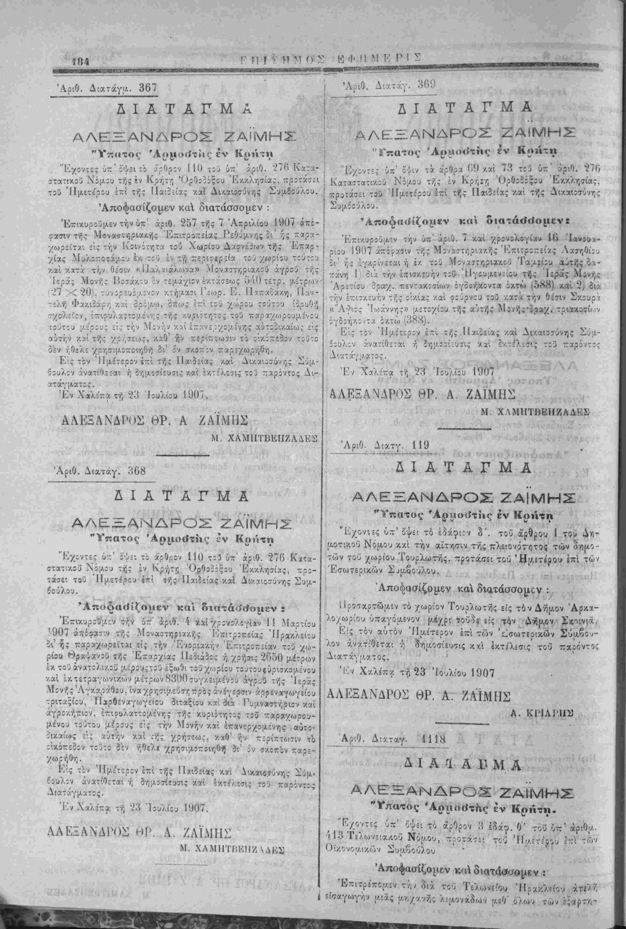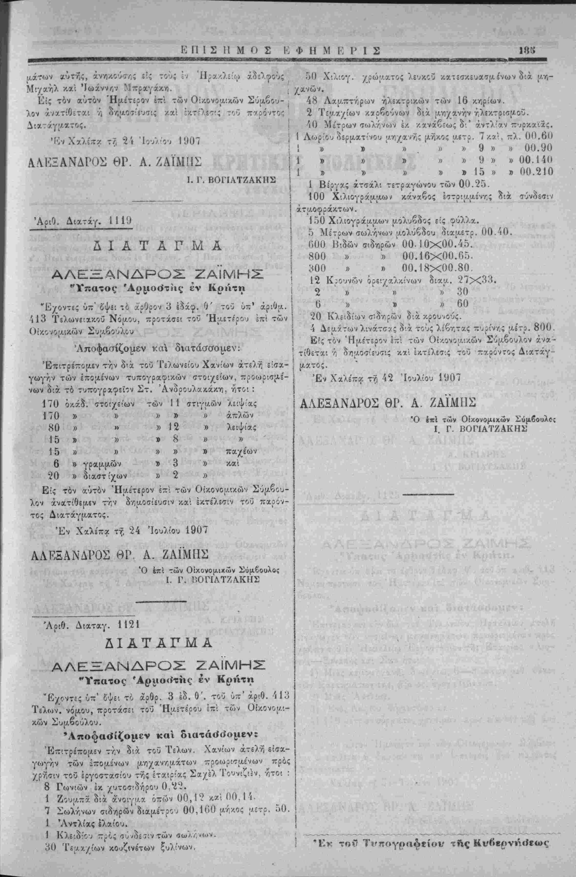 "ΊΓηατος Άρμο<ίτίις· έν Κρήτη Έγοντες ύπ' δψδί ιο αρθρον 3 έ^άφ. Ο' τοο υπ* άριθα. 3 Ν Ή ψ ρρ φ ρ Ί13 Τελωνειακόν Νόυ.ου, προτάσϊ'. τού ΉαετΙρου ΐπι των β Οίκο ^{Λΐκων Συ;ο.βουλου Αποφασίζομεν κα διατάσσομεν: 20 ΚλίΐοΊ'ων σ^δ-ζ-,ρών διά τος Διατάγματος. Έν Χχλέπα ττ, "24 Ιουλίου 1907 ΑΛΕΞΑΝΔΡΟΝ ΘΡ Α. ΖΑΙΜΙ1Σ Ό έττϊ των Ο'ικονομιχών Σύμβουλος Ι. Γ. ΙϊΟΓΙΛΤΖΛΚΙΙΣ ΆριΟ. Διχταγ. 1121 ΔΙΑΤΑΓΜΑ ΑΛΕΞΞΑΝΔΡΟΧ ΖΑΪΜΗΣ "Υπατος 'Αριιο«ίτης έν Κρήτη "Έ^οντίς ύτ' δψει το άρθρ. 3 έδ. Ο'. τοϋ ύπ' άρΌ. 413 Τελων. νόμου, προτάσίΐ τοΰ Ή;ο.5τέρου επί των Ο β Έν ΧχΊίτ.χ τη 42 Ίου>ίου 1907