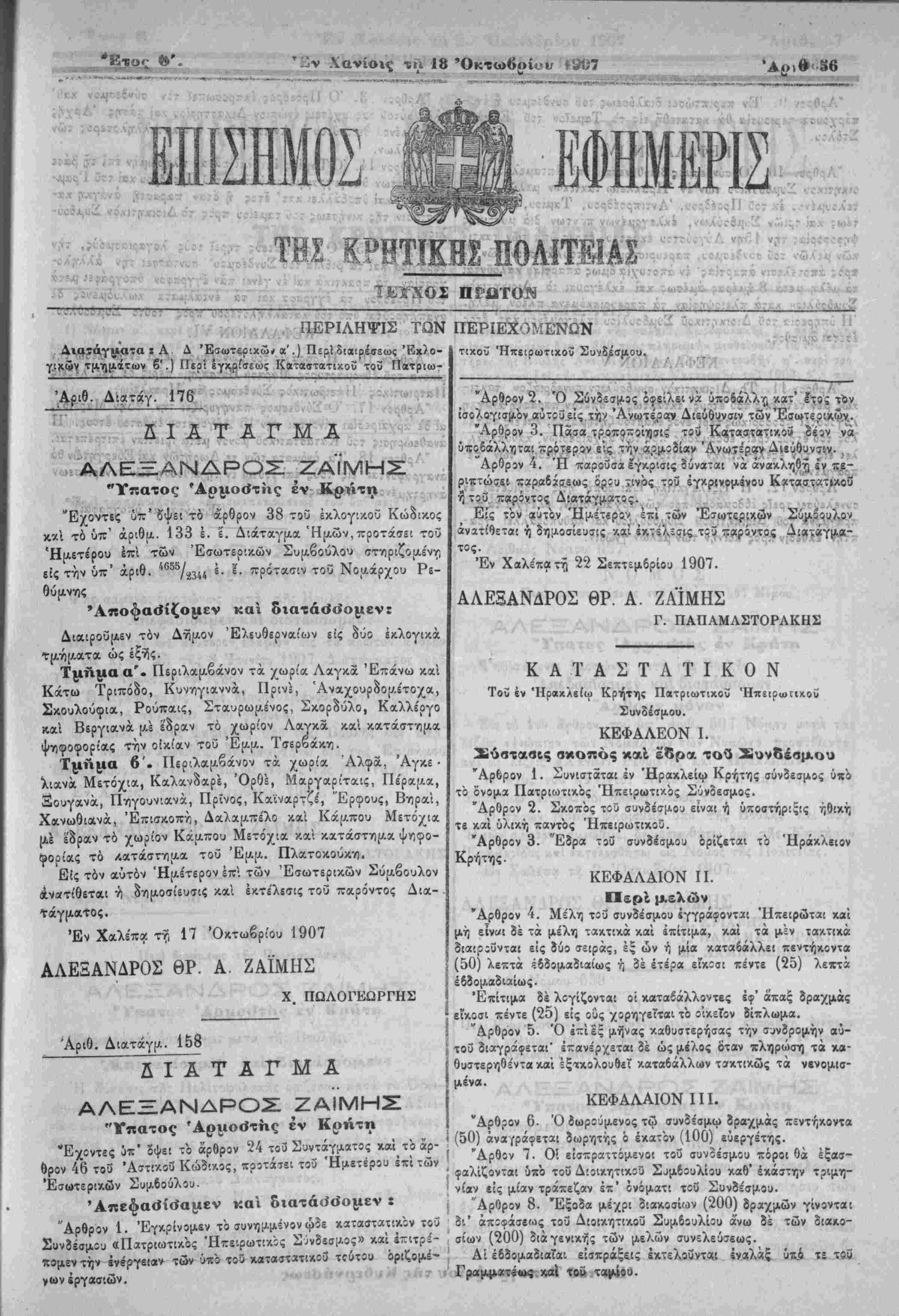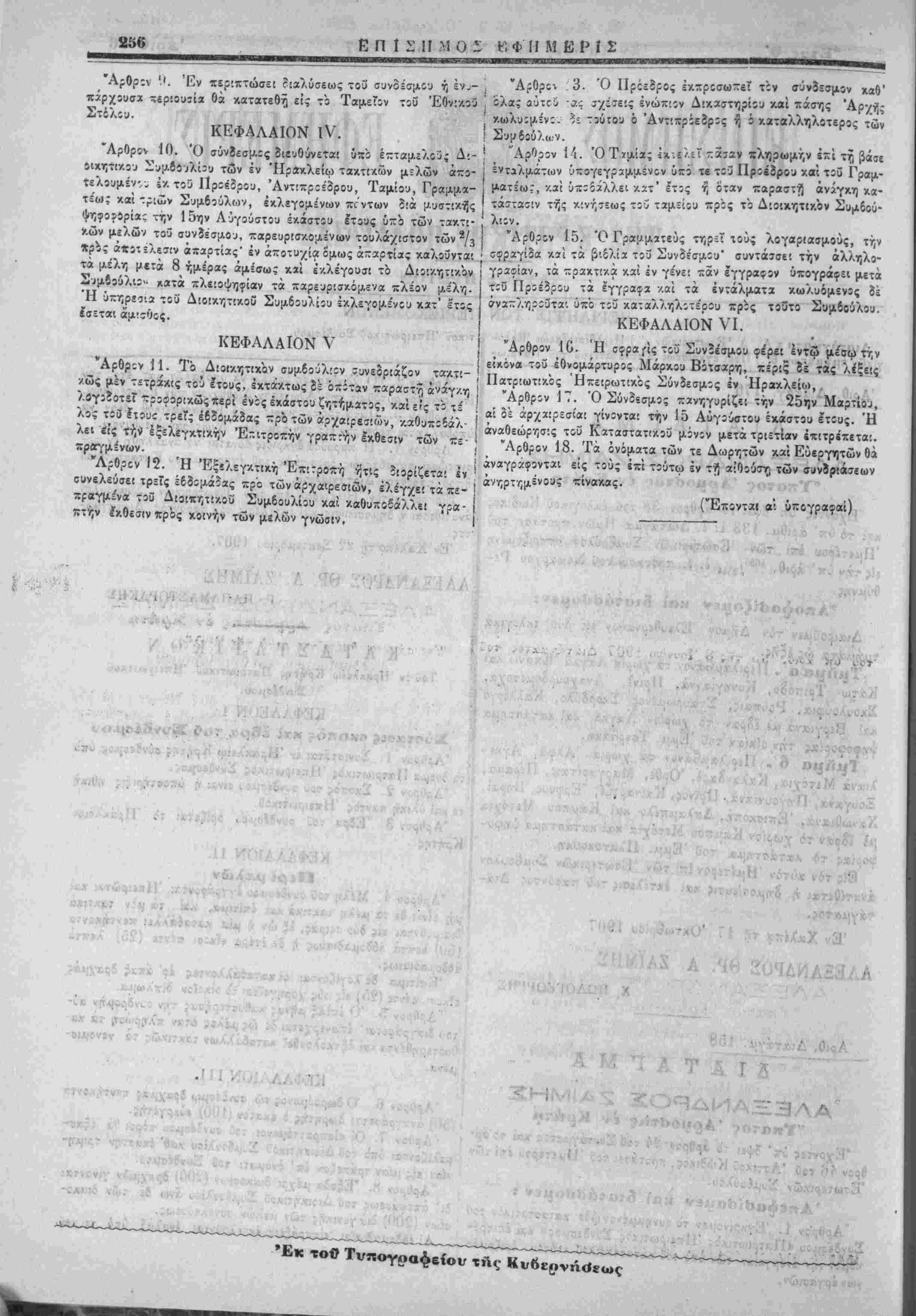 ίικητικ^ Σ^μβοΑίου των έν Ηρακλείω τα<τί-ιων μςλών άπο- ! ^νταλμάτων όπογεγρϊμμενον ΰ-ο τε τί3 Προϊδρο^ -/αί τού Γραμ- Ιελουμεν·, Ι, τ5ύ Πρ^ί5ρ5^, Άντϊπρίεδρου, Ταμίοο, Γραμμα- [ ματέω:, /αί όπ:δαλλει /.ατ' Ιτ:ς ή' οταν ΖΛραα:^ όνΐγκη κα- τίως και -ριών Σομδούλω;, έκλεγομ-νων π ντων 2'ά μοστικής τάϊτασΐν τζς χ'νξτεως τ;: ταμειου πρός τ'ο Δ'.οικητι/.ον Συμδού- >ηφθ55ρια: -ην 1 5ην Αύγούστοο εκάστου Ιτους ΰ-ό των τακτ:- | λι:ν.
