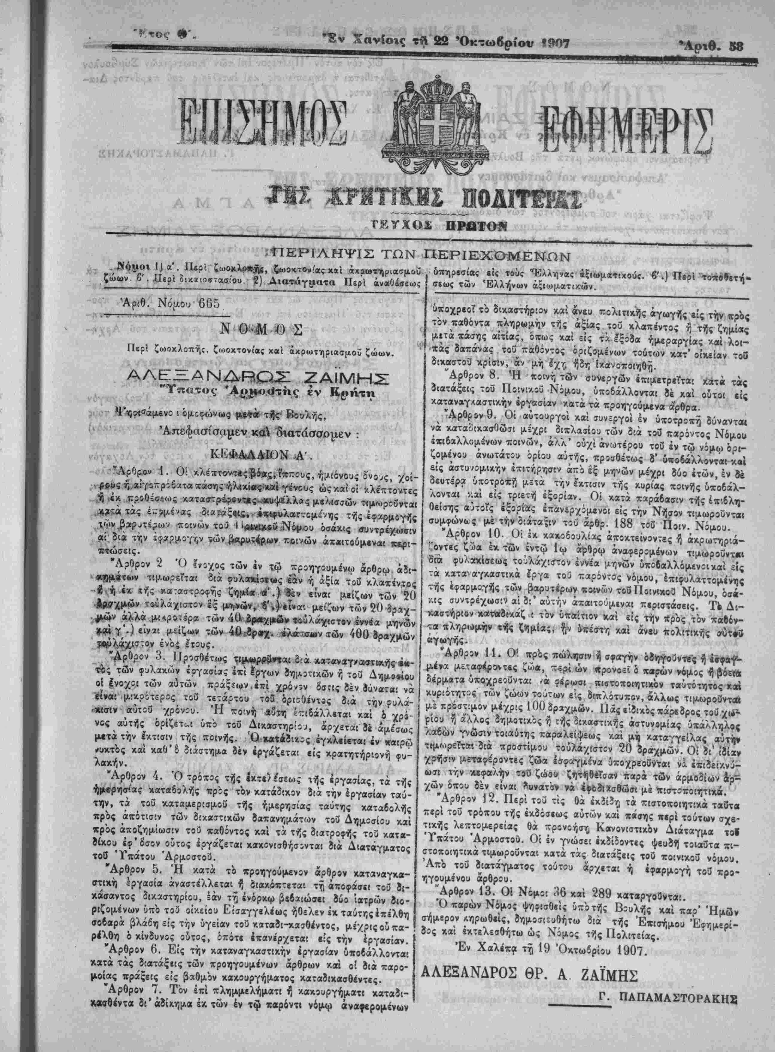 Ν 0·<Μ Ό^_ Περ! ζιοοχλοπήο, ζΐοοχτονίας χαΐ άχρωτηριασμθΰ ζώων. ■"Ύπατος· 'Α^^χΙττΐί,' έν Κρήτη ι ομοφώνως ί«·*«· τής- Βουλής, 'Αηεφασίσαμεν κα'ν "διατάσσομεν : '' έ 1. Οί κλέπτν»νΓ<ς^4ϊΐς,ι'πτΓθυς, ήμιόνθυς ?νο^ς, χοί- ^,αίγιχρόβατα πάσης Ϋ,λ<κί«ς·κέχί γενους ώς καί οί νιλίπτον-τες ^ ι«κ προθίΰεως κατιχσΐρ&^βνΐΐιςη'ίΐνψ^λλας μβ)«ι«σ(5ν ΤΊμωροΰνται ,&&«, τάς έ^?μέ^ας 3ιατ«ξ»Λς,,#*»(ρι>λα.Γ·-ομένης τής έφαρμογής