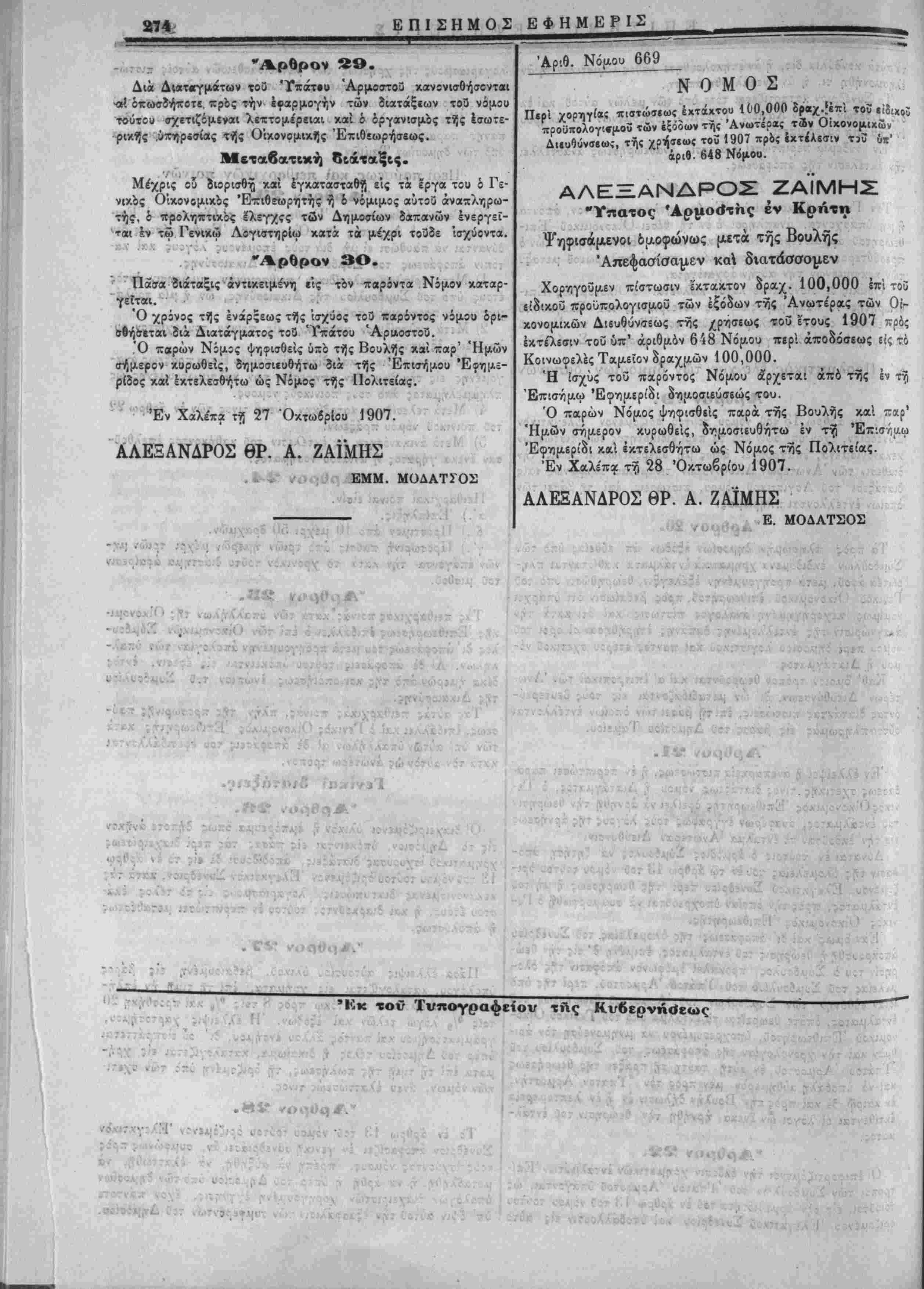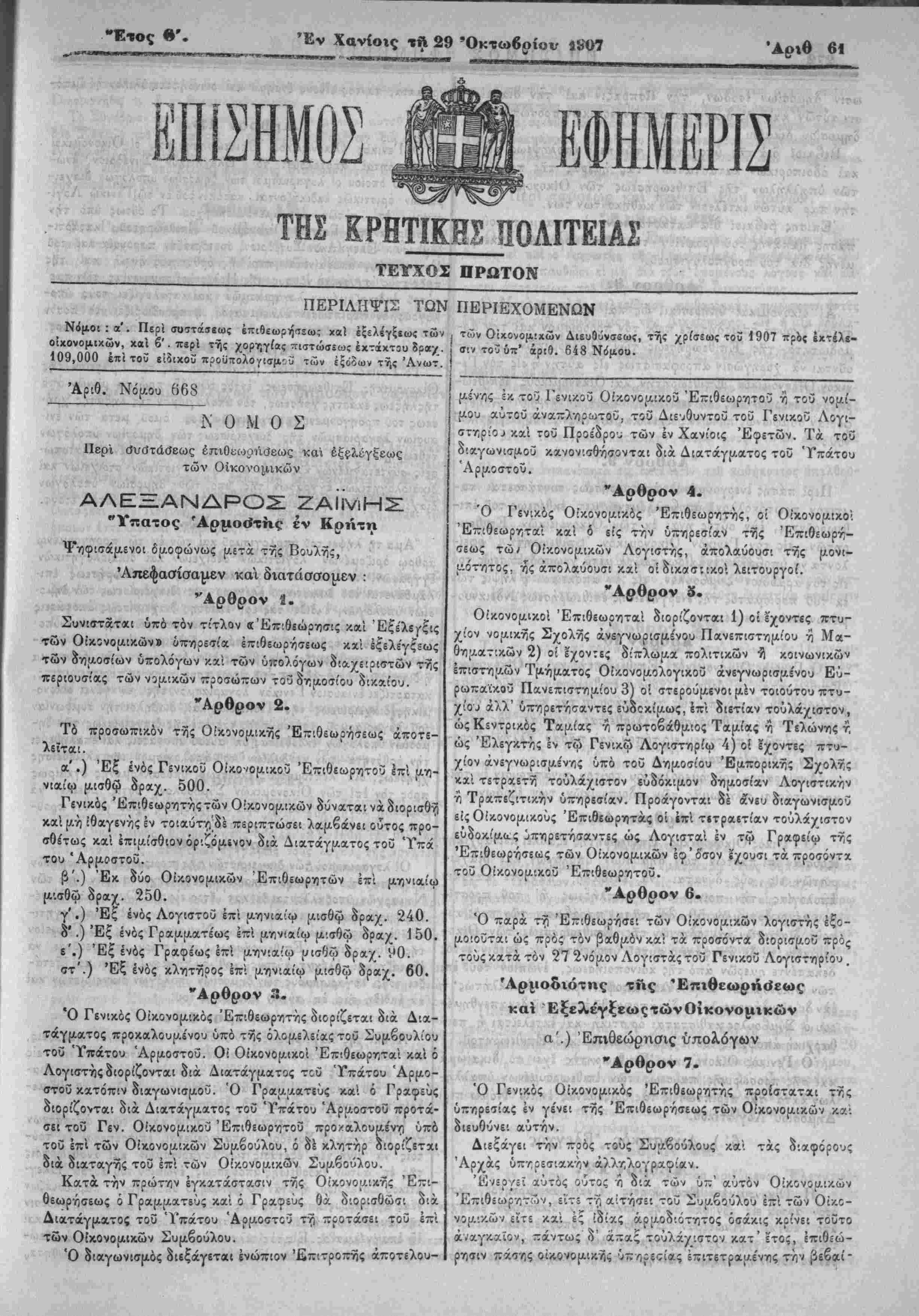 109,000 επί τοϋ είδιχοϋ προϋπολογισμώ των Ιξο2ω< τής Ανωτ. Αριθ. Νόμου 668 ι Ο Μ Ο Σ Πβρί όνότάΰεως έπι0ί.ίΛηή<3εως και έξελέγξεως των ΟΙκονομικών ΑΛΕΞ1ΑΝΔΡΟΣ ΖΑΐίνιΗΣ "1*πατος 'Αρμοότης έν Κρήτη Ψηφισάμενοι ομοφώνως μετά. της Βουλης, $' *'*' Άπεφα,σίσαμεν καΐ διατάσσομεν ^.^©χ&γν1 "Αρθρον 1. Συνισταται υπό τόν τίτλον «Επιθεώρησις καί Έξε'λεγ'ςις ρ των Οίκονομικών» όπηρεσία επιθεωρήσεως καί δξγζς των δηαοιΐίων ύπολόγων καί των ΰ~ο>όγων δια^ειριστών της