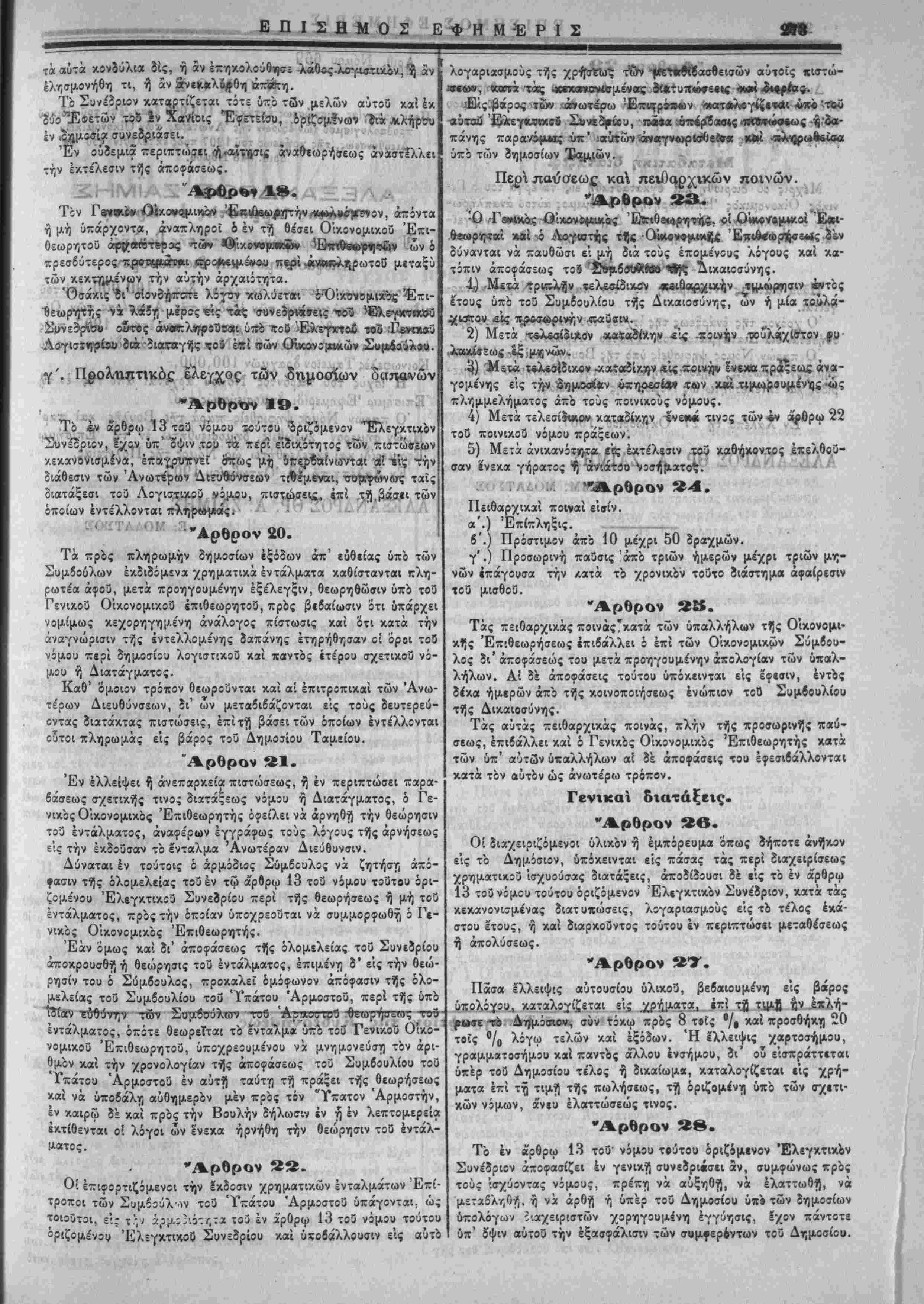 4) Μετά τελεσί$«κ*Γ καχαδίκ^ν ΐνε»»« τινος τφν<^* «θρω 22 τοΰ ποινικοΰ νόμου πράςεων. 5) Μετά όνικανόϊ»ί« ί'κ έχτέλίσιν το3 καθ^κοντος Ιπελθοΰ- σαν ϊνεκα γήρατος ^ ΐχνΐατσβ Νοσήρ,ατοξ. Πειθαρχικαί ποιναί ί'ισίν. α'.) Έπίζληξις. ________ δ'.) Πρόστιμον άπό 10 μέχρι 50 δραχμών. γ'.) Προσωρινή παΰσις 'άπό τριών ημερών μέχρι τριών μη- νών έπάγουσα την Αατά τό χρονικόν τουτο ίιάστημα άφαίρισιν τοΰ μισθοΰ. Τάς πειθαρχικάς ποινάςΓκατά των ΰπαλλήλων τ1)ς Οίκονομι- κ1«ς "Επιθεωρήσεως επιβάλλει ό επί των Οικονομικήν Σύμβου- λος ίι' αποφάσεως τού μετά προηγουμένην απολογίαν των ύπαλ- λήλων. Αί δέ άποφάσεις τούτου ϋπόκεινται εις εφεσιν, έντός ϊέκα ημερών άπό τής κοινοποιήσεως ενώπιον τοθ Συμβουλιον τϊ)ς Δικαιοσύνης. Τάς αύτάς πειθαρχικάς ποινάς, πλήν τής προσωρινάς παύ¬ σεως, επιβάλλει καί ό Γενικός Οίκονομικός Έπιθεωρητής κατά των ύπ' αυτών ύπαλλήλων αί δέ άποφάσεις τού έφεσιδάλλονται κατά τόν αυτόν ώς ανωτέρω τρόπον. διατάξεις. '. Λ^ /^ ' "Αρθρον Οί ϊιαχειριζόμενοι υλικόν ή έμπόρευμα όπως ϊήποτε άνήκον εις τό Δημόσιον, ύπόκεινται είς πάσας τάς «ερί διαχειρίσεως χρηματικοΰ Ίσχυούσας διατάξεις, άποϊίδουσι δέ είς τό έν αρθρω 13 τού νόμου τούτου όριζόμενον Έλβγκτικόν Συνέδριον, κατά τάς κεκανονισμένας ϊιατν*ώσεις, λογαριασμοΰς είς το τέλος εκά¬ στου έ'τους, ή καί διαρκοΰντος τούτου έν περιπτώσει μεταθέσεως ή απολύσεως. "Αρθρον »Τ. Πάσα έλλειψις αΰτονσίου ύλικοΰ, βεδαιουμένη είς βάρος ύπολόγου, καταλογί^εται ε'15 ^ΐματα, επί τί τψ41 ϊν έιΐλή- ^Ι4ϊχ το Δηψ.όοχον, σίιν ΐόκω πρός 8 τ»Γς % καί προσθήκη 20 τοίς °/0 λόγω τελών καί έξόδων. Ή Ιλλειψις χαρτοσήμον, γραμματοσήμον καί παντός ά7>λου ένσήμου, δι* ου ε'ισπράττεται