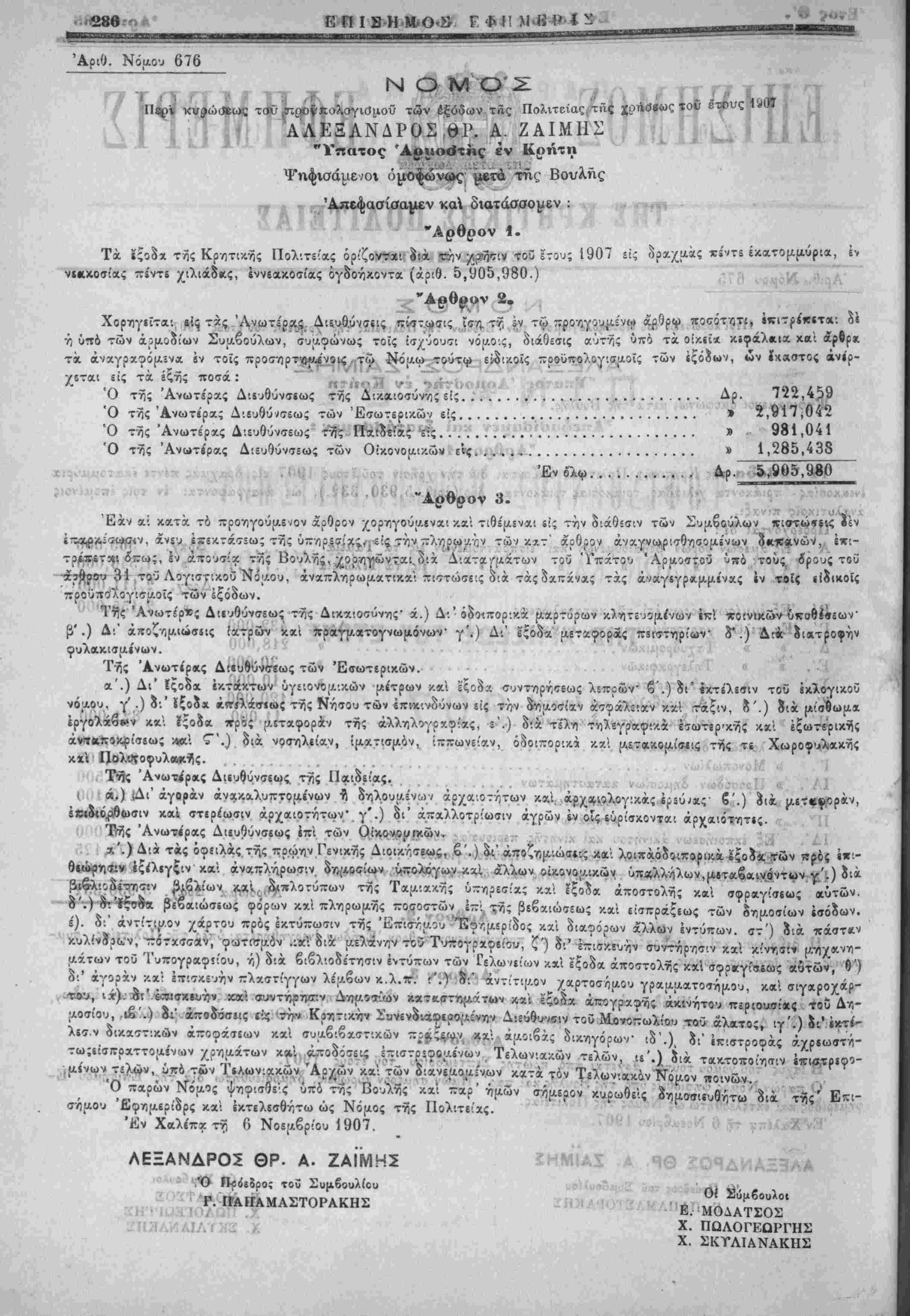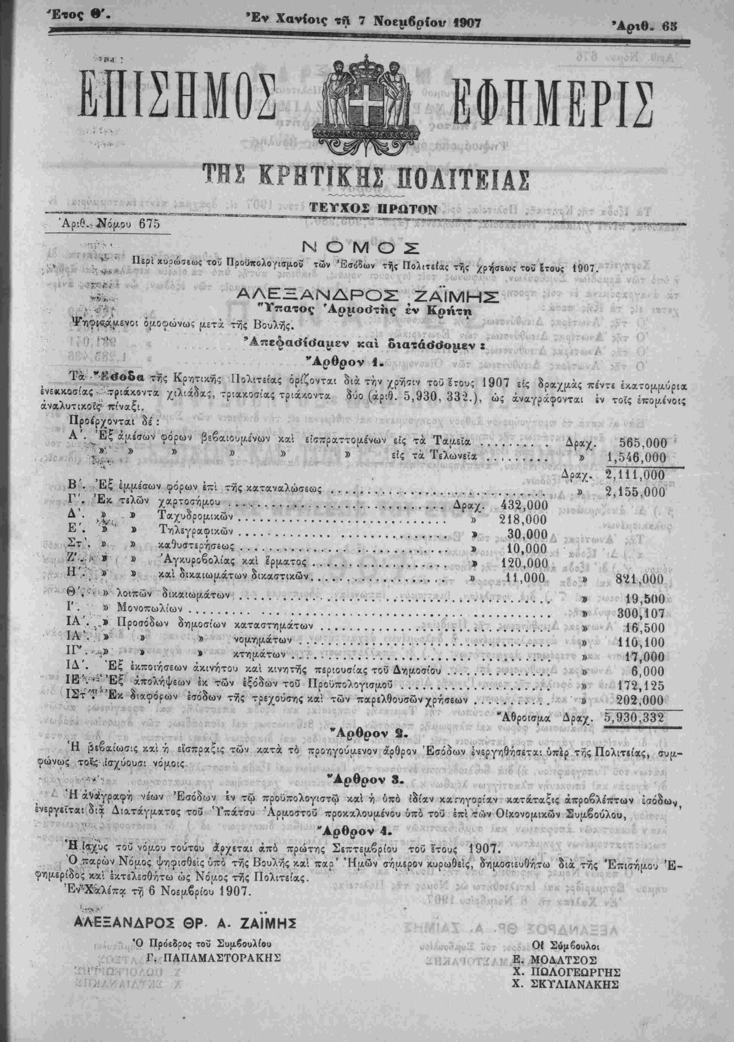 ■» *< ΑΛΕΞΑΝΔΡΟΣ,βΡ. Α. ΖΑΙΜΗΣ "■'" Α' Τπατος Ά§ιι»«3της έν Κρήτη Ψηφισάμε;οι όμΌ^ών^ς "μβτά'τής Βουλης — . » 'Δ-εφασίσα|Αεν κα διατάσσομεν : —. ,ψ * "Αρθρον 1. Τα ϊςοδχ τίς Κρ/ιτιχης Πολιτε'ας ό>'ζονΐ»Ρ Ιιά «ήν /,^ιν τού ετοος 1907 εί; δραχμάς «ίντι ί»»τομρρι»,^