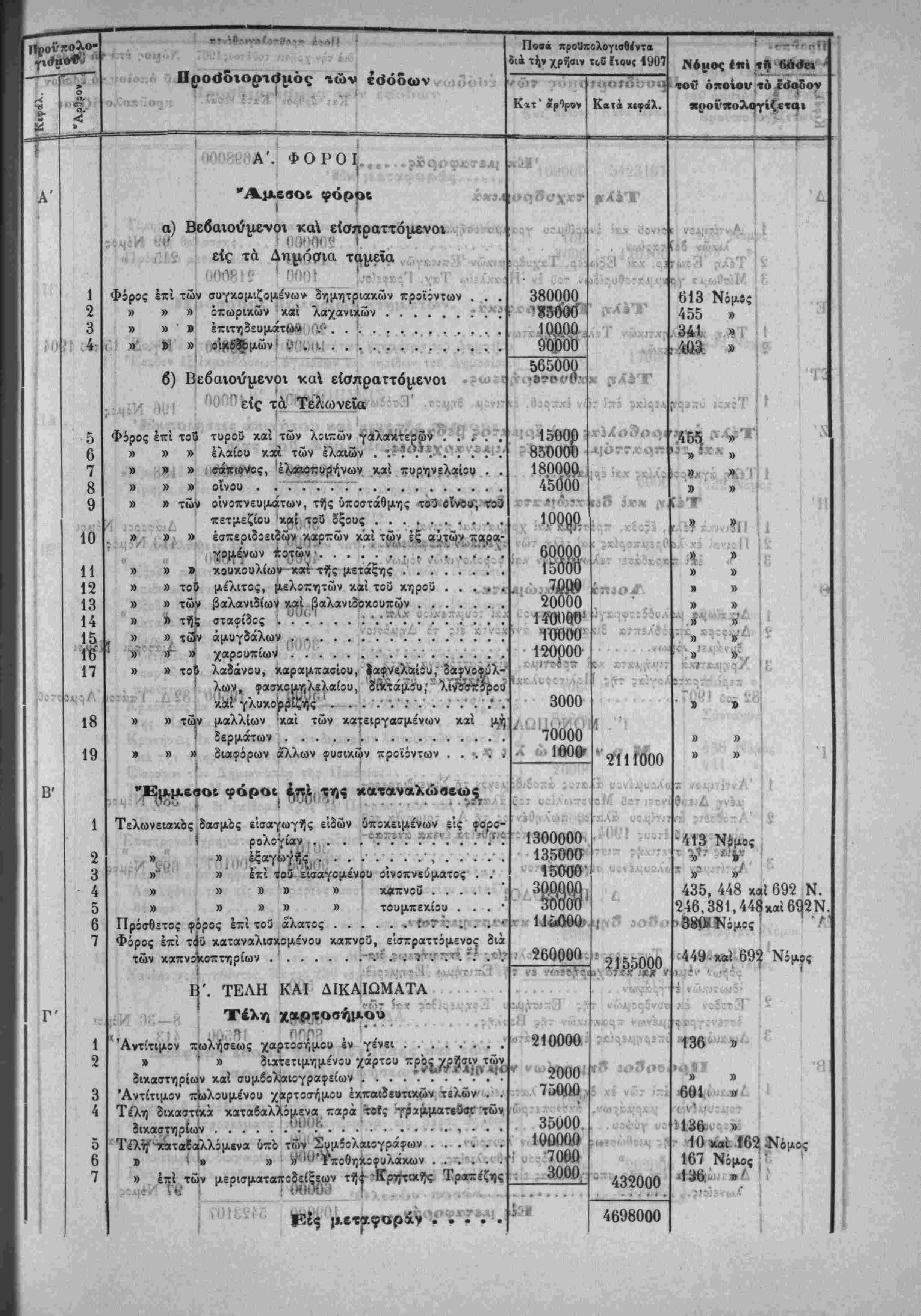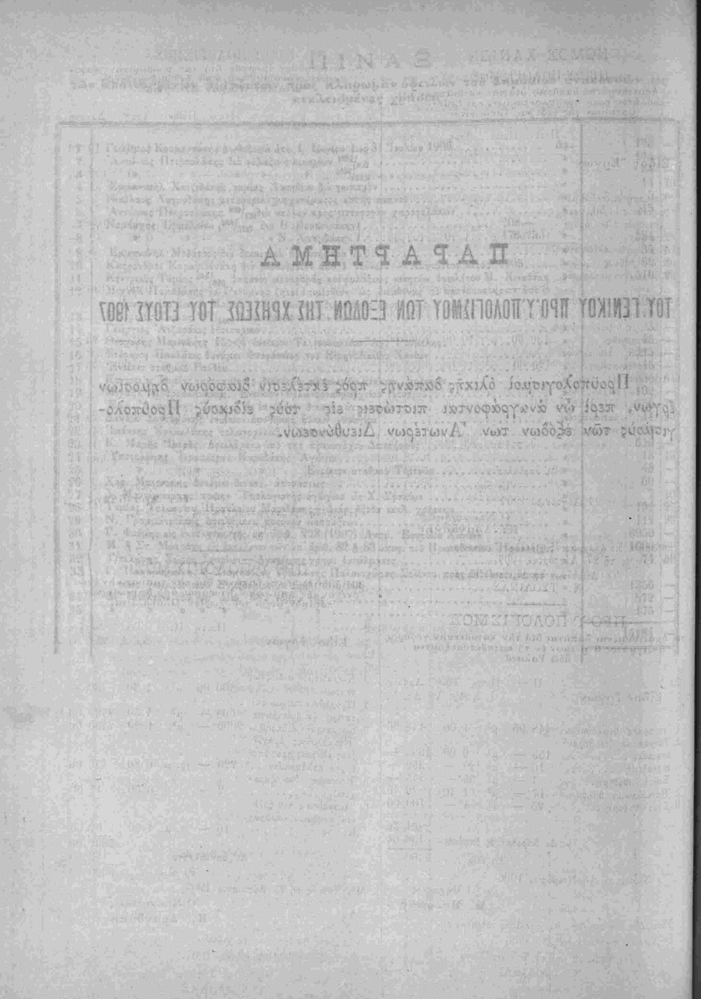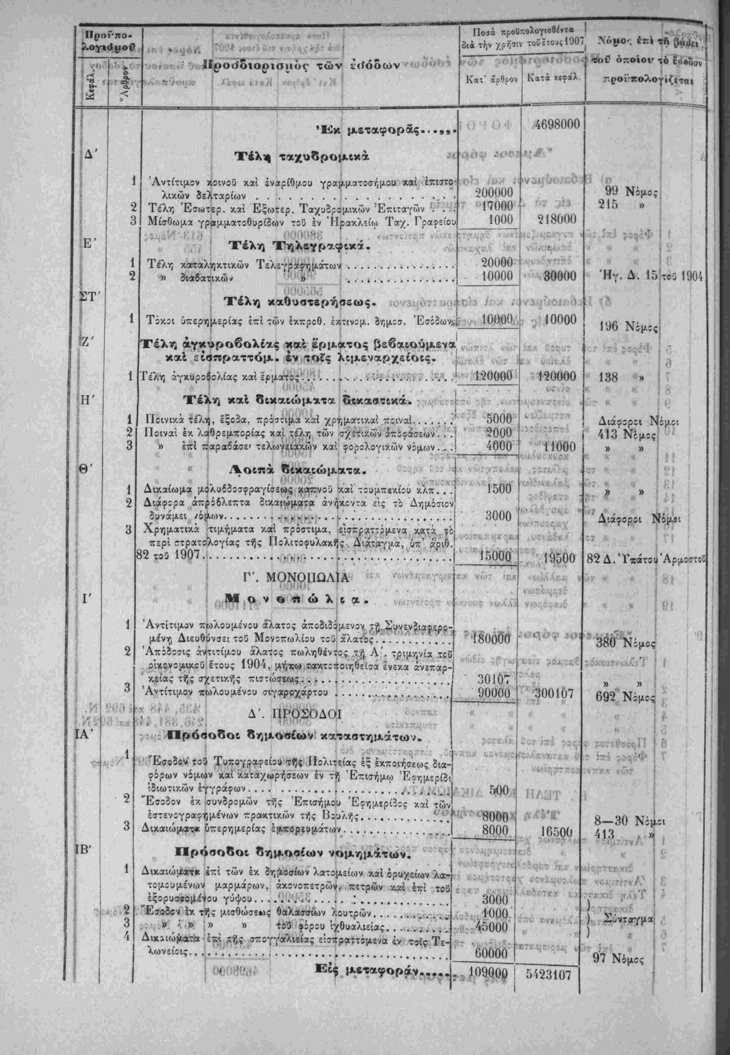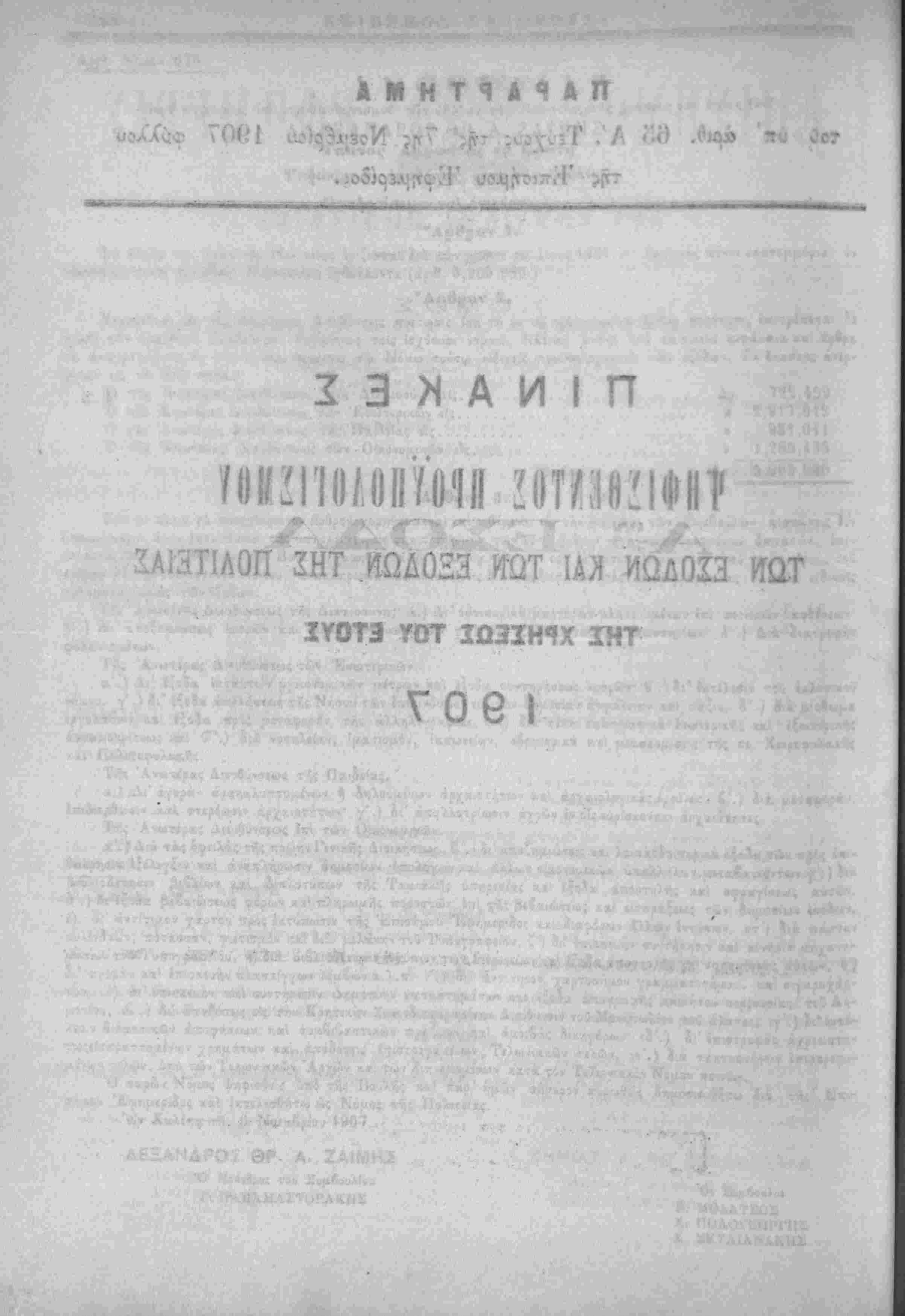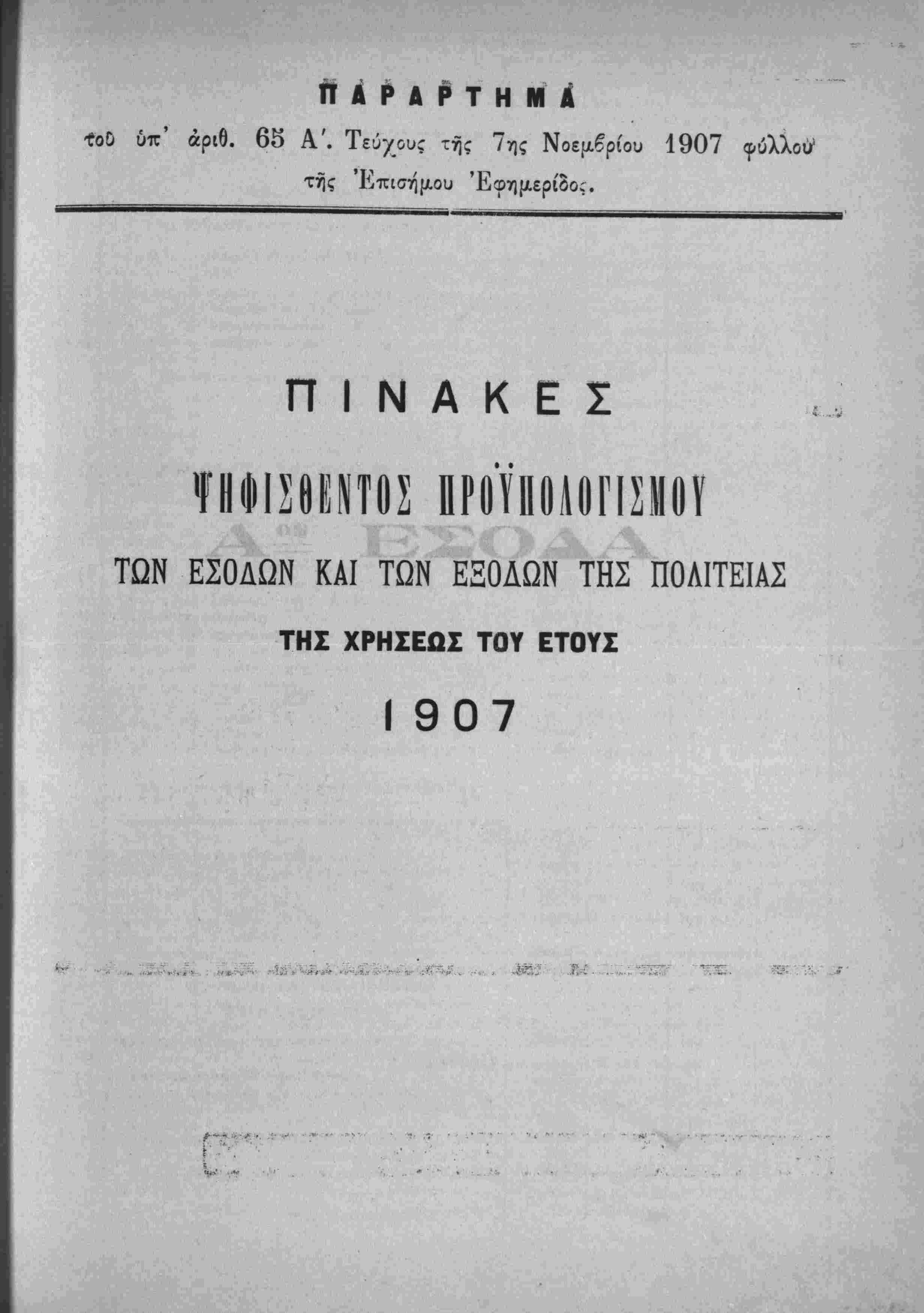 Λ»'~ Ηερί χυίώσεως τού Προΰπολο/ισμοΰ των Έσόδων τής Πολιτείας τ-ής /ρήσεω; τοΰ Ιτους 19Ο7.ί'Τ^·νιν'>"