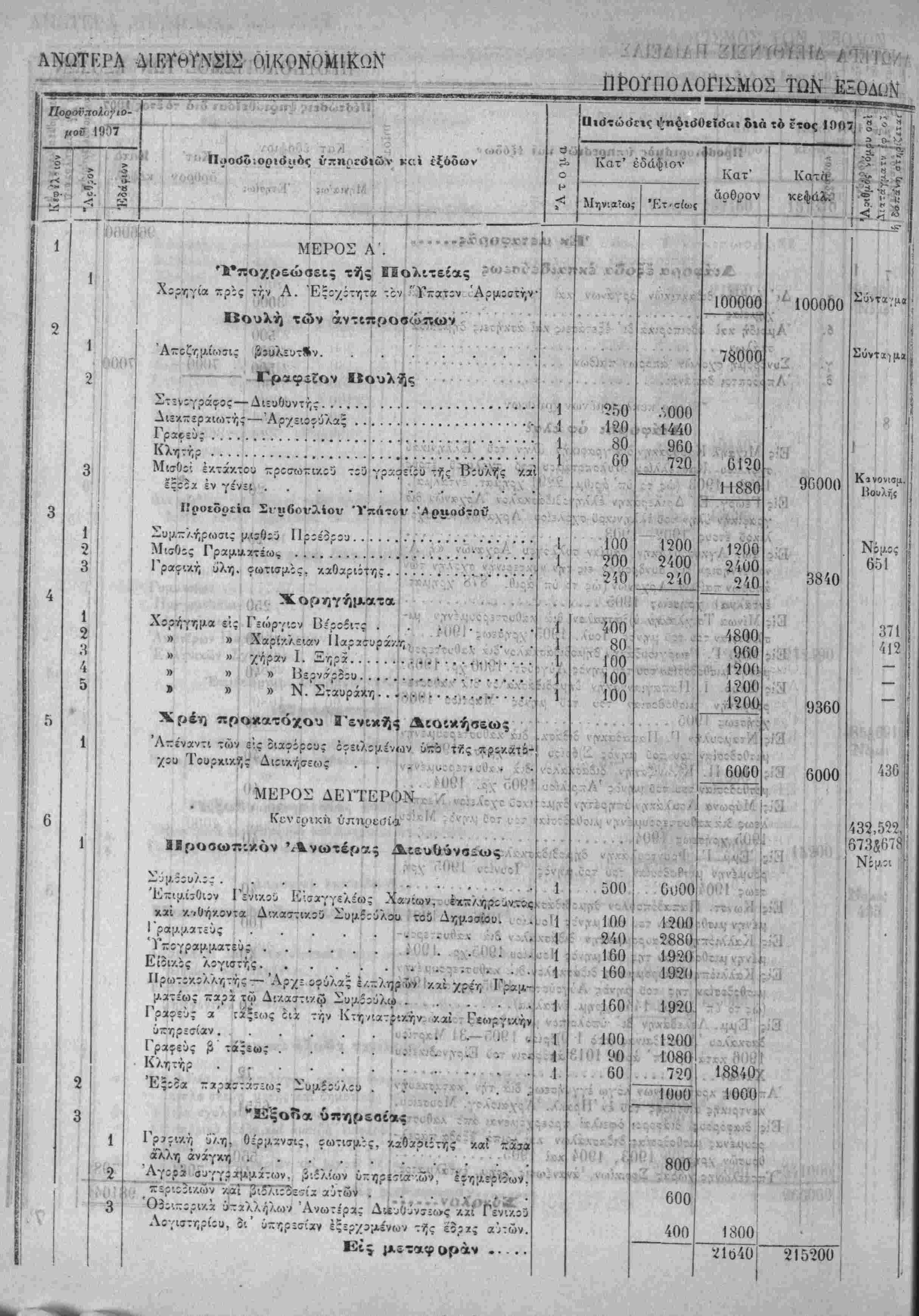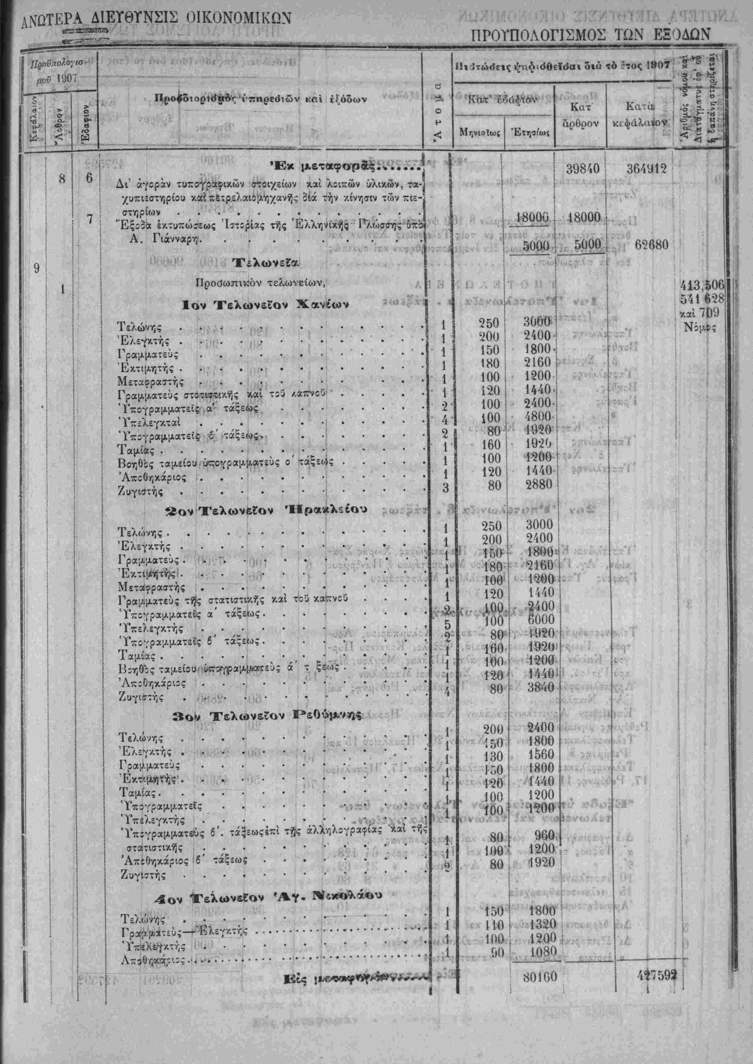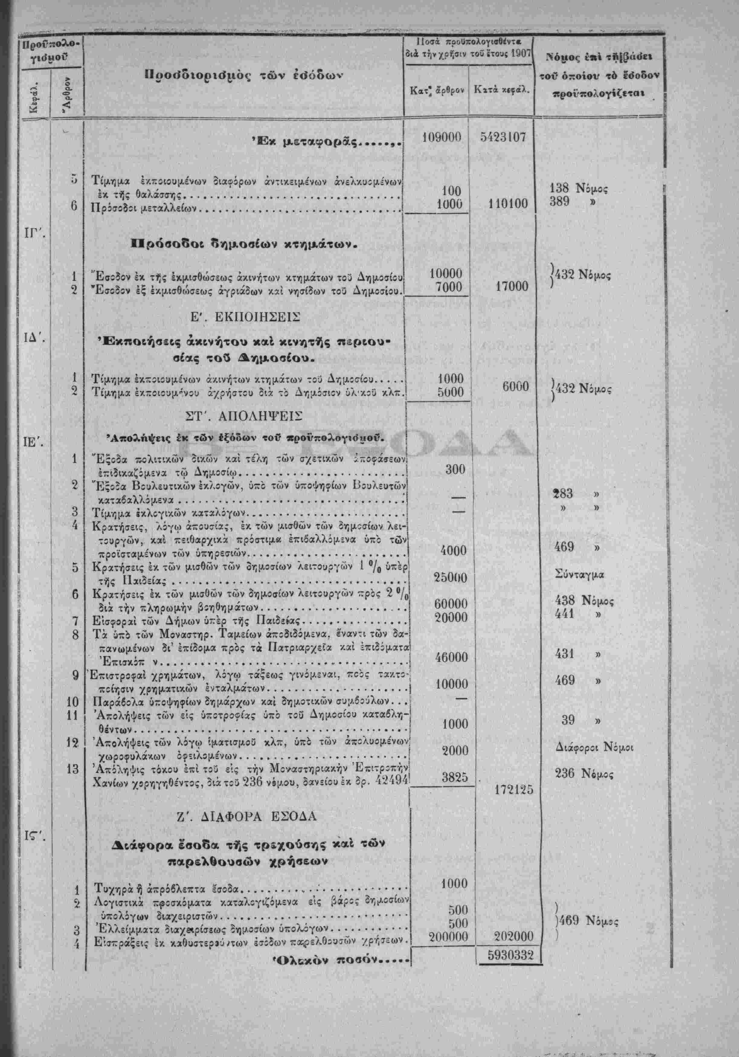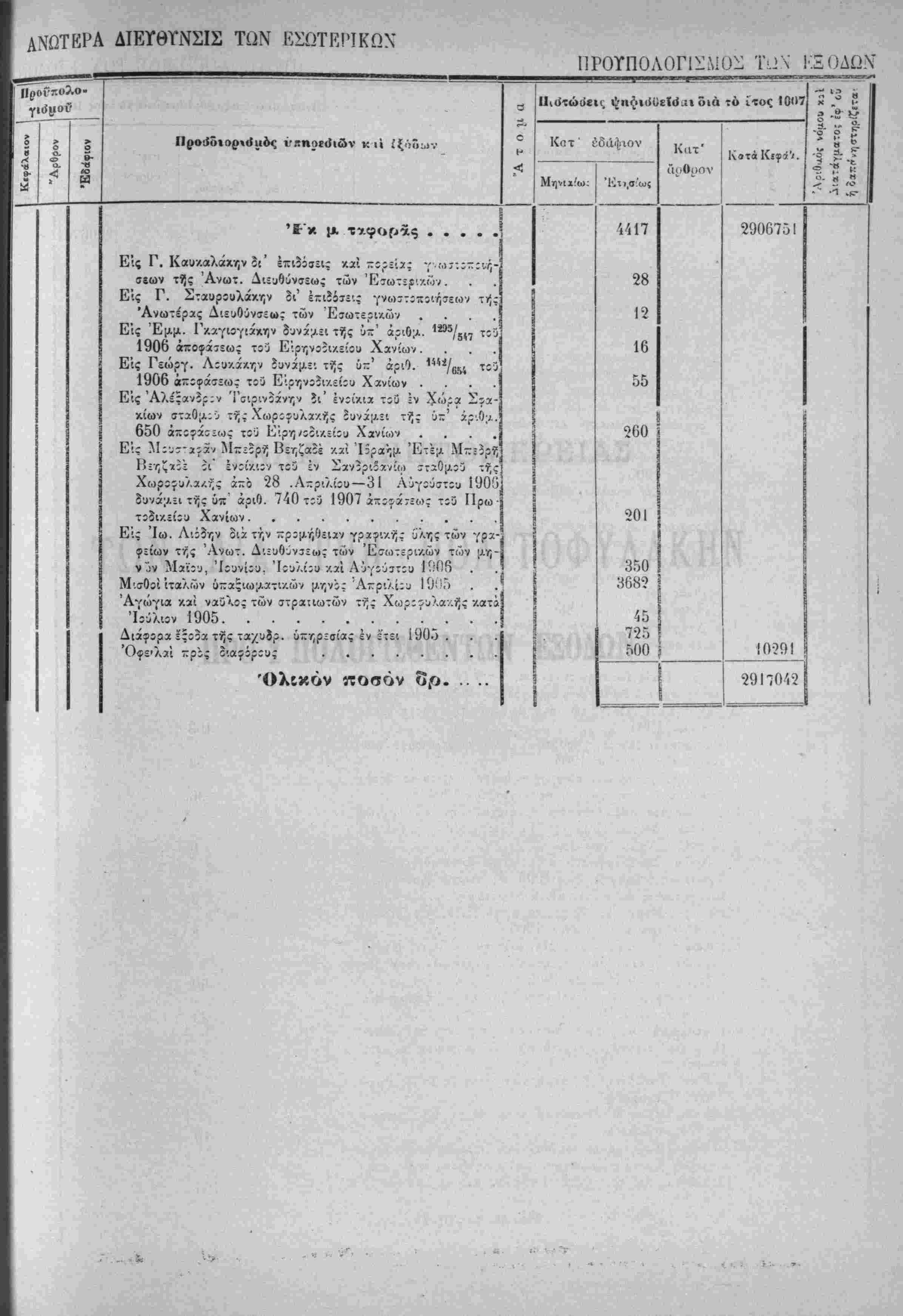 Τα, "ίί«Ιοδα της Κρητικης ΙΙολιτίίας όρίζοντχι διά την χρήσιν τοΰ ετους 1907 εις δραχμάς -έντε έΛατομμυρια