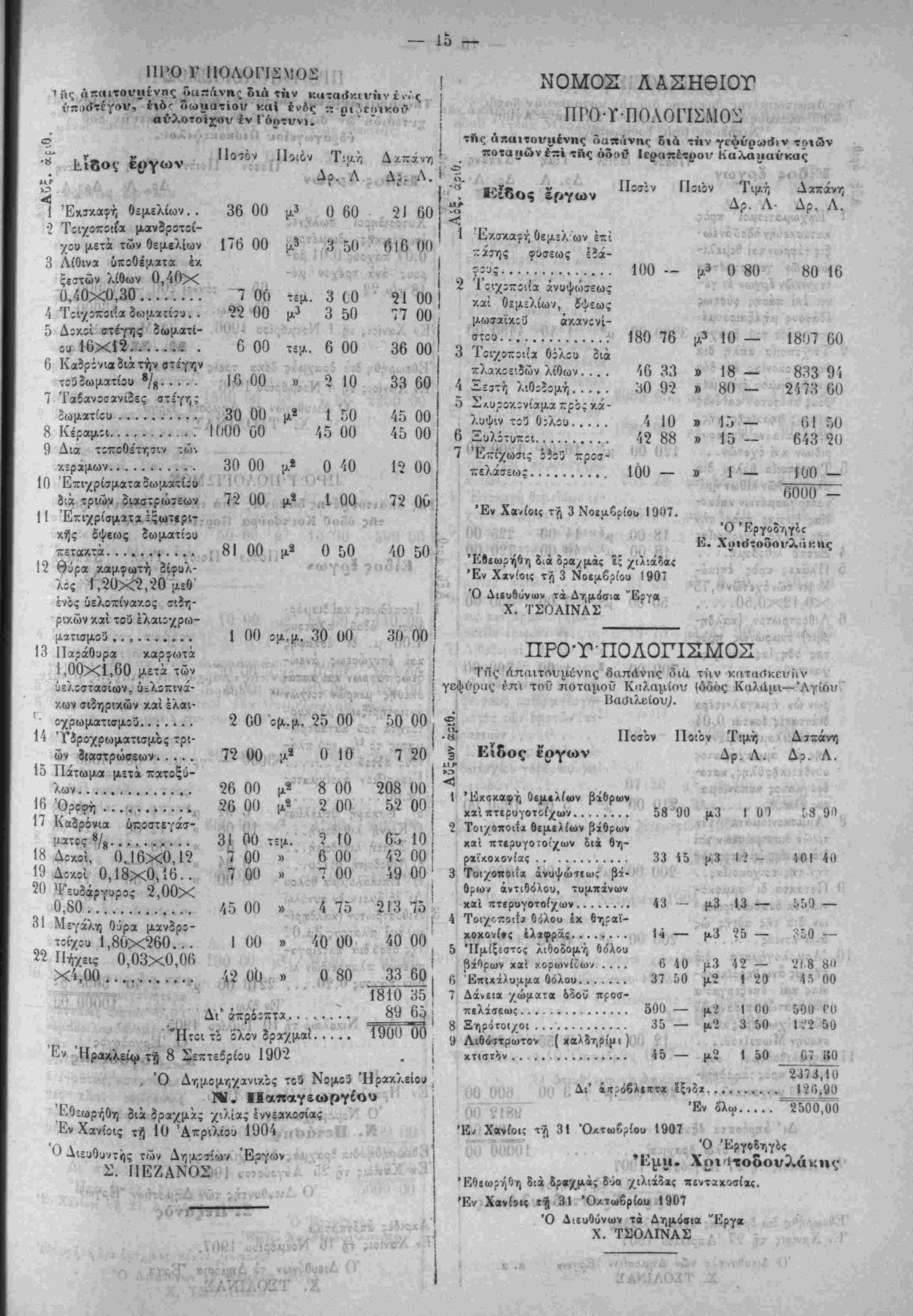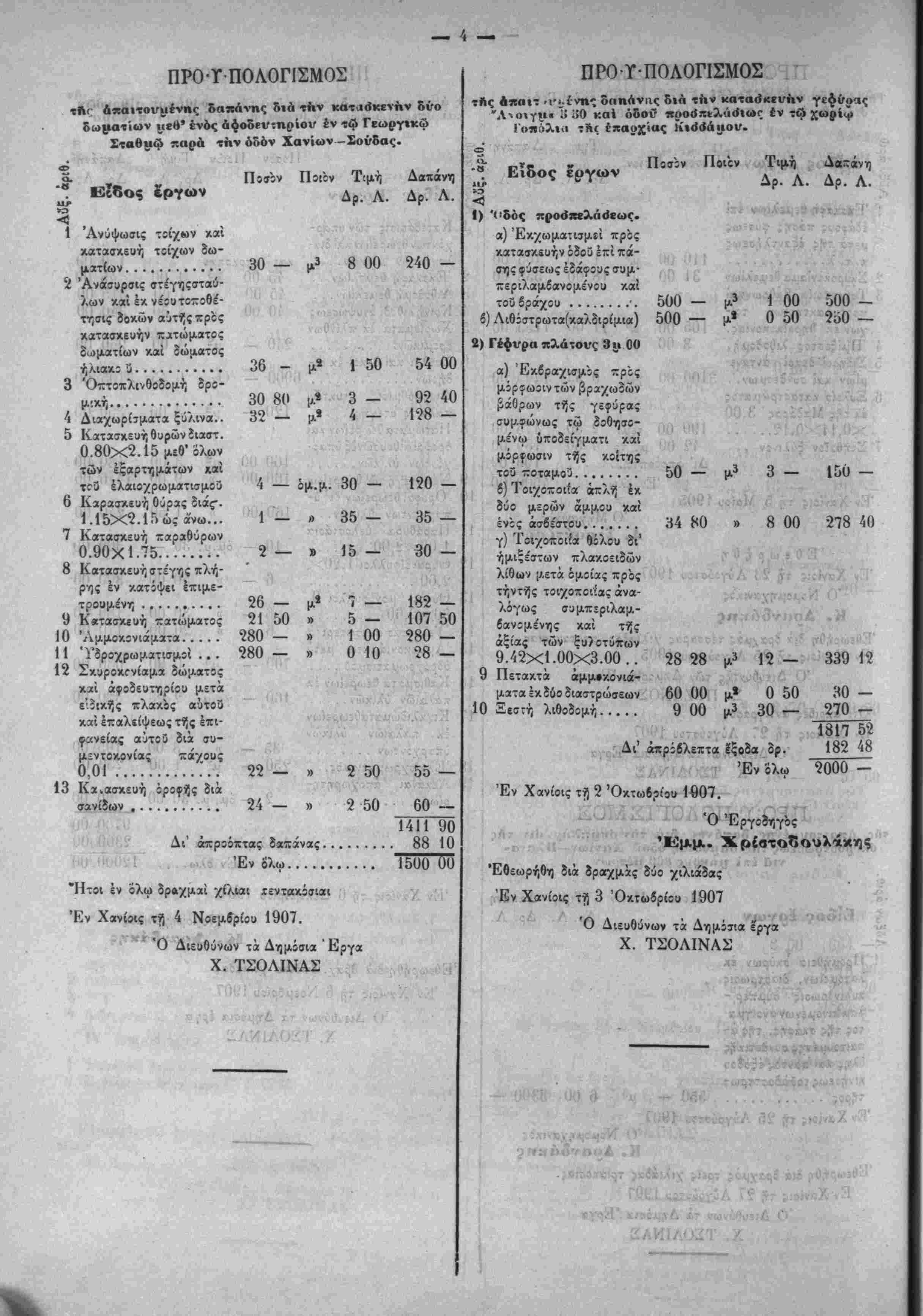 β-ρώ«<ΐ( «χχου; Ο,ίβ »·! ( κατά τάς υπό τού Δρ. Δ. Δο. Λ. νβς χλίσιις Χ«νίβΐ« τί «Ι Ο 80 2000 00 1907 Ό Έργοϊηγο Χδ χμ δυο χ Έν Χ—<ε»< τγ 34 'Οκν·*βε4ο» 4907 Ό Διευθύνων τα Δηαόσια "Εβγα "^ ' , Χ. ΤΪΟΑΙΝΑΣ Ι ής ΙΙαρηδείάων ο. Έίδος έργων Ιΐαοϊν Ποίον Τιμή • Λ. Δρ λ' 1 Έκχ<*ματισμοί θεμε- λίω^ ι'*ί Κ(ίσης ύ 2 'Γίΐχρΐοι/α άπ^ή* διά Θηρα'οΐ9"λ&νίβς ίνες α|- ρους ασβέστου ενός με'- ρους ΒΐρβΊλής γής κ^ί "' ι μ,ερων άμμον- 15 00 1 50 12 00 180 3 Τοιχ9-;ιίχ ζιά ών λίθων συμ- περιλαμδανομό'νης καί ^ς άξίβς των ξυλοτΰ- πων χαί διά κονίας ώς άνω.............. 5 00 μ3 4 ~£αττί} /ίτ)θ3ομ.>}..... 2 00 μ3
