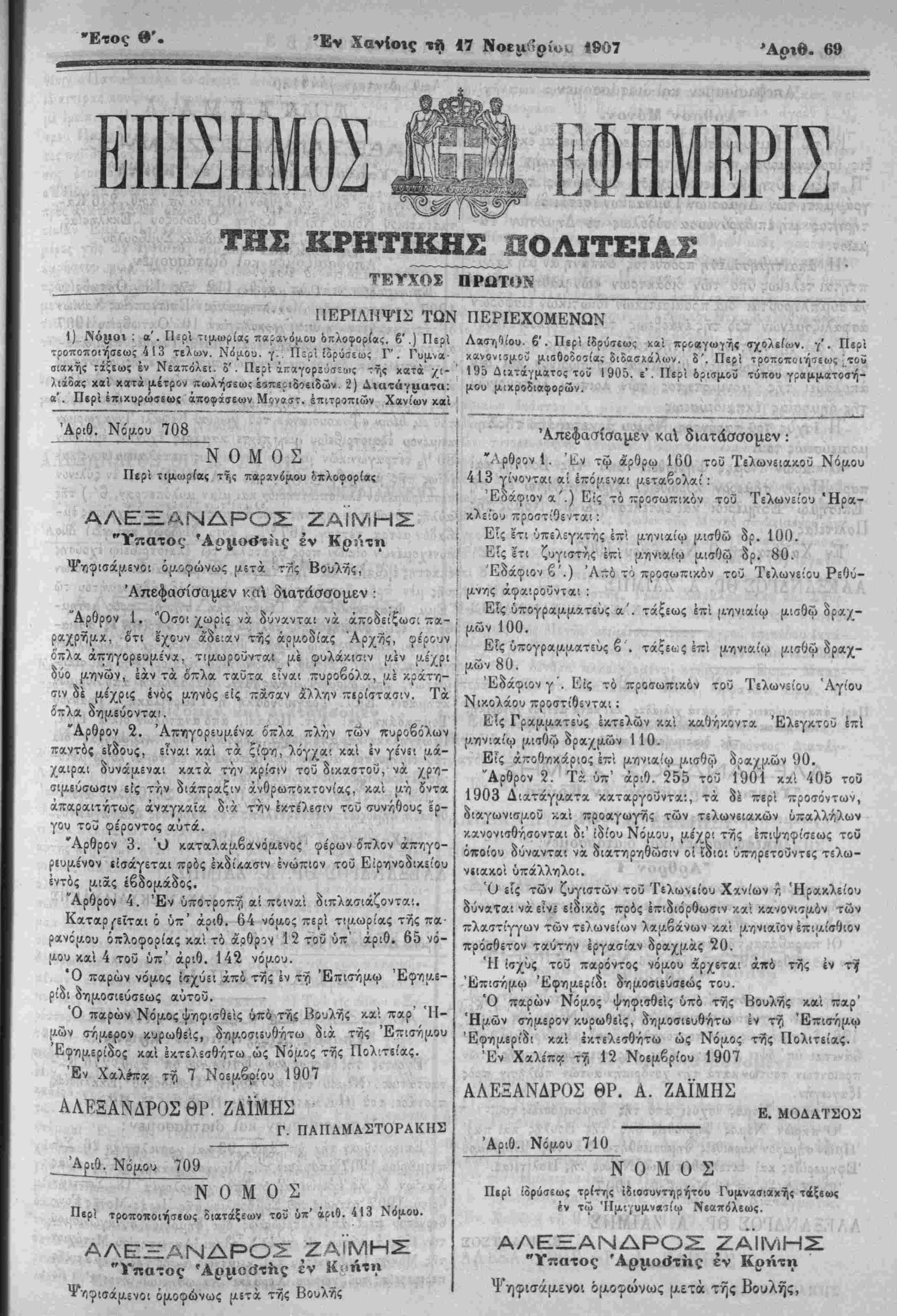 νι? Άπε<$ασίσαμεν ν.οΛ διατάσσομεν : Αρθρον 1. 'Όσοι χωρις να. δύνανται νά άποδειξωσ. πα- , ό'τι εχονν αδε'αν της άρΐ'.οδίας Αρχης, φέρονν οπλα, άπηγορενμένα. τιμωροννται μέ φυλάκισιν [/.ΐν μέχρι δνο μηνών, εάν τα όπλα. ταυτα είναι πυροβόλα, (αέ κράτη¬ σιν δέ μέχρις ενός μηνός είς πασάν άλλην περίστασιν. Τα Οπλα δημεύοντα'. "Αρθρον 2. Απηγόρευσεν* όπλα πλήν των πυροβόλων παντός εΐδους, είναι καί τα ςίφη, λόγχα1 καί έν γένίΐ μά- χαιρα.! δυνάμεναι κατά την κρίσιν τοΰ δΐΛαστον, νά χρη- σιμευσωσιν είς την διάπραξιν άνθρωποκτονίας, καί μη ίντα απαραιτήτως άναγκαΐα δ·α την έ,ίτε'λεσιν τοΰ συν/;6ονς έρ¬ γον τοΰ φε'ροντος αντά. "Αρθρον 3. Ό καταλα,μβαινόρΐδνος φέρων δ'πλον άπηγο- ρίυμένον ιίσάγετα,ι πρός έκδίλασιν ενώπιον τοΰ Είρηνοδικίίθυ ίντός μιας εβδομάδος. Άρθρον 4. Έν νποτροπγ) αί ποιναί διπλασιάζονται. Κα,ταρ^εΐται ό νπ' αριθ. 64 νόμος περί τιμωρίας τής πά ρανόμον όπλοφορίας κα; τό άοθρον 12 τοΰ νπ' αριθ. 65 νό¬ μον καί 4 τοϋ ΰπ' αριθ. 142 νόμον. Ό παρών νόμος ίσχνει άπό της Ιν τη Έπισημω Εφημε¬ ρίδι δημοσιενσεως αντοΰ. Ό παρών Νόμος ψηφισθείς υπό της Βονλης κ.αί παρ Η¬ μών σήμερον Λνρωθείς, δημοσΐόυθήτω διά της Επισημον Εφημερίδος καί έ^τίλίσθότω ώς Νόμος τής Πολ'τείας. Έν Χαλίπα- τη 7 Νοεμβριού 1907 ΑΛΕΞΑΝΔΡΟΣΘΡ ΖΑΪΜΗΣ -. ^ ' Γ ΠΑΠΑΜΑΣΤΟΡΑΚΗΣ __ΆριΟ. Νόμον 709 ΝΟΜΟΣ Περΐ τροποποιήσεως Βιατάξεων τοΰ ΰπ'αριθ. 413 Νόμου. 'ν<ν>'ΑΛΕ2ΞΑΝΔΡΟ5: ΖΑΙΜΗΣ