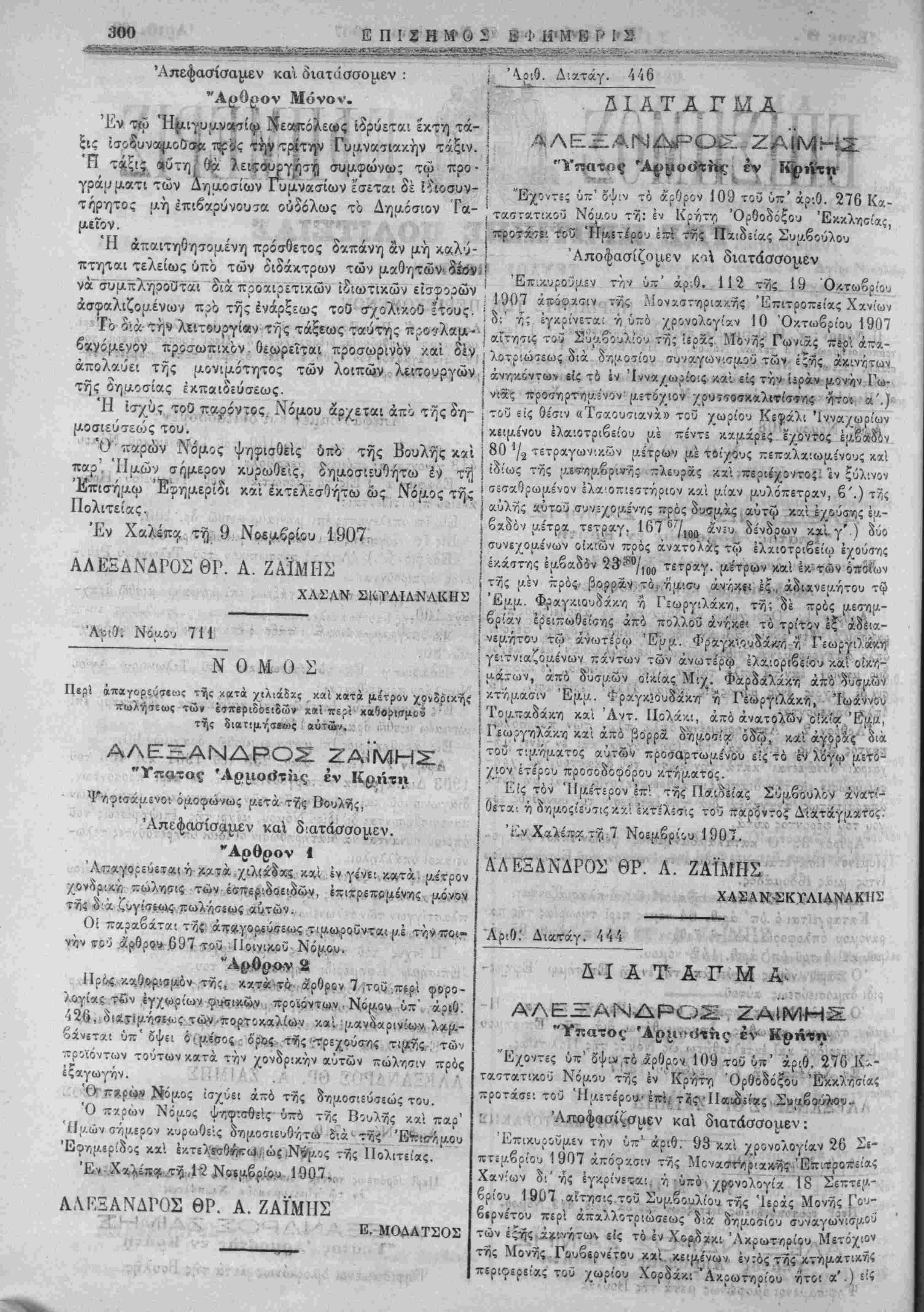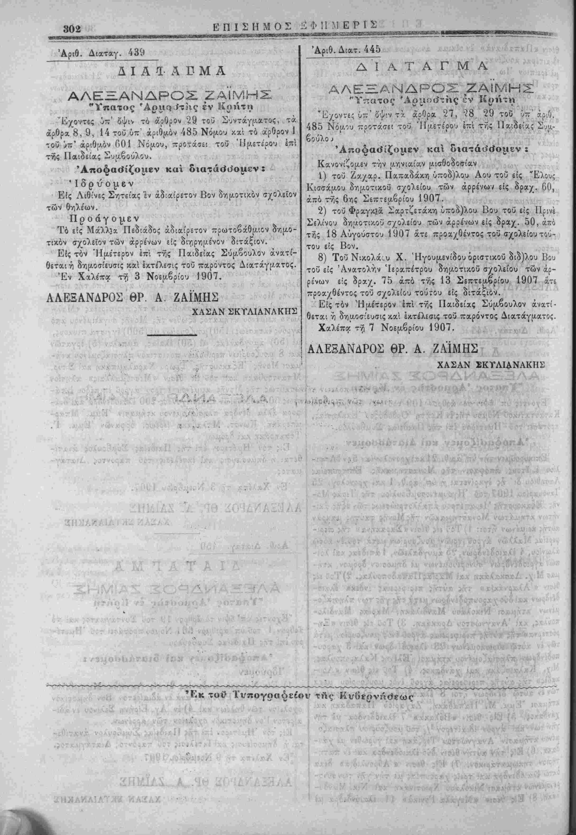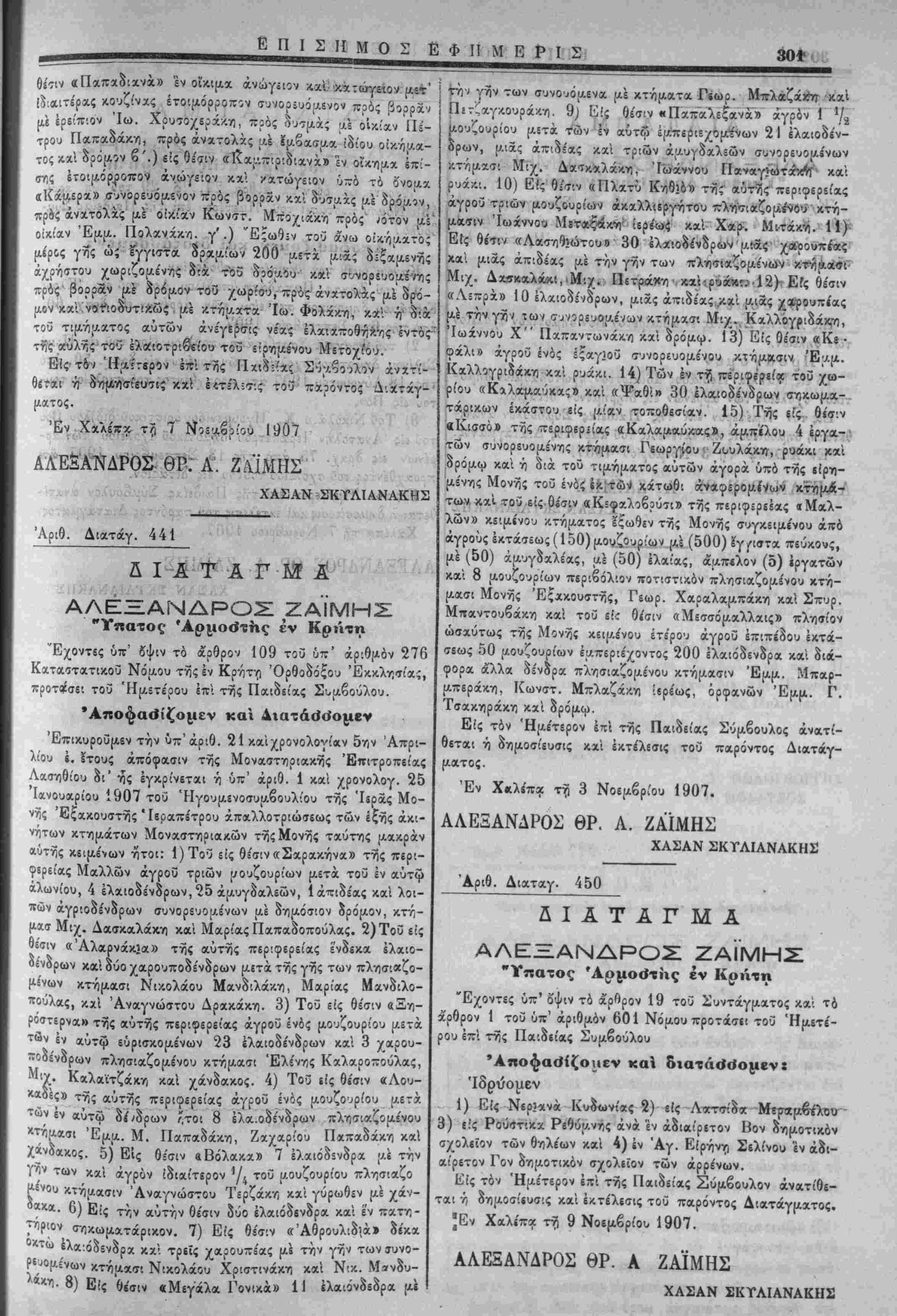 τ&Μκχί- τοΰεϊς.θί'σιν αΚ£<ρ5ΐλοβ?ύτι» της περιφερείας «Μαλ- λών» κειμίνου κτήματος Ιξωθίν της Μονης συγκειμε'νου άπό άγροΰς εκτάσεως (150) μουζουρίων μ? (500) Ιγ/κττχ πεύκονς, μέ (50) άμυγδχλέας, μέ (50) έλαίας, άμπ«λον (5) «ργατών καί 8 μουζουρίων περιβόλιον ποτιστι^όν πλησιαζομένου κτη- μασι Μονης Έξχκουστής, Γεωρ. Χαραλαμπάκη καί Σπύρ. Μπαντουβάκη καί τοΰ εϊί θι'σιν «Μ6σσόμ.χλλαις» πλησίον ώσχύτως της Μονης κειμένου ετέρου άγροΰ έπιπίδου εκτά¬ σεως 50 μουζουρίων έμπεριέχοντος 200 ελαιόδενδρα κα'ι διά- φορα άλλα δένδρα πλησιαζομένου κτήμασιν Έμμ. Μπαρ- μπεράκη, Κωνστ. Μπλαζάκη ίίρέως, όρφανών Έμμ. Γ. Τσακηράκη καί δρόμω. Είς τόν Ημέτερον επί της Παιδείας Σύμβουλος άνατί- θεται ή δημοσίευσις καί εκτέλεσις τοΰ παρόντος Διατάγ- ματος. Έν Χειλί'πα τη 3 Νοεμβριού 1907. ΑΛΕΞΑΝΔΡΟΣ ΘΡ. Α. ΖΑΙΜΗΣ ΧΑΣΑΝ ΣΚΥΛΙΑΝΑΚΗ^ Αριθ. Διαταγ. 450 ΔΙΑΤΑΓΜΑ ΑΛΕΞΞΑΝΔΡΟΣ ΖΑΙΜΗΣ "Υπατος Άρμοότίις έν Κρήτη "Εχοντες ύπ' όψιν τό άρθρον 19 τοΰ Συντάγμχτος κ,α: τό αρθρον 1 τοΰ ύπ' αριθμόν 601 Νόμου προτάσιι τοΰ ΉμετΙ- ρου επί της Παιδειας Συμβοΰλου *Αποφαο>ίζο>»εν καί 5ιατά<ί<ίομβνχ ΊδρύΌμεν 1) Είς Νερίανά ΚιΛωντ'*ς 2) είς Αατττίδα· -Μίραμβ^λθίΓ 3) είς Ρούστικχ Ρεθύμνης άνά εν άδιαίρετον Βον δημοτικόν σχολείον των θηλέων καί 4) ίν "Αγ. Ειρήνη Σελίνου εν άδι¬ αίρετον Γον δημοτικόν σχολείον των αρρενων. Είς τόν Ημέτερον επί τής Παιδείας Σύμβουλον άνατίθε- ται ή δημοσίευσις καί εκτέλεσις τοΰ παρόντος Διατάγματος. ^Εν Χαλεπ* τη 9 Νοέμβριον 1907. ΑΛΕΞΑΝΔΡΟΣ ΘΡ. Α ΖΑΪΜΗΣ ΧΑΣΑΝ ΣΚΤΑΙΑΝΑΚΗ2