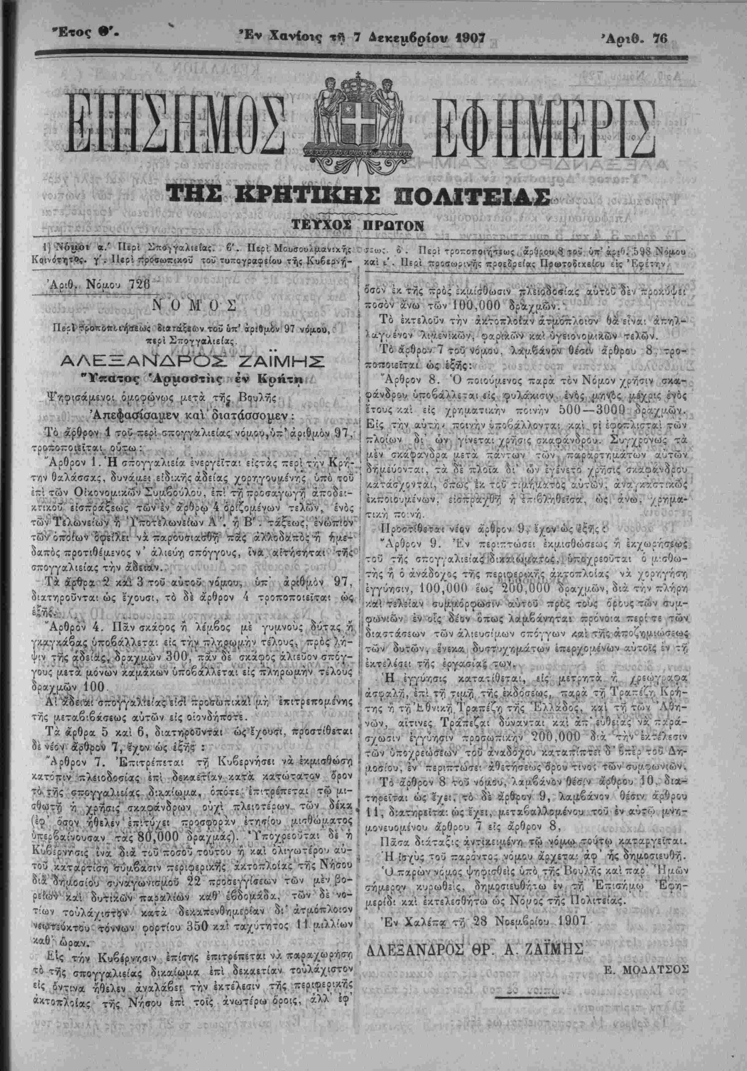 Έν Χανίοις τ« 7 Δεκέμβριον 1907