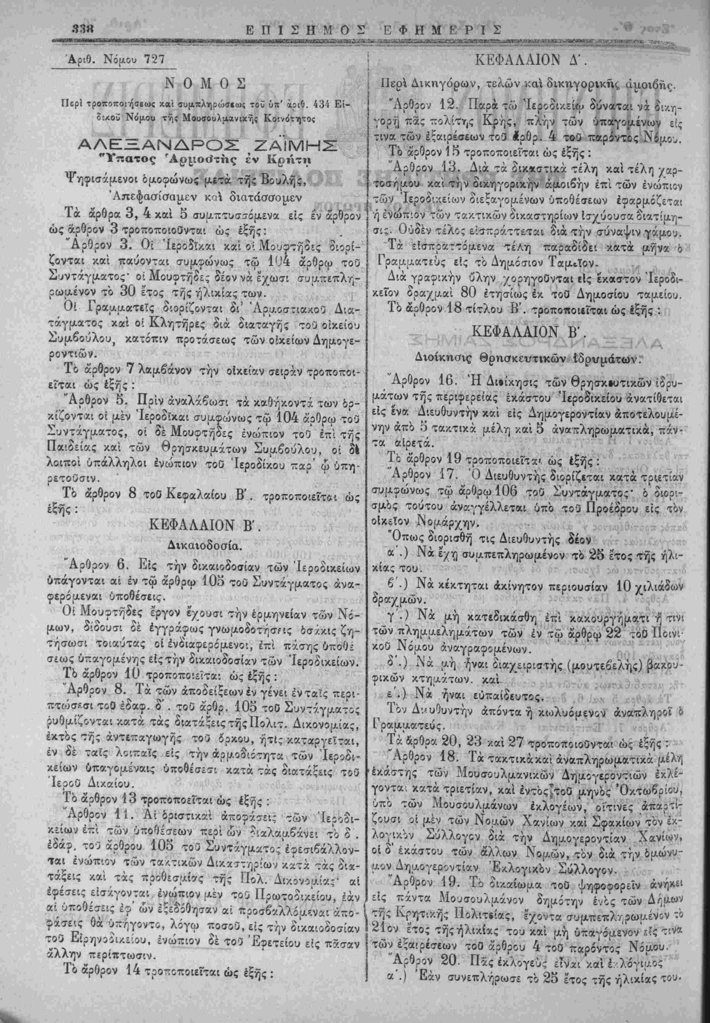 Περι τ5θποτ!<ιΐ)<;ε(ι'ς τοΰ 5;6ρου 8 'θΖ ΰτ' άριθμ 598 Νό;ιου ΑΛΕΞΑΝΔΡΟΣ ΖΑΙΜΗΣ "Υπατος 'Αρμο<ίτης έν Κοήτη Ψηφκίάμενοί δμοφώνως μετά'της Βσυλής, Άπεφαοισαιιεν καί δτατάσο'ο^^ν : "Αρθρον Μόνον. Κατάρ'γεΐταΓ ^ή θέσις βάήθΌδ Αέν" 'τ'ω' καπνοκοτΐτηρίψ "Αγίού ΝικοΧάου, τό οποίον* έρεζης'Θέλει"διευ9υνει ΔιευΘυντής 2πΐ μηνιαίω'μισθί}) δραχ'. 160*. Ό παρών νόμος ψηφισθείς ύπΌ τ/^ς ΒουλτΙς' καίπαρ' Ήρεών'σήμ'ερ'Όν/'κυρτυθείς δημοσιευθήτω διά της Έ+ή- σήμου Εφημερίδος κοίΐ' έκτεΧείΟ-^τώ^ώς^ΝίίΧσς- της Πολιτείας. , Έν' Χαλέπα τί) 28 Νοεμβριού 1907 ΑΛΕΞΑΝΔΡΟΣ »· Α· ΖΑΙΜΗΣ Ε. ΜΟΔΑΤΣΟΣ Αριθ. Ν ομού Ν Ο Μ Ο ν Ν Ο Μ Ο Σ Περΐ προσωρινή; άναθέ«(ως τή; Προεδρε'α; 'τοΰ ΠρωτοοΊχείευ *ίς Έφέτην. ΑΑΕΞΑΝΔΡΟΣ "Υ-ατος^Αρι/οβττις ^έν ΚρΛτ« Ψηφιιαμενοι όμοοώνως μετά της Βουλης Άπεφασίσαμεν καί διατάσαομεν: "Αρθρον 1. ΙΙροτατει τού ώυμ,δουλ'ου ττ,ς Δικαΐοσυνγις προκα,λθυμίνγι υπό της Ανωτέρας Διευθύνσεως της Δι^α,'.θ,σύνης δύναται ν άνατεθί) διά Διατα'γ|ϊά.νος "τοθ "'ΥΛάτου'"Άρ}Λθ(?τοΰ·7ΐίρο- σωρινώς ή Προίδρείλ Πρωτό^ικιί(}υ ^ίτε καθ1 δλχ εϊτ'ί ω; πρ6ζ ώρΐσρ.ένον ■τΐΑ-ημα τνίς υπηρεσίας α,ύτθδ είς Έφετ*ΐνϊ: τ "Αρθρον 2. Όσά,ας ΰπάρχοντος τκκτικοϋ Προέδρου είς Έφε'ττΐν ά'*- τίθεται ή Προϊο'ρειχ ώρ'σμένου' τμήακτ'ος τΫϊς ύπηρεσ'Ό.ς' ό τακτι/.ός Προεδρο; χ,χ. ό Προεδρεύων Έφε'της 'άνα,ττλγιροίΐσιν αυτοδικαίως αλλήλους, ΕπιφΆασσο'μϊνης κ*ϊ της ιτα.ρ'' άΤλων δικαστικών πρΌσώπων άνχ-λγιρώσέωλί αυτών 'συμφώνως1 πρός τας διατάξέΐς τοϋ* Όργ*"νι<τμοθλτ&νι Δ'.κα-σττρΐων. Ό παρων Νόαος ψηίρ!σδε!ίς '^πό της Βούλης κα! πχρ Ή|ίδ δ |?ρμ 'ίφ-Λ,μεριδος Ααι έκτελεσθήτω ώς Νόμος της 'Εν Χαλέπα τΤ) 28 Νοεμβρ-ου 1907 ' ΑΛΕΞΑΝΔΤΟΐ ΘΡί Α --ΖΑΜΗΣ Γ. ΠΑΐΐΑιΜΑ'ίΤΟΡΑΚΗΪ ι - *Εκτοϋ