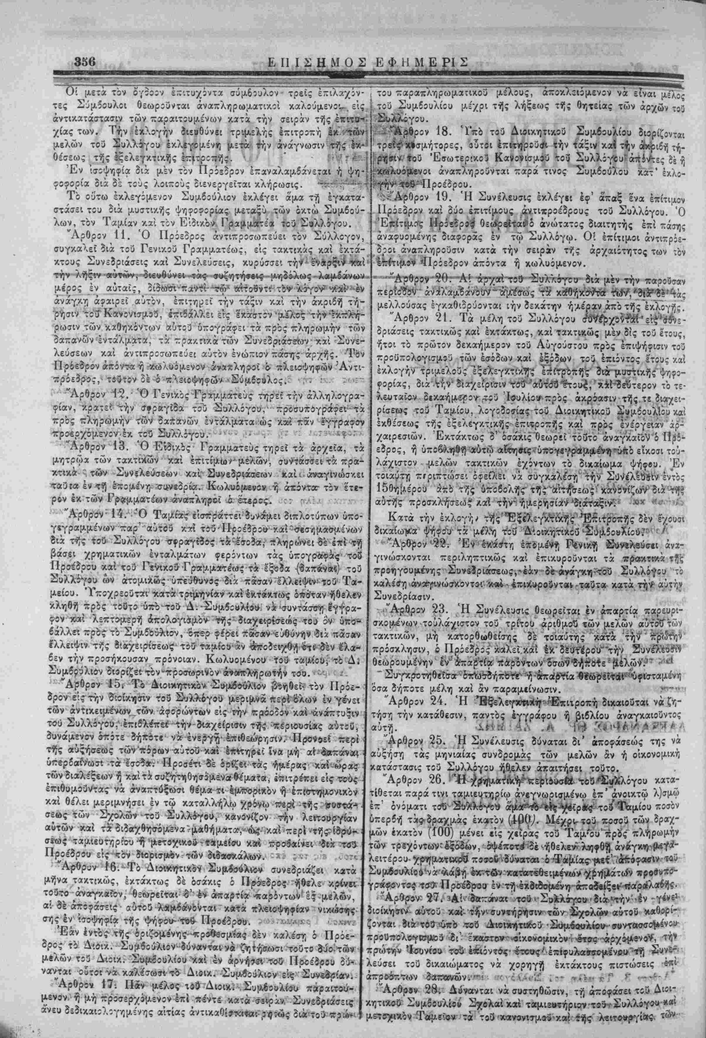 μέλλοντι θέλει έγκρίνει τΌ Διοικητικόν Σομίβιίλιβν <τ»Β Σΐίλτ λογου. ,ϊ!ΐ·<ί:ί ^:τ ΐίε^·ι "Άρθρον 3. Τα μέλη τού Συλλόγου εισίν τακτικά και ειτί- τιμ«· <α{ τχχτιΧά μ'£ν εισίν οί έμποροϋζάλληλίΐ έμιτορικών καί β«μη-/ανικών καταστημάτων, οί ΰπάλληλοι Τραπεζών, έμπο- ] ρικών καί «οΐραγγελι:ϊΐ"/ικών γραφείων. Έπίτιμα 5ϊ πρόσοτπα έξέχουσαν κατέχοντα θέσιν έν τώ εμπορικώ, βιομηχανιχώ κα τρα-εζιτΐλω -/.λάϊφ, χ.αί χαθώς καί ά'λλοι Βυνάμενοι διά τής ήθικής καί ύλιχής αυτών άρωγής νά συντελέσωσιν είς την εύί- δωσιν τοΰ Συλλόγου. Αρθρον 4. Μετά την έπιψήφισιν υπό τί]ς Γενικάς Συνελεύ¬ σεως καί την δι Ηγεμονικοΰ Διατάγματος εγκριςιν τοδ ποι- ρ3ντος καταστατικοϋ οί βουλόμενοι νά γίνωσι τακτικά με'λη οφείλουσι νά υποβάλλωσι πρός τό Διοικητικόν Συμβούλιον τοΰ Συλλόγου αίτησιν τί) συστάσει τριών παλαιών μελών, όπερ ά-οφαίνεται έν τή πρώτη συνεδριάσει περίτοϋ παραδεκτού ή μή ταύτης κοινοποιούν την απόφασιν τού πρός τόν αΐτοδντα έπιμε- λεία τού Ε'ιδικού Γραμματέως τοθ Συλλόγου. Άρθρον 5. Τα έπίτιμα μέλη τού Συλλόγου άναχηρύσσον- ται υπό τοϋ Δ. Συμδουλίου αΰτοΰ' είς τε τα έπίτιμα καί τα τακτικά μέλη τοϋ Συλλόγου άποστέλλεται τί) φροντίδι τοϋ Δι- οιχητικοϋ Συμβουλίβυ δίπλωμα, φερον τρ ονοματεπώνυμον καί τάς λοιπάς Ίδιότητας τοϋ μέλους καί την υπογραφήν τοΖ ΙΙρο- έδρου καί τοϋ Γενικοΰ Γραμματέως μετά τής σφραγίϊος τ;ϋ Συλλίγοϋ. . -,.Τ .ω;,:<5,{ ν ,. .νΐν«: αΐ^ί Άρθρον 6. Τα- τβίκτικίΐώς καί ?τά έπίτιμα μίλη το& Συλ¬ λόγου χαίρουσιν τα αύτά ίι/.αιώματα πλήν τοϋ τής ψήφου ήτις αποκλειστικώς άνήκει τοίς τακτικοΐς μέλεσιν. Άρθρον 7. Παν μέλος τοϋ Συλλόγου όπερ ήθελεν κατηγβ^ ρηθί) δι' ηθικήν πράξιν καϊ άποδειχθί) αυτή βάσιμος ϊιαγράφε- ται τοϋ μητρώου καί ίέν έπιτρέπεται πλέον ή επάνοδος αύτίθ^ μή έπιστρεφομένων καί των καταθέσεών τοΐ» λόγφ συνίρομής ή δι'οιονδήποτε λόγον. ,., ι;. "Άρθρον 8. Πάν τακτικόν μ&ας τού Σύλλογον όφείλει νά καταδάλΐ) έφ' άπαξ δικαίωμα έγγραφής δραχμάς τρείς (3) καί έν άρχί) εκάστου μηνός την συνδρομήν τού οριζομένην είς δραχ¬ μήν μίαν καί 20 °/0 (1,20). Τοΰς επί τρείς μήνας καθυστε- ρ:ϋντας την συνδρομήν καλεϊ τό Διοικητικόν Συμβούλιον ό'-ως καταδάλωσιν αυτήν, μή συμμορφουμένους ίέ τούτους πρός την ϊτρόσκλησιν ταύτην, τό Διοικητικόν Συμβούλιον ϊιαγράφει έχ τοϋ Συλλόγου των τακτικών μελών ϊυνάμει αποφάσεως τού. Δύναται όμως τό οΰ'τω διαγραφέν μέλος νά έπαναγραφί) αμα καταδολί) των καθυστερουμένων ^όσίων ^ί ^ικ^ίω^α χέ»ί έγγραφής δραχμών τριών (Ϊ*}λ«7χχ ύΤ ^ υτιτν,υκϊ,ι· ηλϊϋ <χχ Άρθρον 9. Κατά τάς συνελεύσεως ιτ&Ο Συλλίγοΐ»-τας γενη- σομένας έντός εξ μηνών άπό τής έγκρίσεως τοϋ παρόντος καταστατικο-3 μετέχουσιν καί ψηφίζουσιν πάντα τα τακτικά μίλη «ΰτοΰ, είς τάς επομένας συνελεύσει μετέχουσιν μέν πάντα τα έλκ) ίχουσι οιχως δικαίωμ* ψήφου μόνον οί διατελέσαντες,έπί ξάμηνον τακτικά μέλη. Άρθρον 10. Ό Σύλλογος διοικεΐται υπό Διοικητιχοϋ Συμ- -υλίου άποτΐλουμένου υπό τού Πρόεδρον, δύο Άντιπροέδρων, "'ενικοϋ Γραμματέως καί όκτώ Συμδούλων έκλεγομένων με- αςΰ των τακτικών μελών τοΰ Συλλόγου των εχόντων δικαί- νμα ψήφο!) υπό τής Γενικής Συνελεύσεως των τακτικών μελών κατ' Ιτος διά μυστικάς διά ψηίβϊελτίων ψηφοφορίας έντός τ;ϋ ελειιταίου δεκαημέρου τοϋ μηνός Ιουλίου διά σχετικής πλίΐί- ιηφίας την επομένην ημέραν τής αναγνώσεως τζς έκθε'σίο>ς