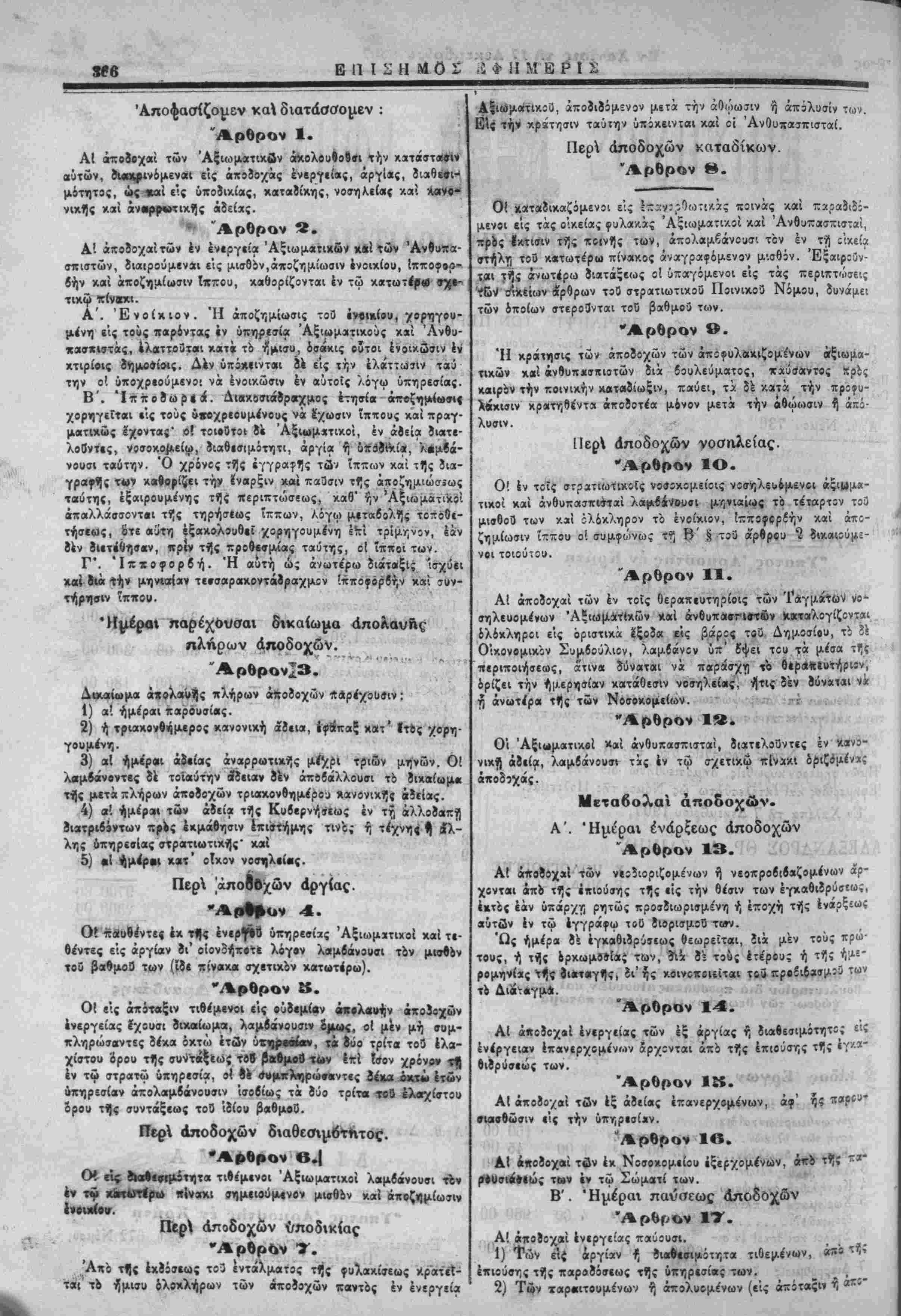 βήν καί αποζημίωσιν Ιππου, καθορίζονται έν τω κατωτέρα <τ%ι- τικω πίνβχι. Α'. Ενοίκιον. Ή άποζημίωσις τοθ «νίΐκίβυ, -/ορηγου- μένη είς τους παρόντος έν ύπηρβσία Άξιωματικούς καί ΆνΘιι- χασχιστάς, ελαττοϋΐβι κατ« τό ήμισυ, οσάκις ούτοι έτοικΰσιν έν κτιρίβις δημοσίοις. Δεν ύπά*«ινται δέ είς την ελάττωσιν ταύ την ο! ΰποχρεούμενο·. νά ένοικώσιν έν αυτοίς λόγω υπηρεσίας. Β'. Ίπποδωρεα. Δΐακ&σιάδρβτχμος έτηνία άπβζημί'ωσΗ χορηγεΕται εις τοΰς ΰχβχρεουμένους νά έχωσιν ίππους καί πραγ¬ ματικώς ίχοντας' ο! τοιβθτοι δι Άξιωμχτικοί, έν αδεία διατε¬ λούντες, νοσοκο^είω, διαθεσιμότητι, άργία ή ϋπσίτκίε!, λείμβά- νουσι ταύτην. Ό χρόνος τί]ς εγγράφως τώ; ίππων καί ττ]ς δια- γρα«·»|ς τ*»ν κανΌρίζει την ΐναρξιν καί πα3σιν τί|ς άποζημιώσ.ως ταύτης, έξαιρουμένης τί)ς περιπτώσεως, καθ" ήν Άξιωμβτικοί άπαλλάσσοντβι τϊ|ς τηρήσεως ίππων, λόγω μεταβολάς τοποθε¬ τήσεως, 6τε «ϊτη έξακολουθεϊ χορηγουμένη επί τρίμηνον, εάν ϊεν διετέθησαν, πριν τής προθεσμίας ταύτης, οί ΐπποι των. Γ*. Ίπποφορβή. Ή αυτή ώς ανωτέρω διάταξις 'σχυει χαί σία την μηνιαίαν τεσσαρακοντάίββχμχν ίπποφβρίήν καί συν¬ τήρησιν ίππου. παίίέ^ότ/σαι δϊκαίωμα άποΚαυδς , ηλήρων άποδοχών. «, Δ«καίωμα ά*ολανί)ς πλήρων άκοϊοχών παρέχουσιν; 1) α'. ημέραι παρόυσίας. 2) ή τριακοντήμίρος κανονική ίίεια, Ιφβπαζ κ»τΑ γουμένη. 3) αί ημέραι άίείοις άναρρωτικής μί^ρΐ τριών μηνών. Οί λαμβάνοντες δέ τοιαύτην αίδειαν ίεν άπίίάλλουσι τό ίικαίωμα τής μετά-λήρων άποοΌχών τριακονθημέρου «ανονικής αδείας. 4) α! ήμίρβι των αδεία τής Κυβερνήσεως έν τί) άλλοίβπϊ) 8ιατβι6»ντων πρ·ς έκμάθησιν έπιστήμης τινος ή τέχνην <| ίλ- λης υπηρεσίας στρατιωτικάς" καί 5) «Ι ήμέρεΗ κατ' οίκον νοσηλείπς. ν αργίας. έκ τ|)ς έν«ργ%8 υπηρεσίας Άξιωμχτικοί καί τε- θέντες είς αργίαν βι' οίονοήπ·τί λόγβν λβμβάνουσι τον μισθόν τού βαθμοθ των (ίδί πίνακα σχετικόν κατωτέρω). •ΛίΧιΗ^ "Αρθρον 5. Οί είς άπστβξιν τιθέμενοι είς βύδεμίαν ά«#λαι>ήν άποϊοχών