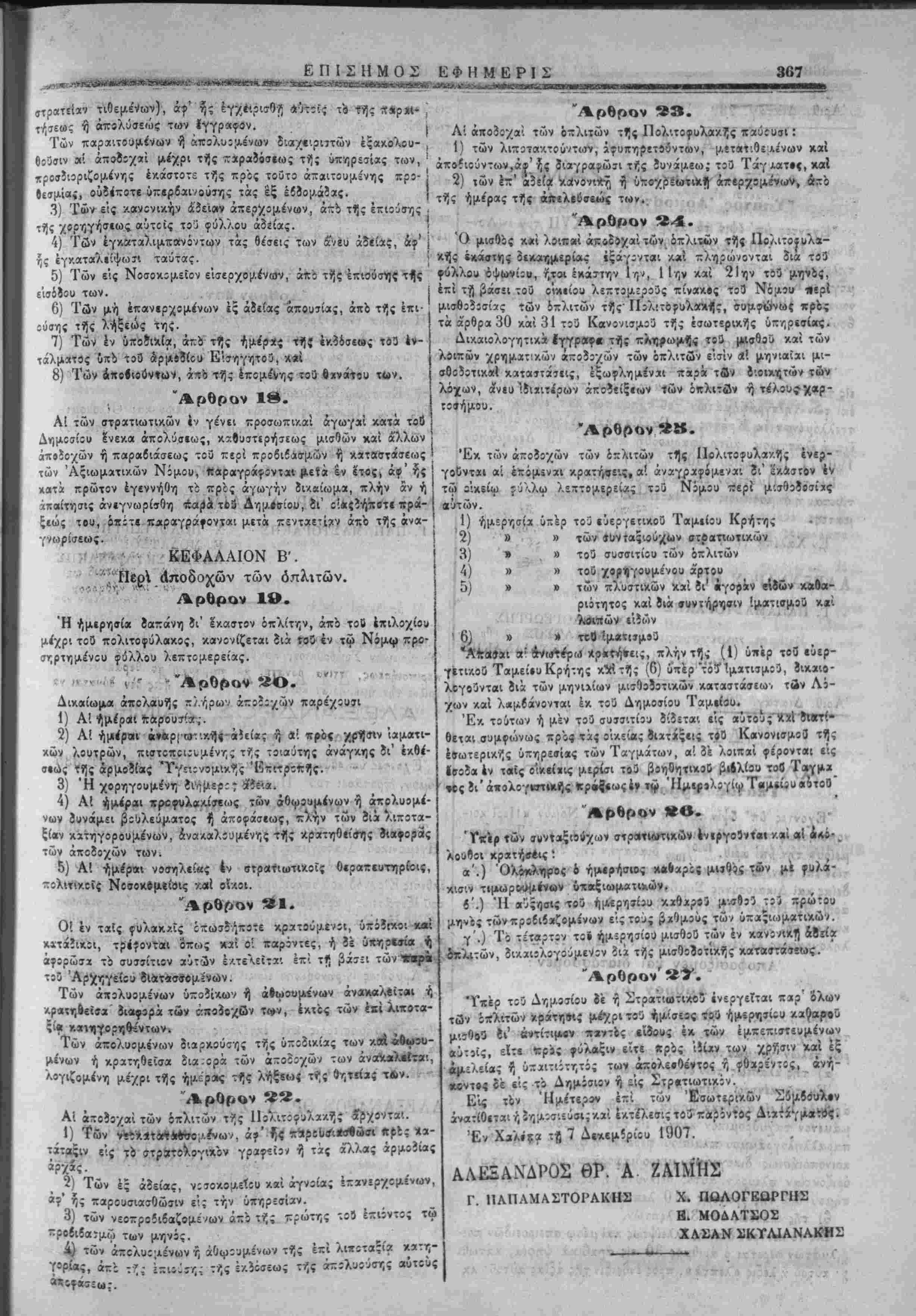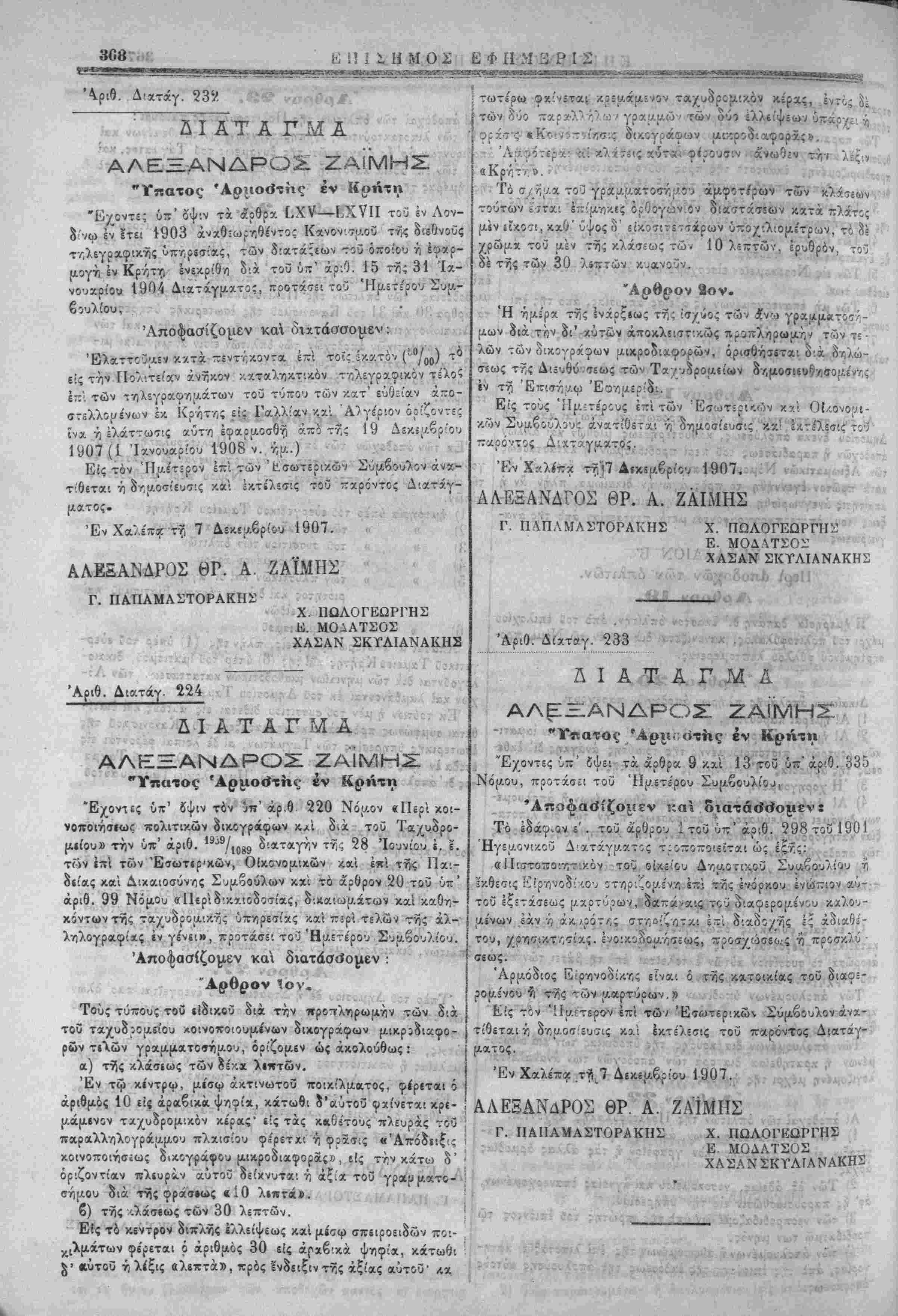 κων ϊυμβούλου': άνατίθβτχ'. ν)" δη|Αθσίίυ(ίις "κχϊ. ίχτ!/6<ΐις'το·ί τταρόντος Λ',χτάγματθί. * ' ν ^ '*"' Έν Χ«λίτα τη°57 Δεκέμβριον 1907. ΑΑΕΞΑΝΔΓΟΣ ΘΡ. Α. ΖΑΙΜΗΣ Γ. ΠΑΠΛΜΑΣΤΟΡΑΚΗΣ Χ. ΠΩΛΟΓΕΩΡΓΗΣ Ε. ΜΟΔΛΤΣΟΣ ' " ΧΑΣΑΝ ΣΚΥΛΙΑΝΑΚΗ^ νώι 233 Λ Ι Α Τ Α Γ Μ Α Λ , Μ ΑΛΕΞΑΝΔΡΟΣ ΖΑ!ΜΗΣ -ΐτ»Α ·*ΐΓδηατος ΆρμΓ,ότίις έν Κοήτη Έχοντες ύπ' ίψει τα ά'ρθρα 9 κχί 13 τοϋ ΰπ'άρ'0...335$η Νομου, προτάσςι τοΰ Ήυετέρου Συμβουλίου, ,ε. Γ1 & «αι 'Α Τό εδαφών.4'-,.-το.^ ά'ρθρου Ιτοΰϋ-'άριθ. 298 τοϋ 1901 , ΉγεμονΐΛθϋ Δ'χτχγματΐς τιοποποιείται ώς έξίς: .1 «Πΐ!ττο·Γϋθΐ-/ΤΓ.κόν τοϋ οίκείου Δηο.οπν.οϋ Συαβουλίου ή έκθεσις Είρ'ονοδ'Λθ'^ οτηρ;;ο;ο.£νη επί τίς ένόρκον ενώπιον,λμ-;- τοϋ !ξ=τχ<ίεως υχρτΰίων, δαπά''αις τοϋ ϋΐαφερομε'νου καλου- κόντων της ταχυόρομικής ΰπηρεσίχς κχί πϊρΐ τελών της άλ- | μένων «αν ή άκ<ρότ(ϊ; στηοίζνιτχι έτ'ι δ'.αδονης ;ς άθιαθί'- ληλογραφίχς έν γέν.ι», προτάσει τοϋ Ήμετε'ρου Συμβουλίου. | τού, χρη^ι^ττ,σί'χιί. Μθ^οΚο^.ησεως, Τίροο-χώσεοίς'η προσκλύ- Αποφασίζομεν κα διατάσ<ίομεν : *&Β ς«ϊ «Πί· "Αρθρον 1ον σεως. Τίΰς" νύιτο'υς τβϋ ιίδικοϋ διά την ιτροτΐλνιρωμην των δχ τοϋ ταχυδρομίίου Αθΐνοιτοιουμένων δικογράφων μικριδιαφο- ρων τιών γραμμ»το»ημου, όρίζομβν ώς ακολούθως : α) τής κλάσιως των ο'έκ.χ >·ι»των.