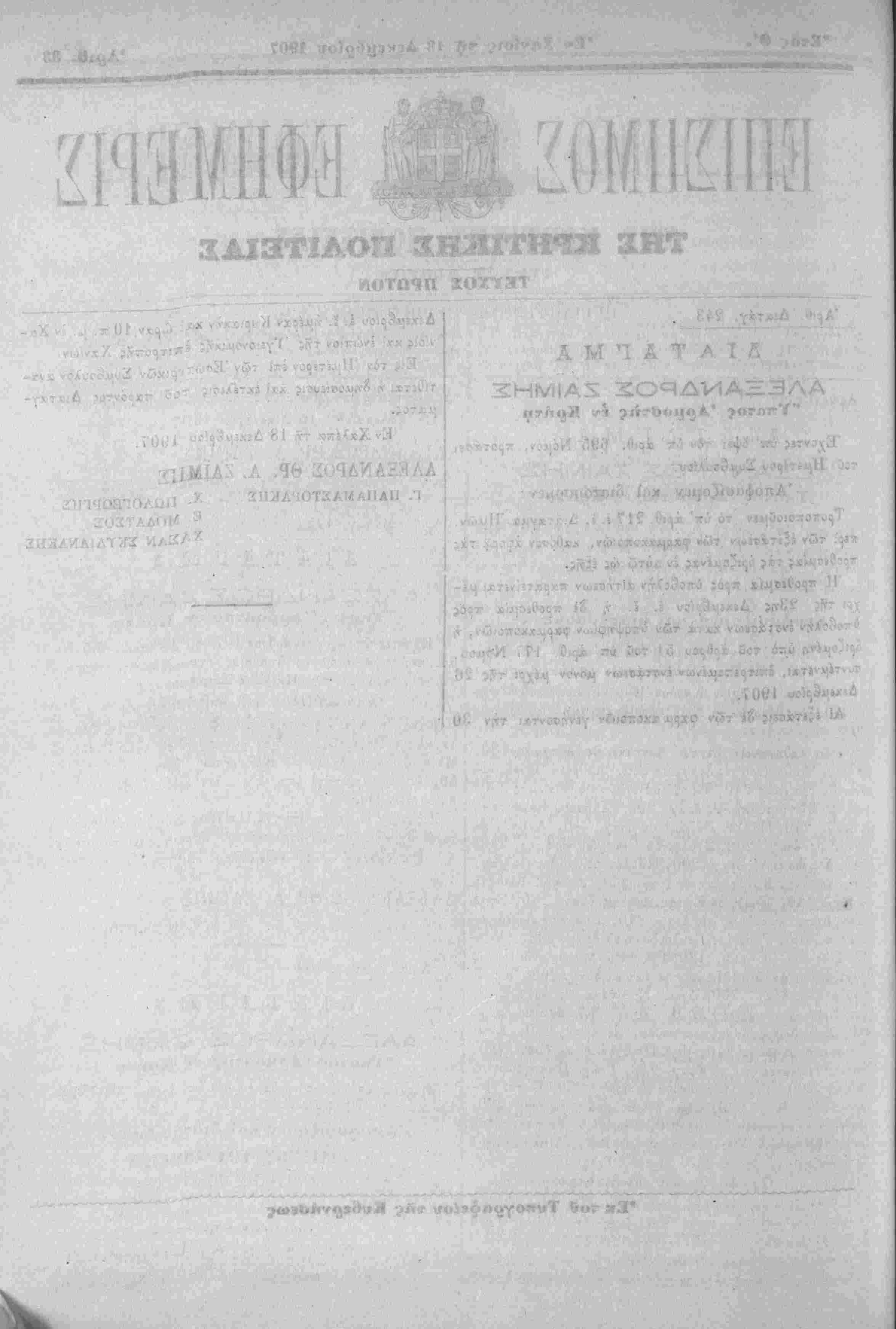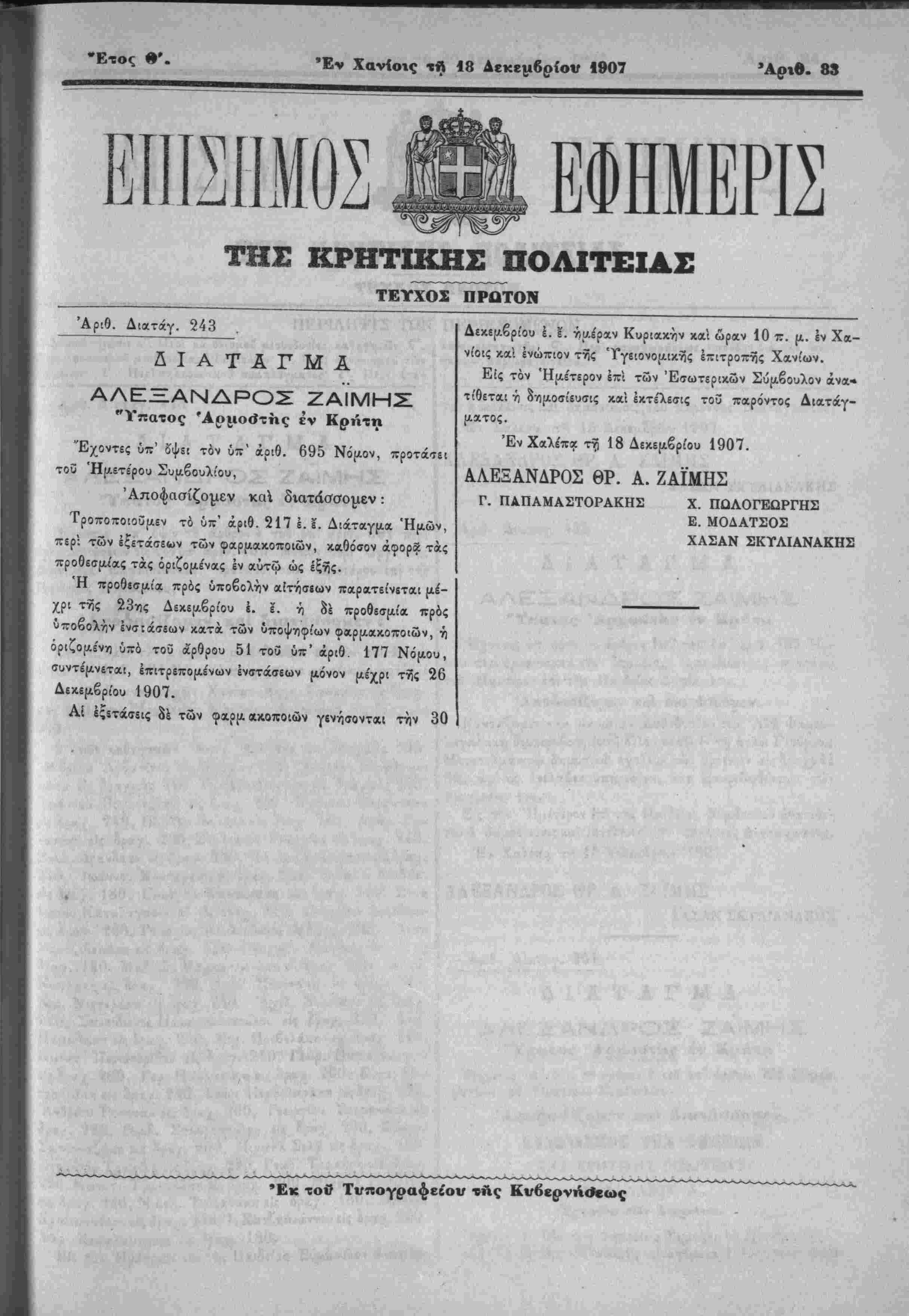 Έν Χανίοις τΛ 18 Δεκέμβριον 1907