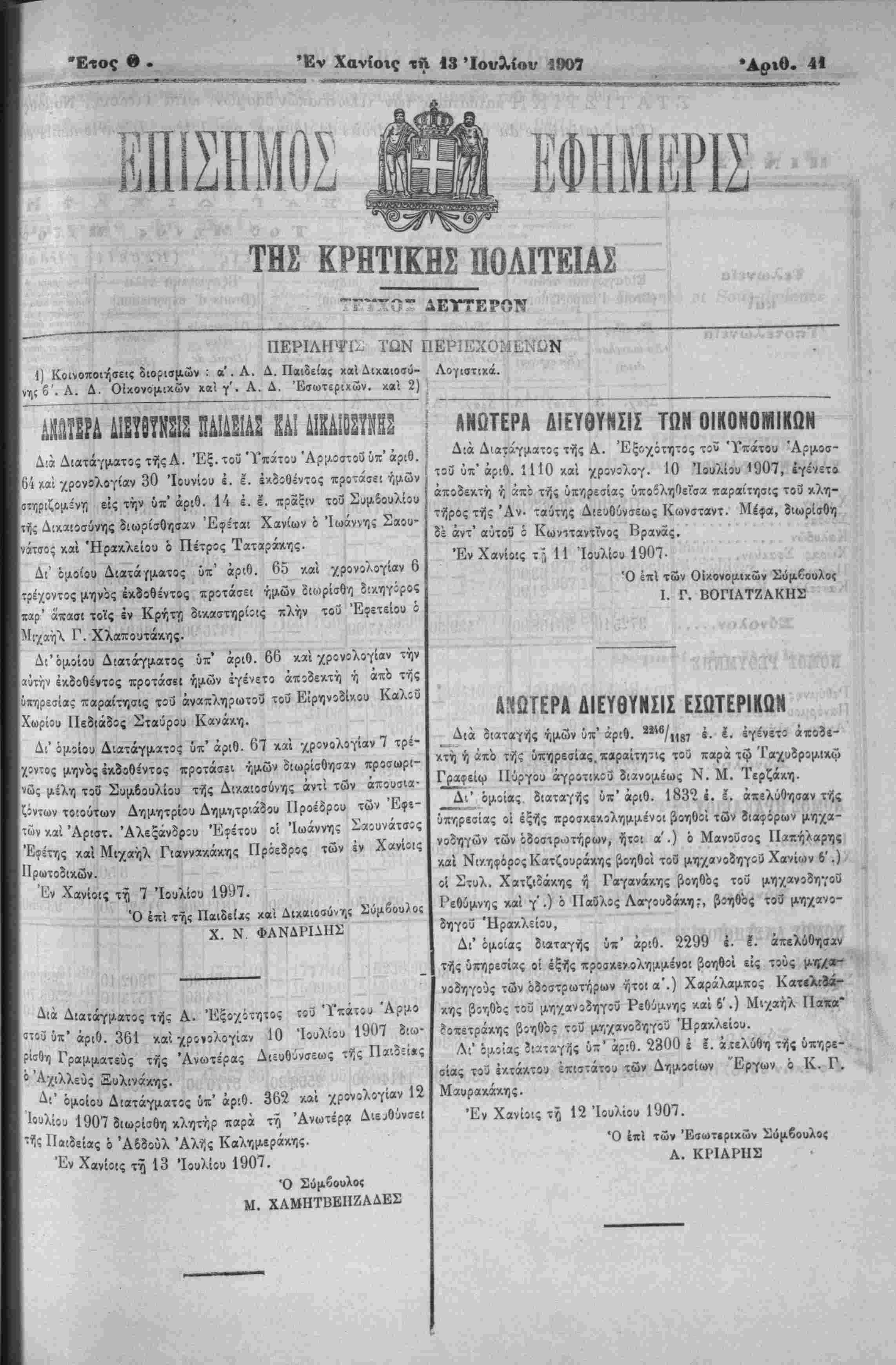 Έν Χανίοις τ<) 12 Ιουλίου 1907. Ό επί των 'Εσωτερικών Σύμβουλος Α. ΚΡΙΑΡΗΣ