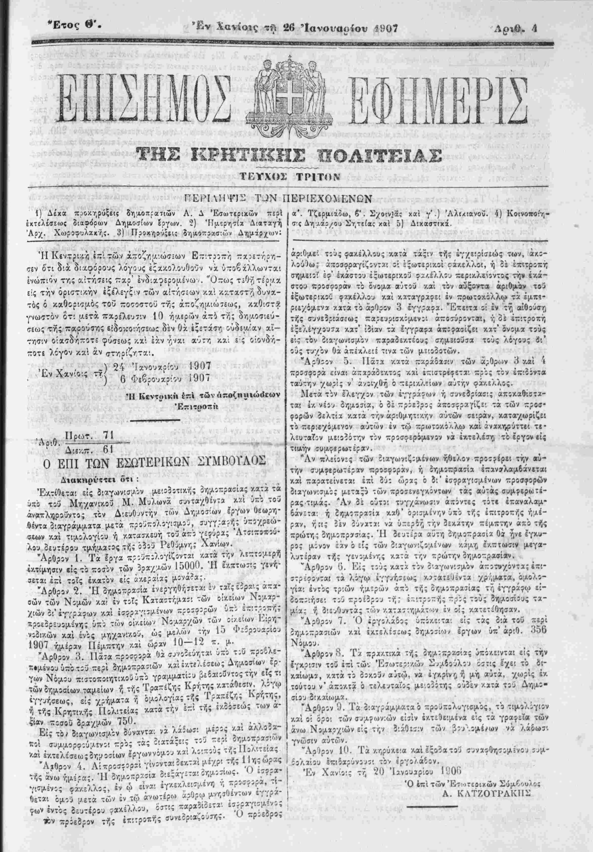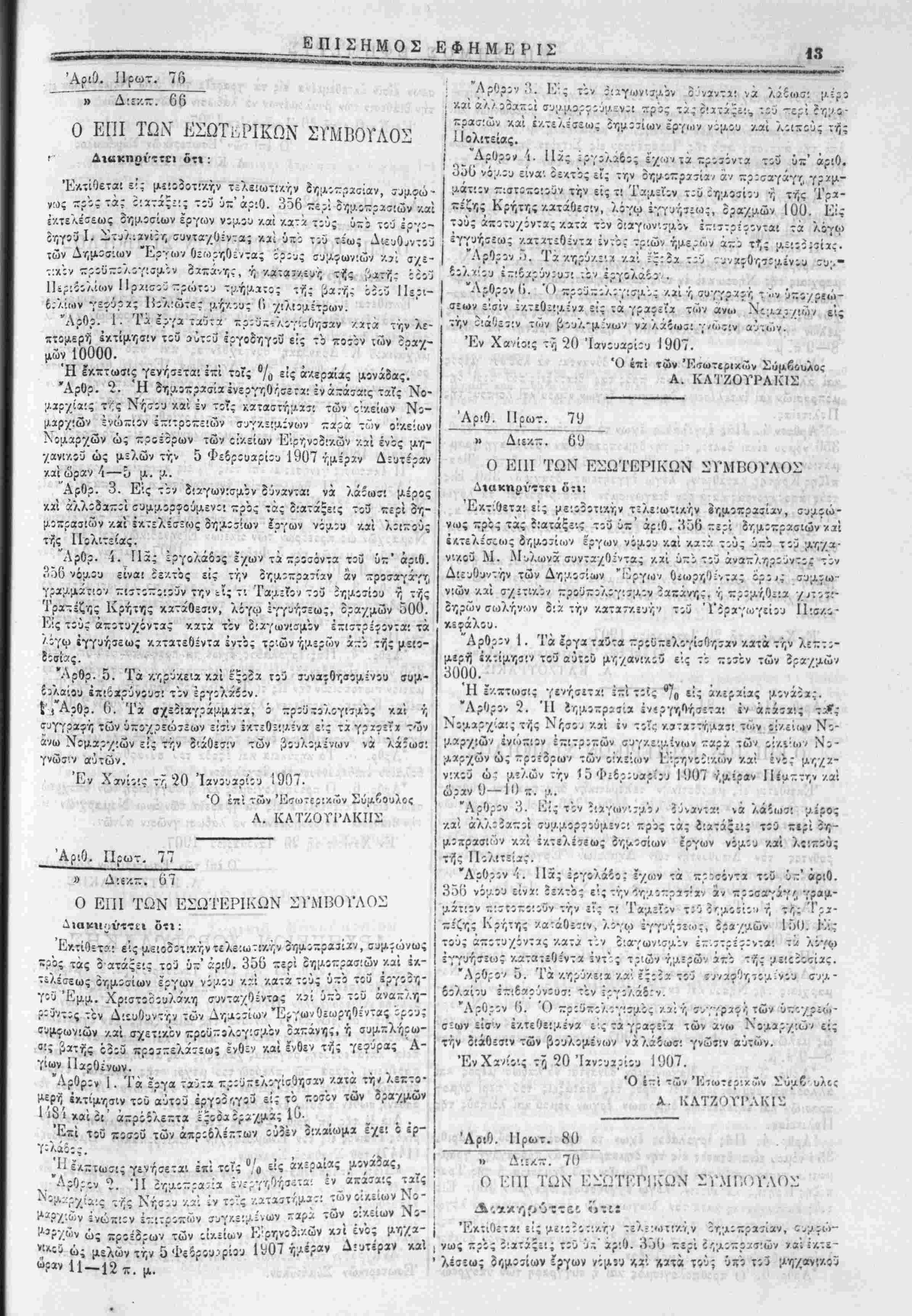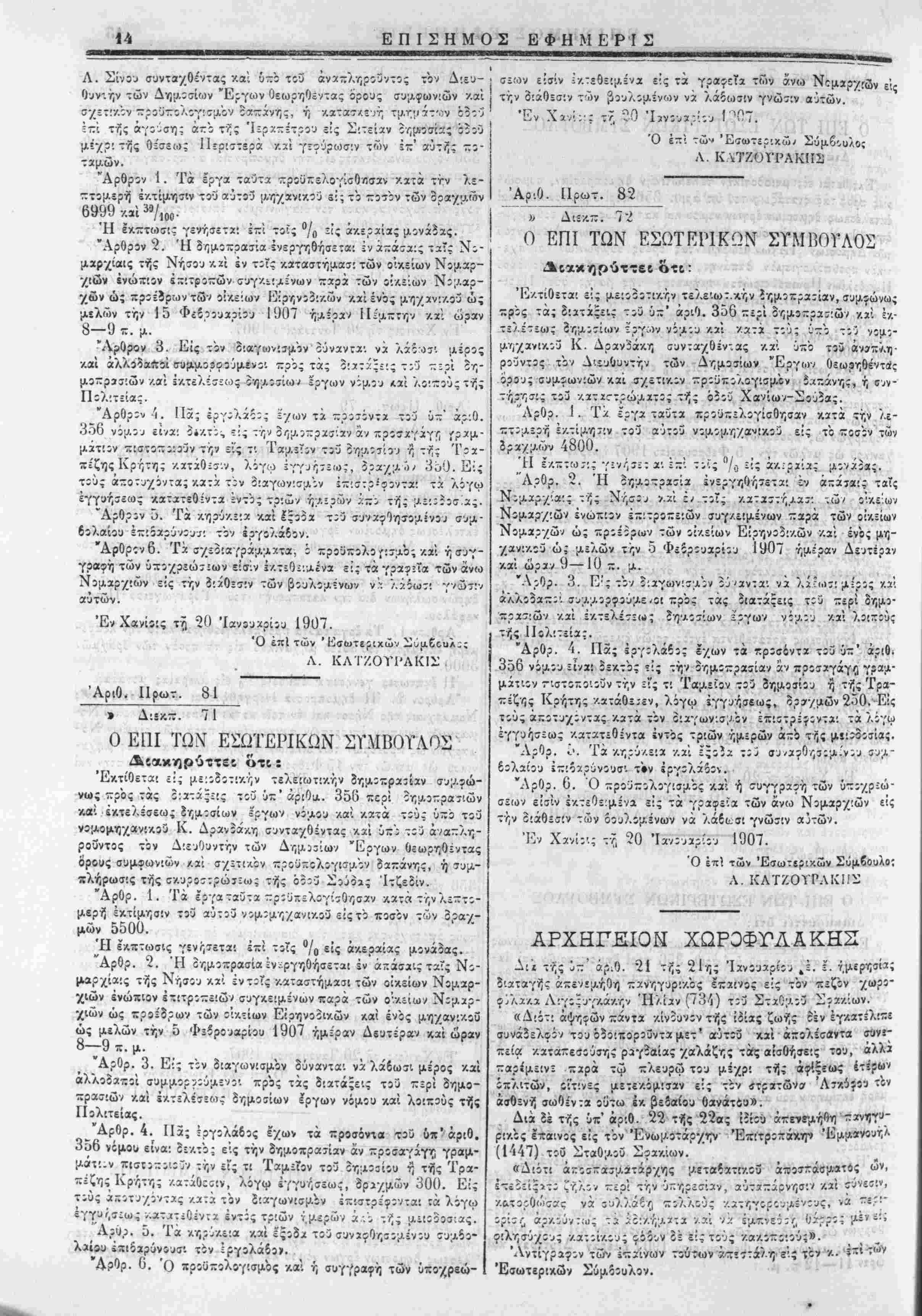 είς την όριοτι/.ην έςέλίγξ<ν των αιτήσεων κ,χ; ν.ΐ.τχατχ, δυνχ- η, ,; ,, οϊα'ϊδήποΤί φύσεως /.*'; εάν ήνχι χύττ-, /.αί ε ς οιονδή¬ ποτε λόγον ν.·Δ άν (Γ-Υΐρίζττχ'.. ,,, ν , -) 24 Ίανουχο'ου 1907 Εν Χανίοις ττ; ο , Ρ , ;αι~ ) ο ΦίΌρουχριου ιυϋ / Ή Κεντοικί» έ?:1 τωνήηοζηη»ώό"εων ΠΕΡιΆΗΨΓ-1 Τ_Ν ΠΕΡΐΈΧΟλιΕΝΟΝ 1) Δέχα π^οκτ,ρύξεΐί δηαοπρατιων Λ. Δ Έσωτεριχών — οί ι α'. Τζιρμιάοω, β'. Σ/θινΐα; χαί γ'.) Άλι/ΐίνοΰ. ί) Κοινοποίν,- έχτελέσεως οιαιρό'ρων Δημοσίων έργων. 2) ΊΤμερηϊίϊ Δκχτζγή Ι σ·ς Δηαάρ/οι> Σητείας χαί 5) Διχαστιχά.