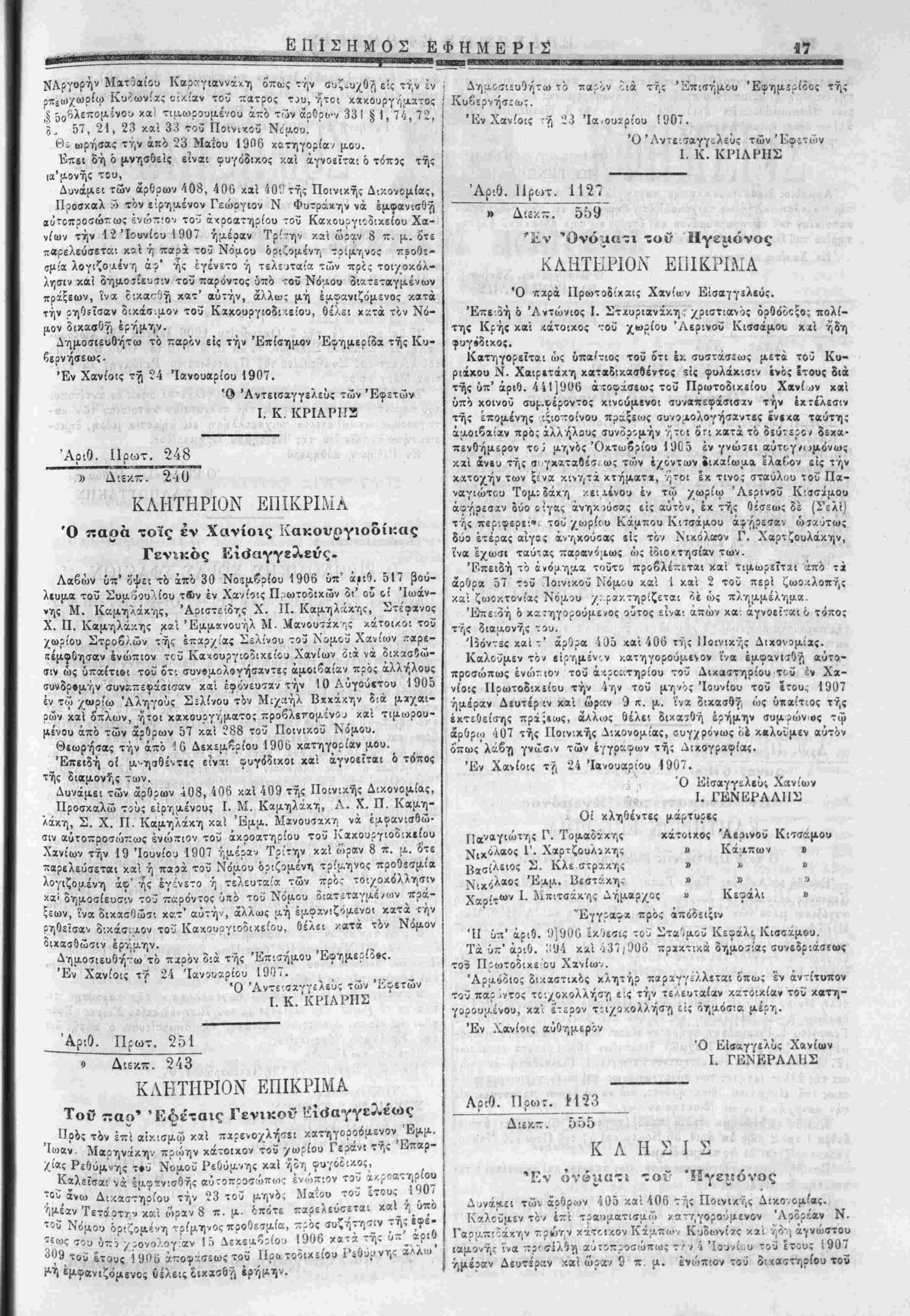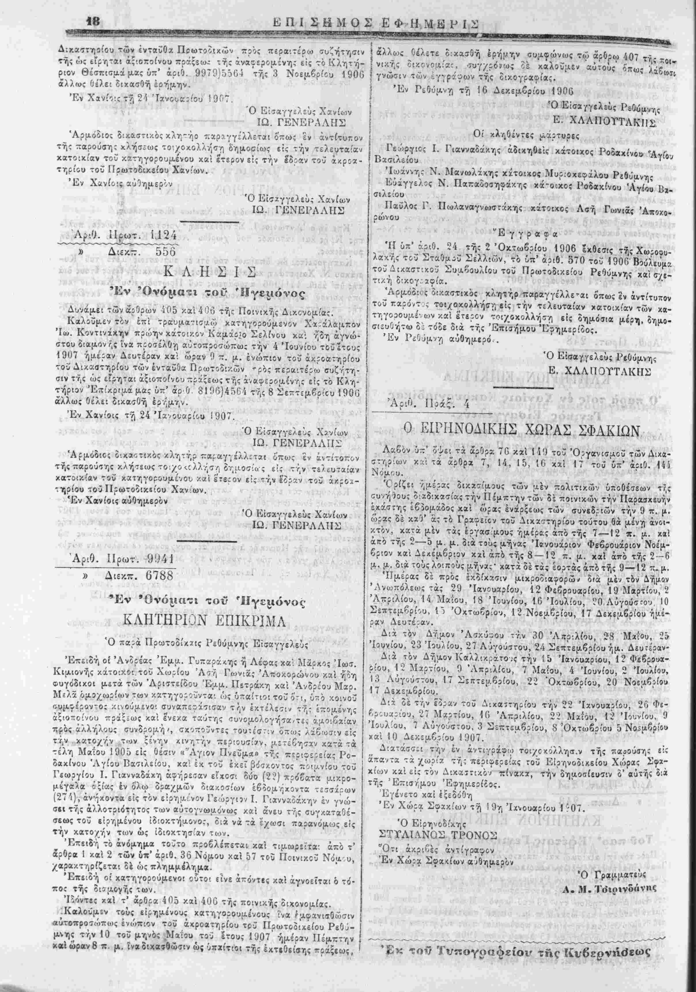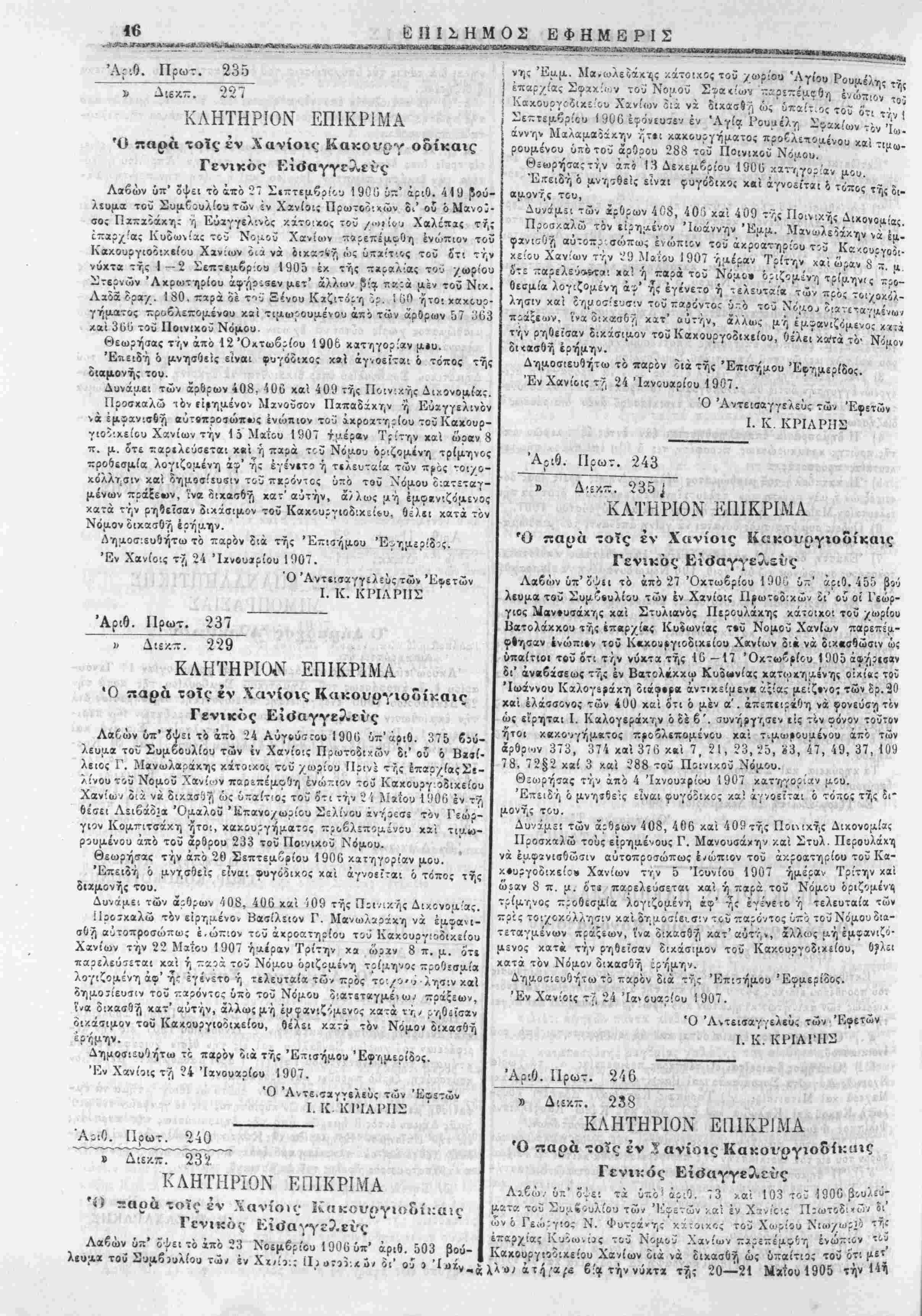 άρθρ<·) Ί()7 τής ΙΙοΐνιχής Λΐχονοαίας, ουγ/ρονως όέ χ«λ·.μεν αυτόν όπως λαβτ) γνιΐσ.ν των εγγράφων τής Λιχογραφίας. Έν Χανίοις τ?, Ίί Ίανουαρίου 1907. Ό Κίσαγγίλιΰ; Χανίων Ι. ΓΕΝΚΡΛΛΠΣ Οί χληθέντες μάρτυρες |]αναγιώτης Γ. Τομαονχτ,ς χάτοιχος Αί οίνου Κίΐσάμου . ΧαρϊζουΛ-^/.η; » Κάιπων ο ς Σ. Κλε στραχης » ,; ι>