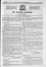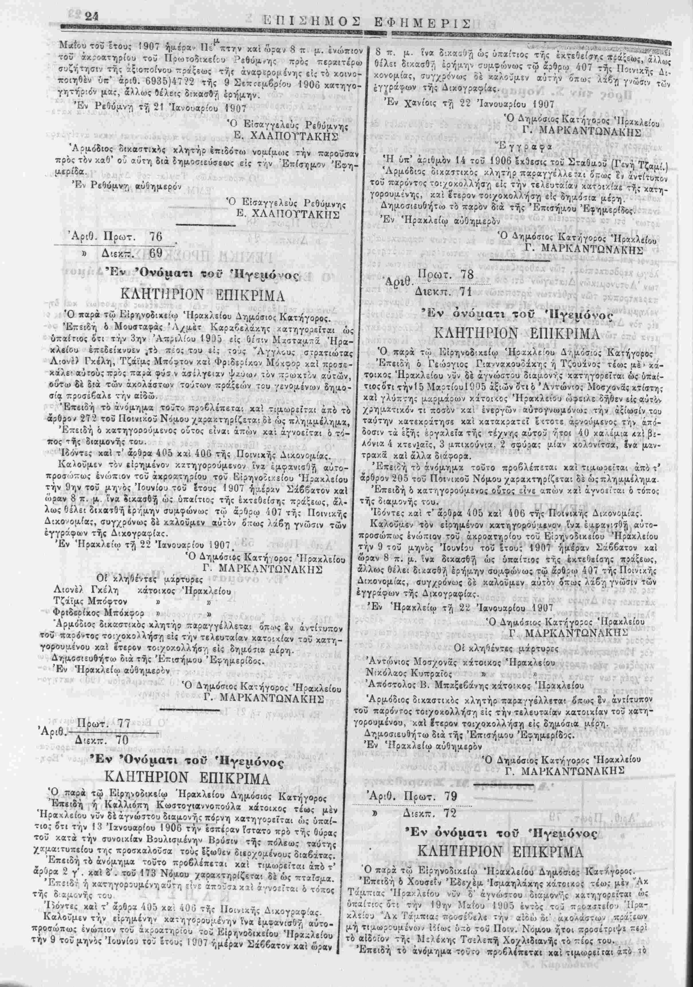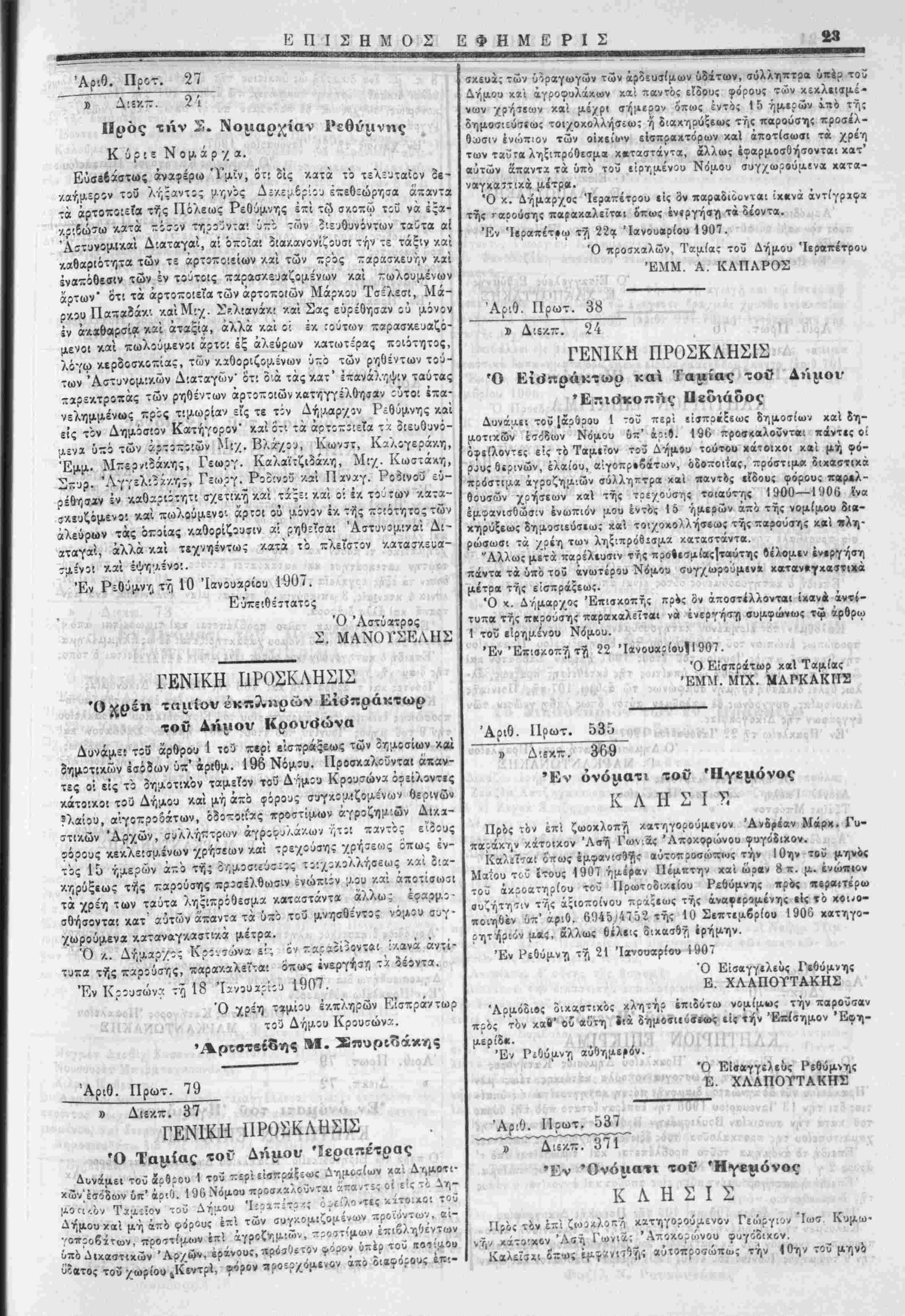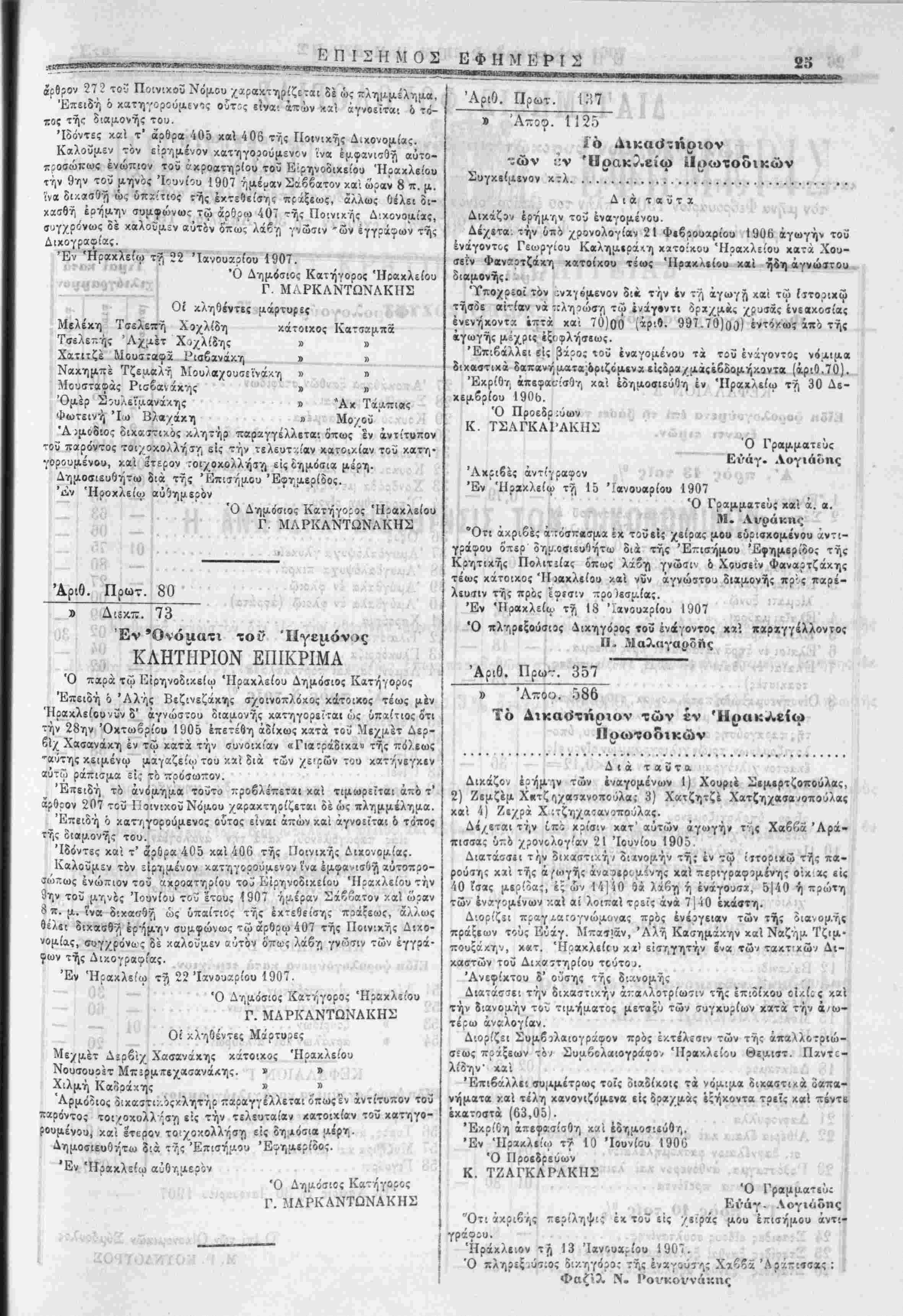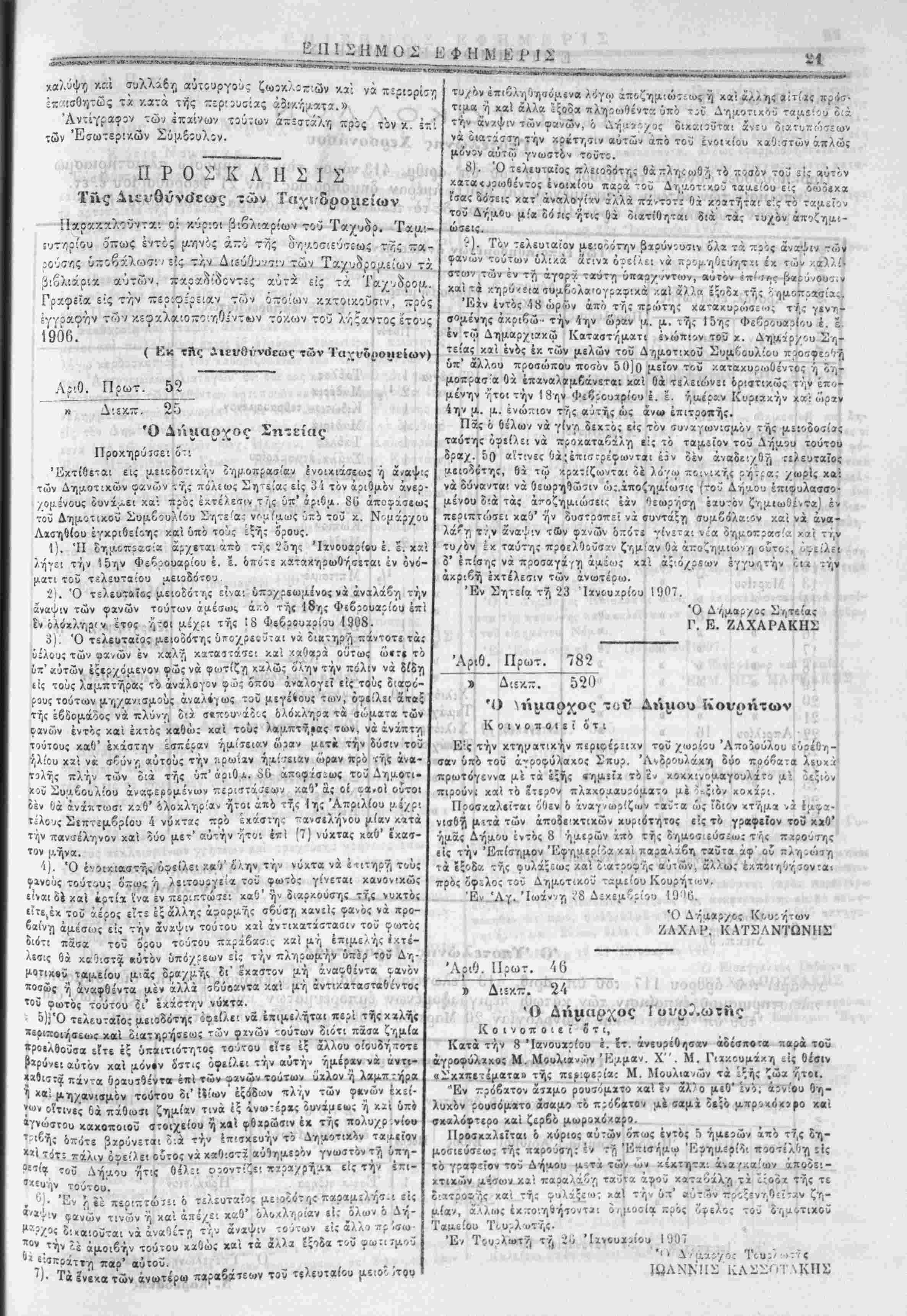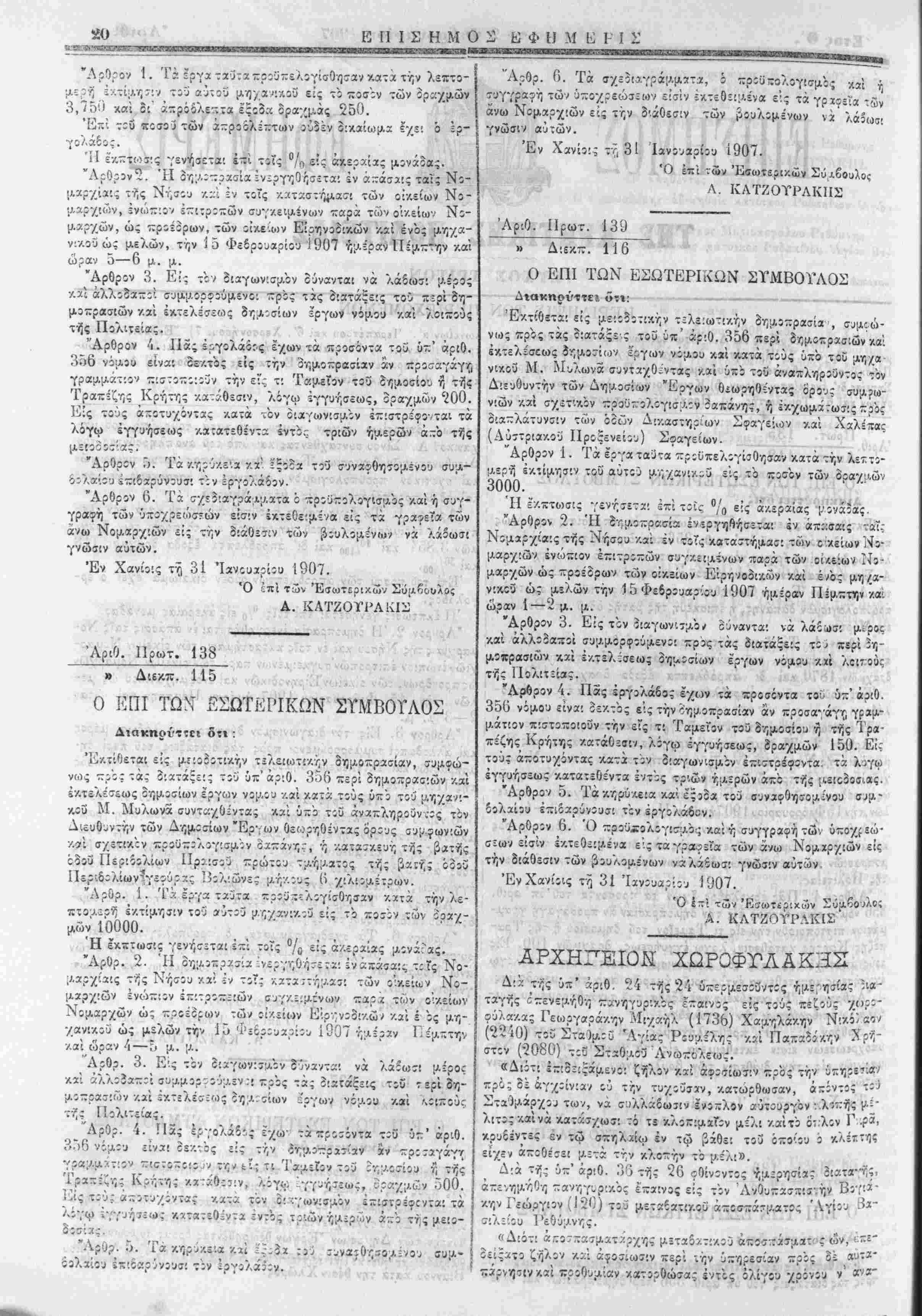 ααρχίαις τής Νήσου /.:.': έν τοίς 7.."<τχστ"0^.αί·! των οί'/.είων Νο- ΐ/,αρχιών, ενώπιον επιτροπών συγκειμένων καρά των ο'ΐ7.είων Νο- μαρ-χών, ώς προέορων, των οί/,είων Είρηνοδιχών /.αί ενός μη"/^- ν:τ.οϋ ώς μελών, την 15 Φεδρουαρίου 1907 ημέραν Πέμπτην /.αι ώρα·ί ο—6 μ,, μ, "Αρθρον 3. Εί; τί> διαγωνισμόν δύνανται να λά6ωσ: μερίς