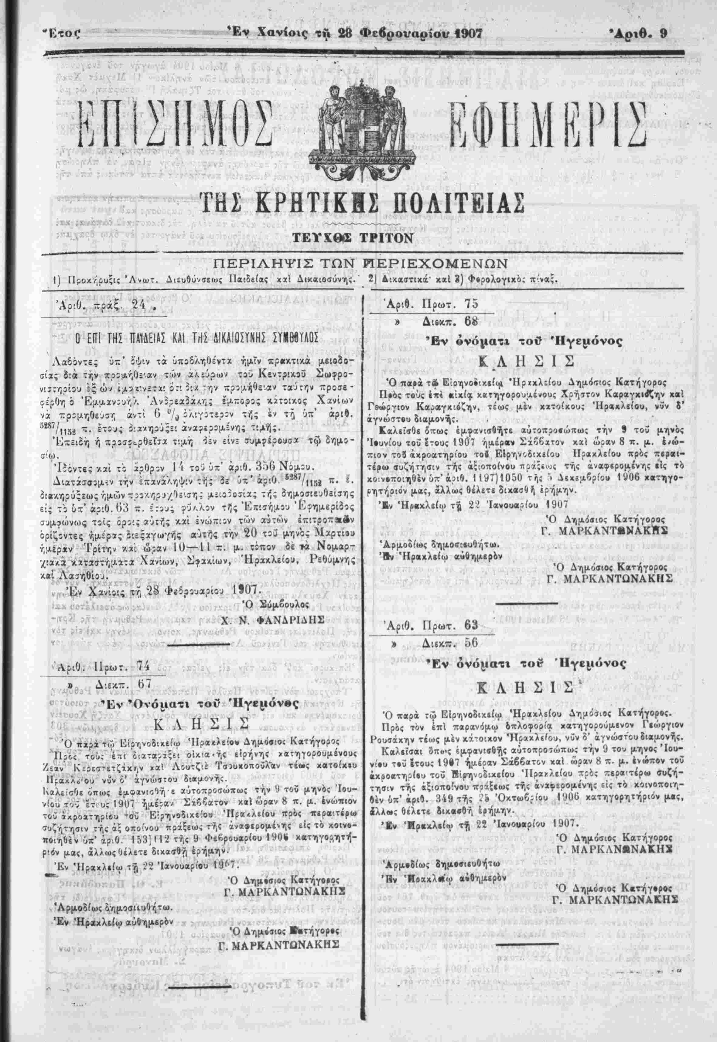 Πρός τβίις έπ< «ίχί» χκτηγορουαένους Χρ^τον Καραγχιε^ην χαϊ Γεώργιον Καύαγχ'.όζην, τέως μέν χχτοίχοιι; Ήραικλΐίου, νυν $' άγνώστβυ διαμον-η;. Καλίίΐθε όπως έμφανιβθητε αύτοπροίώπω; την 9 τοϋ μηνός Ίευνίου τοϋ ετους 1907 Ημέραν Σχίδχτον χχί ώραν 8 π. μ. ί<ώ- πιον τοϋ άχροατηρίου τοί Ειρηνοδιχίίου Ηραχλείου πρός πιραι- τέρω βυζήτησιν τής άζΊοποίνου πρά;ί«ς τής άναφβρομένης είς το χοΐνεποιηθίν ύπ'ά;ιθ. 1197)1030 τής "ι Λιχεαζρίου )0θ6 χβτηγο- ρητήριον μας, άλλως θίλετϊ διχαοήΙΊ ίρήμην. 'βν ·Η(.«χλε(ω χ% ϋ Ίανοκβίίου 1907 Ό Δημ<{βιος Κατήγορος Γ. ΜΑΡΚΑΝΤβΝΑΚΗϊ Άρμο&ίως δημοβικυήήτω. 'Βν Ήραχλιίω αυθημερόν Ό Δημόσιθί Κατήγορος Γ. ΜΑΡΚΑΝΤΩΝΑΚΗΣ Αριθ. ΙΙρωτ. 63 » Διεκπ. 56 Έν ονόματι τα» ΊΙγεμόνος ΚΑΗΣΙΣ' Ό παρά τώ Είρηνοδιχίίω Ήραχλείου Δηαο'σιβς Κβτήγορβς. Πρός τον επι πβρανΊμω βπλοφορία χατηγορούμίνον Γιώργιθν Ρουσάχην τέως μέν κά-οιχον Ηρακλείου, νυν δ' αγνώστου διαμονής. Καλιϊσαι δπο>ς ί(χφανι»!)γις αυτοπροσώπως την 9 τού μηνός Ίου-
