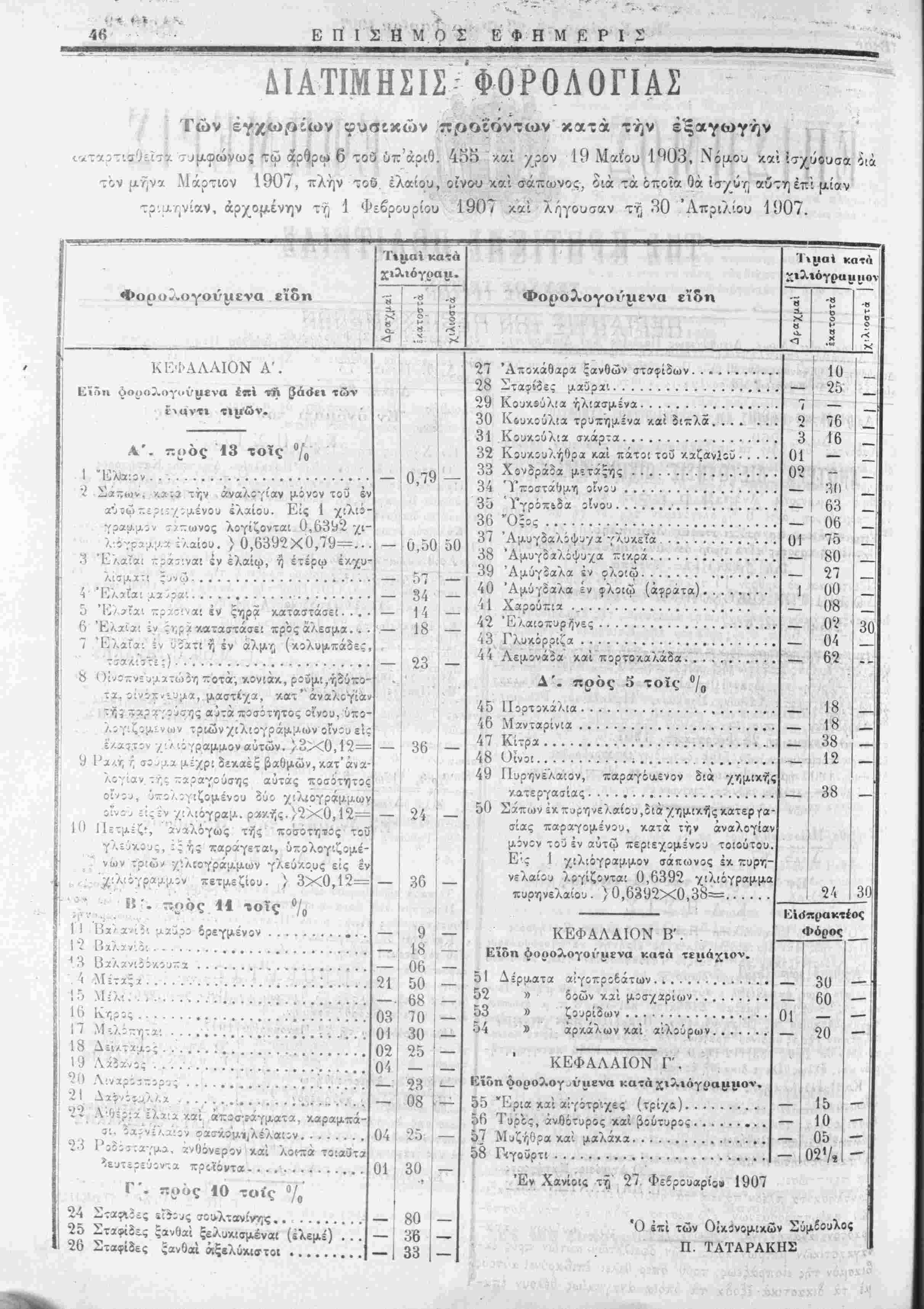 ον ι/.Γ,ν7 Μάοτιον 1907, πλήν τοϋ ελαίου, οίνου καί σάπωνος, διά τα οποΐα Οά ισχύν] αυτηέπ: μί»