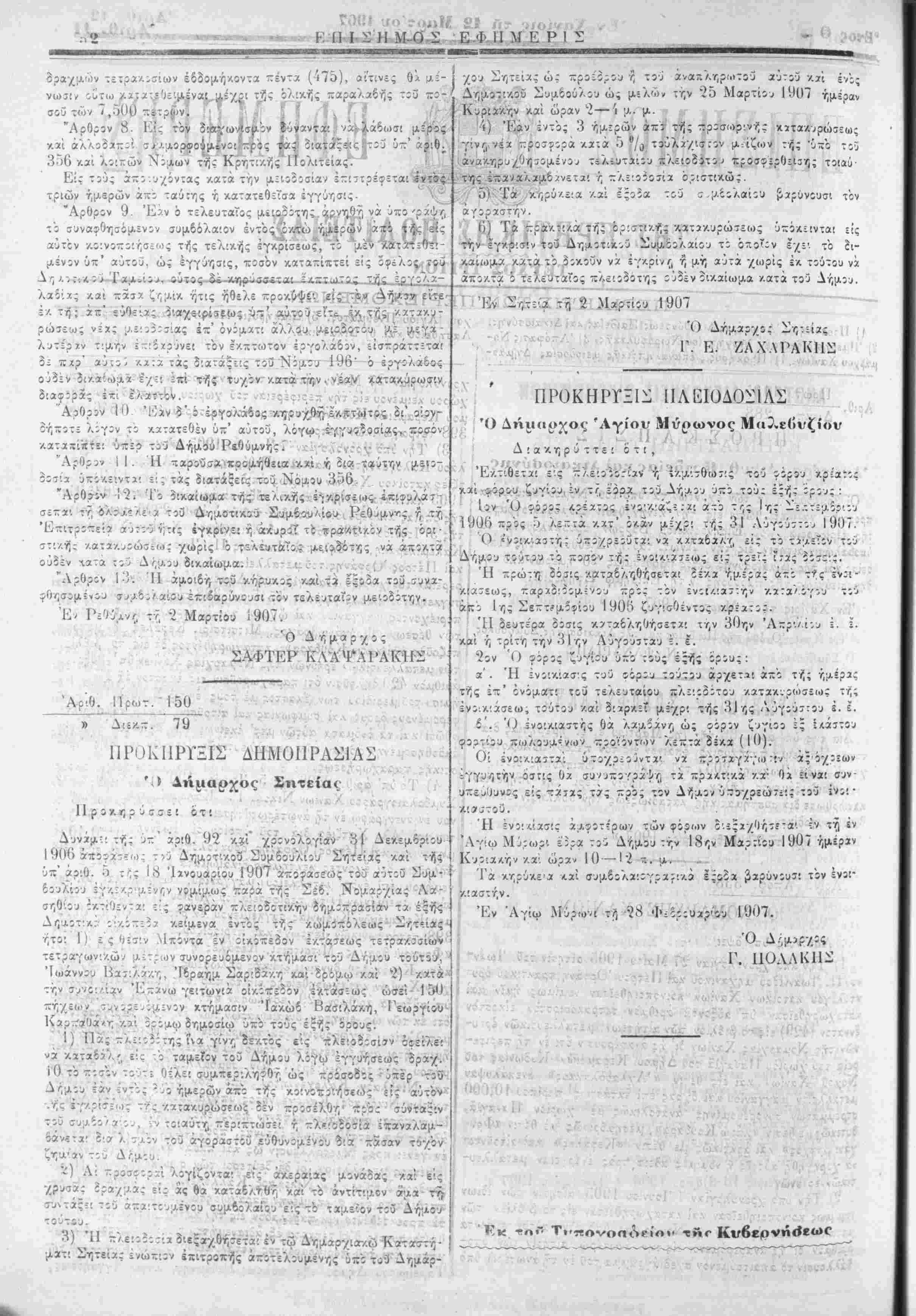 "Α(ιΙ)ρ<)ν 0. Ή μειοίοσία είναι τε/.ειωτικτ, ν.α: θα διεξίχθή φανερά ίν τώ Νι,Αβρχιακβ ΚαταϊτόΐΑϊΤ·. Ρεθήμνης, ίνώπιον Έπιτρο-ής συγκειμίνης έκ τοΰ Νομϊρχ;υ Ρεθήμνης ώς ΙΙροέ- δρίυ, τοϋ Είρηνίΐικου Ρεθήμνης, τ;υ Δημxρχο^ καί τί Ο Μηχα- νΐΛϊΰ Ρεθύμνης ή των άναπληρωτών α^τών ώς μελών, την 12 Μαρτί:υ 1907 ημέραν Δευτέραν καί ώραν 9— II π. μ. Άρθρον 7. Πας μευδόττ,ς ίνα /· δεκτός ϊϊει/.ί· νά πρ-ϊβα- γάγο γραμμάτιον καταθέσεως τ.αρτ. τζ Γ,-ατκζτ, ΚρΓ,της ή τώ Ταμείψτού Δήμνβυ τής χόλεως Ρεθύμνης, λόγω ίγγυήοίως,