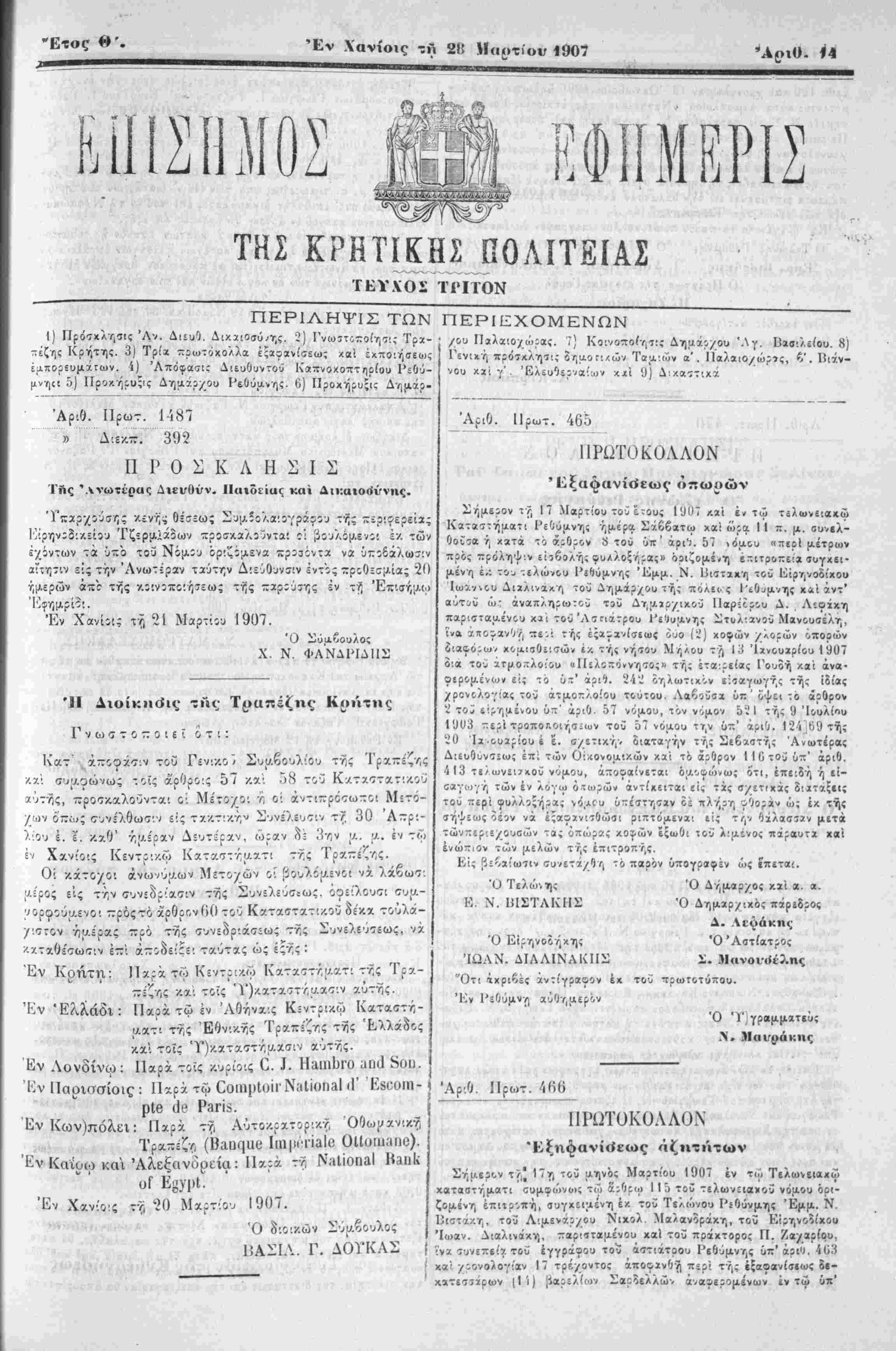 'Κν ΙΙαοισσίοις: Π~ρά τώ ΟοιΐΐρΙυιΐ'ΝαΙιοΐί&Ι <Γ Έδοοΐη-1 νού κα; γ' Έλευθ5ρ^α;ων άχι 9) ρΐθ (Ιθ Ρ3ΓΪ5. | Έν Κων)πόλεχ: Παρά τ-?, Αύτο/.ρχτορικ·/: Ό0ω(;αν!κ·? Ι Τραπέζα (Βαικ)αΐ3 Ιια|«·ι·ίαΙο ΟΙΙυ»ι;«ηο). ΈνΚαίοω και'Αλεξονυραα: Πχ:ά ~0 ΝπΙϊοηαΙ ΗΙ υί Ε»Υΐ)1. Έν Χανίοις τϋ, 20 Μαριου 1907. Ό διοικών Σΰμ^ουλος Ρ,ΑΣΙΛ. Γ. ΛΟΓΚΑΣ Αριθ. ΙΙρωτ. 465 ΠΡΩΤΟΚΟΛΛΟΝ ξφ «>πωρών