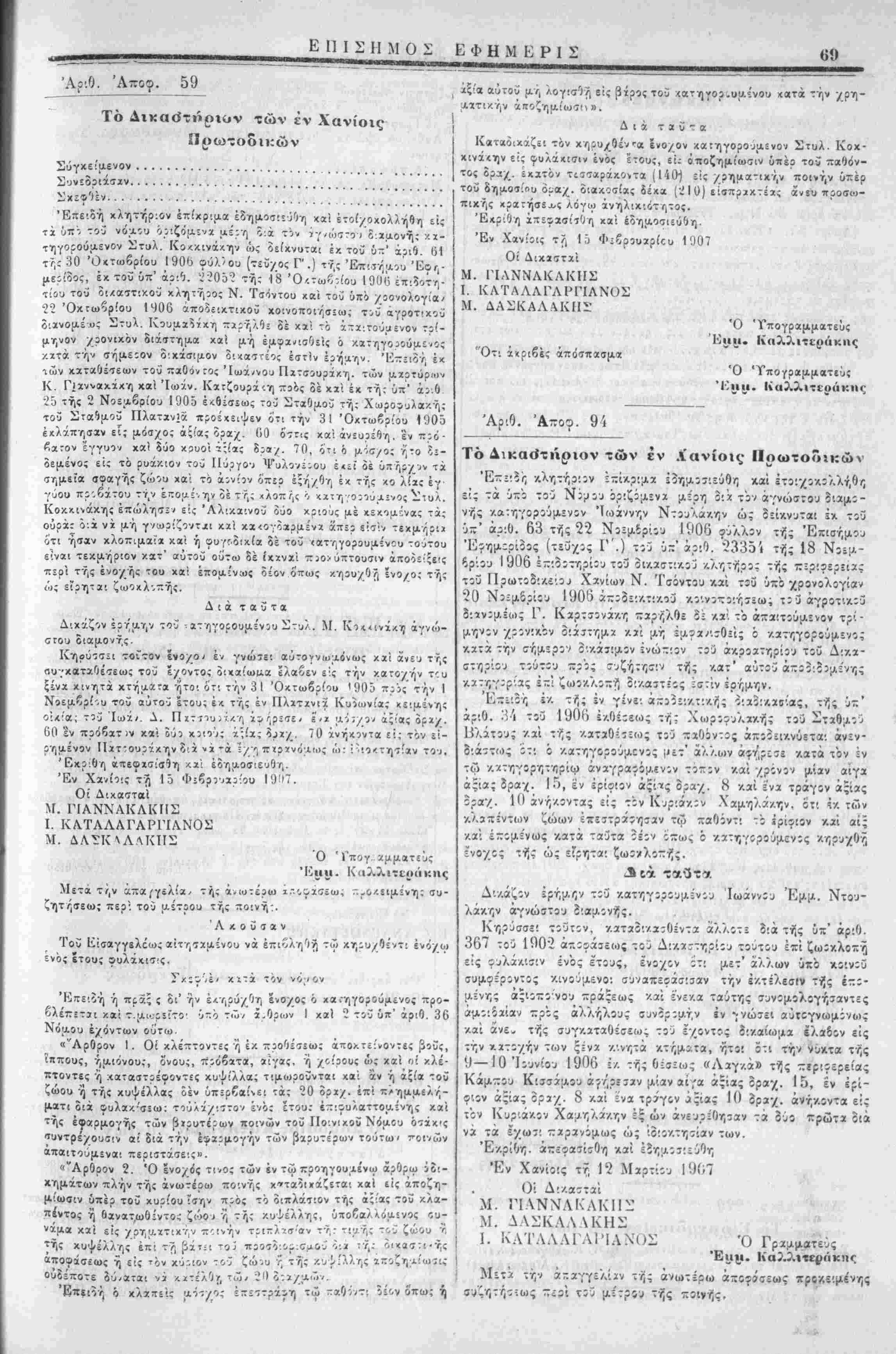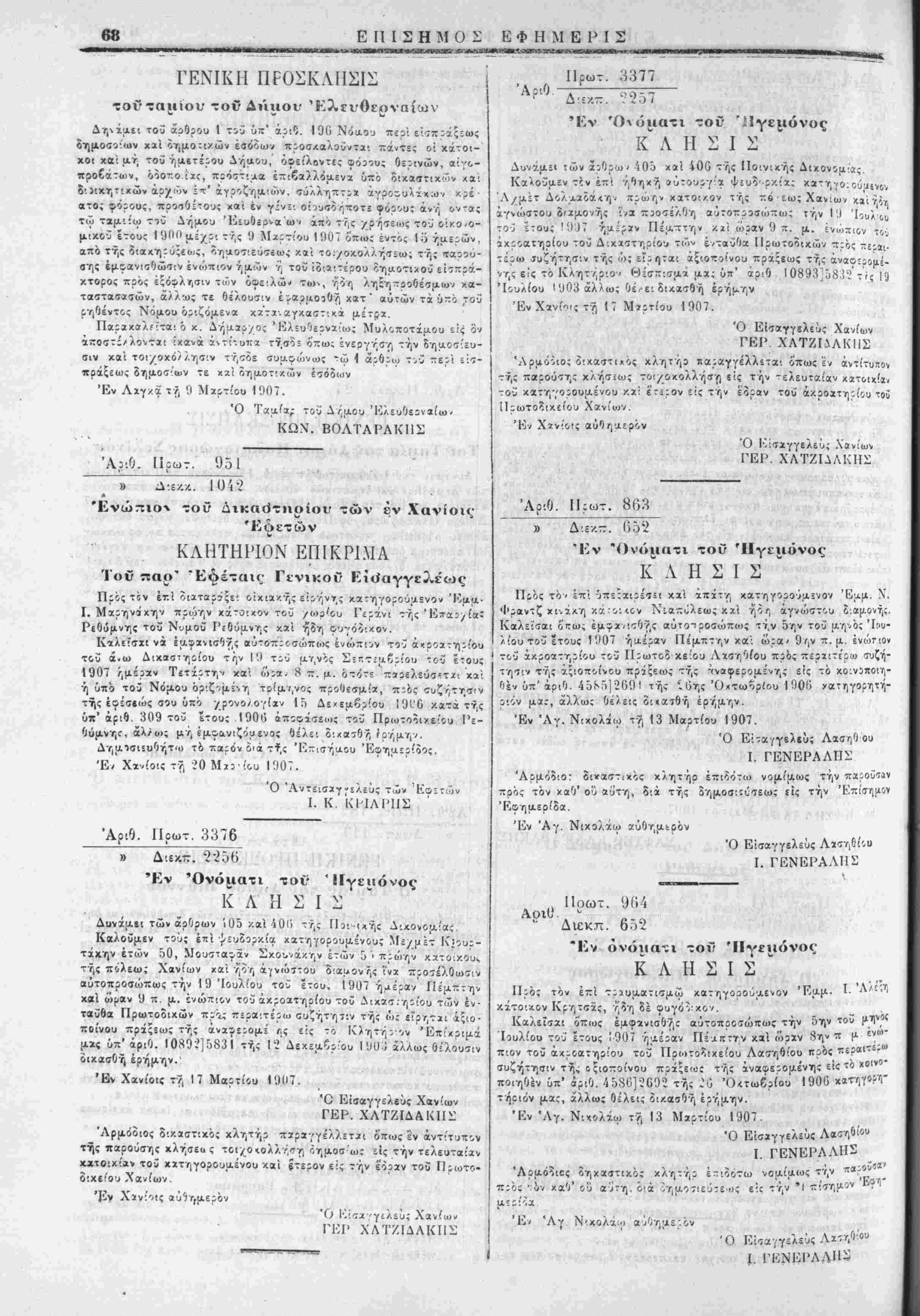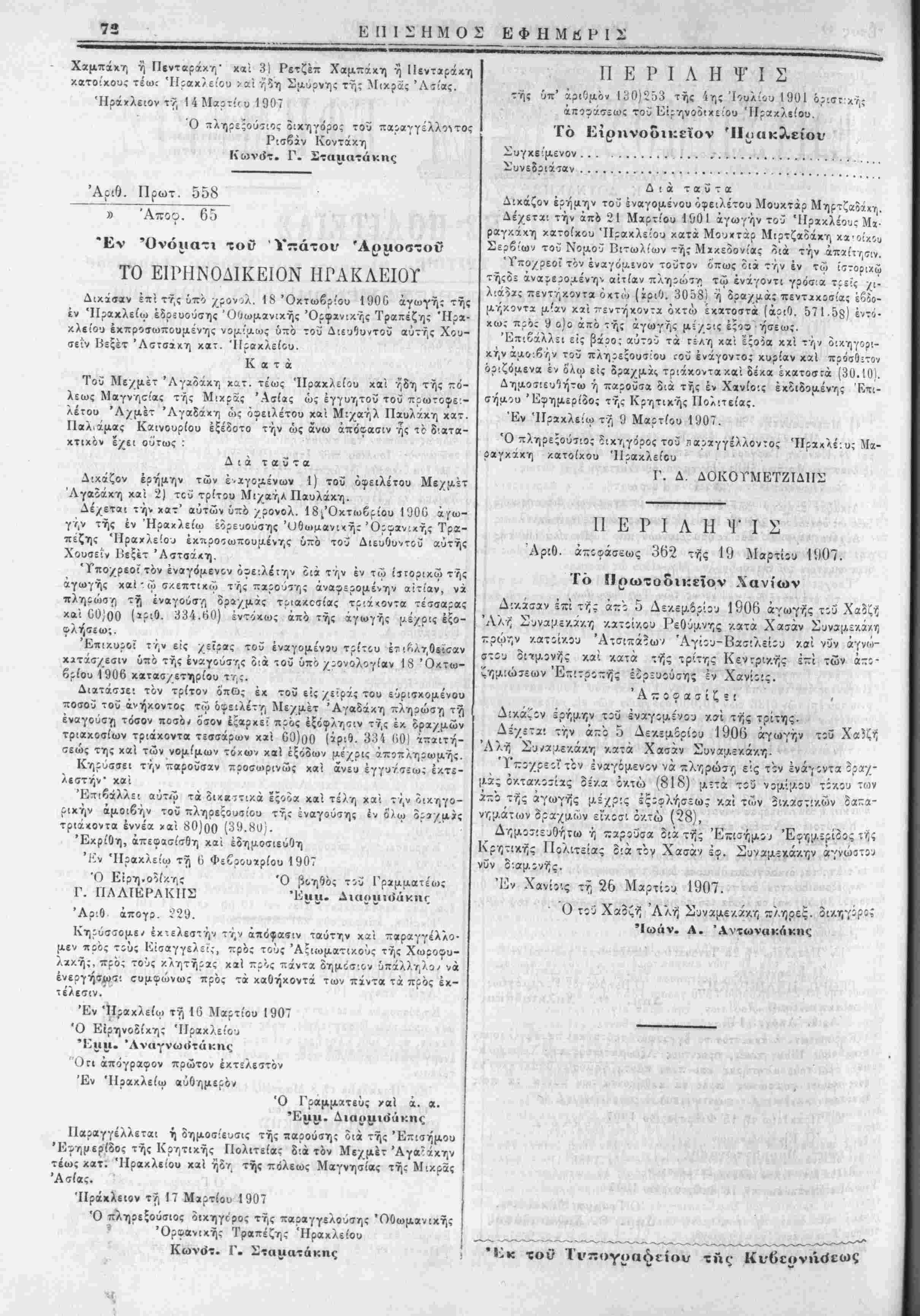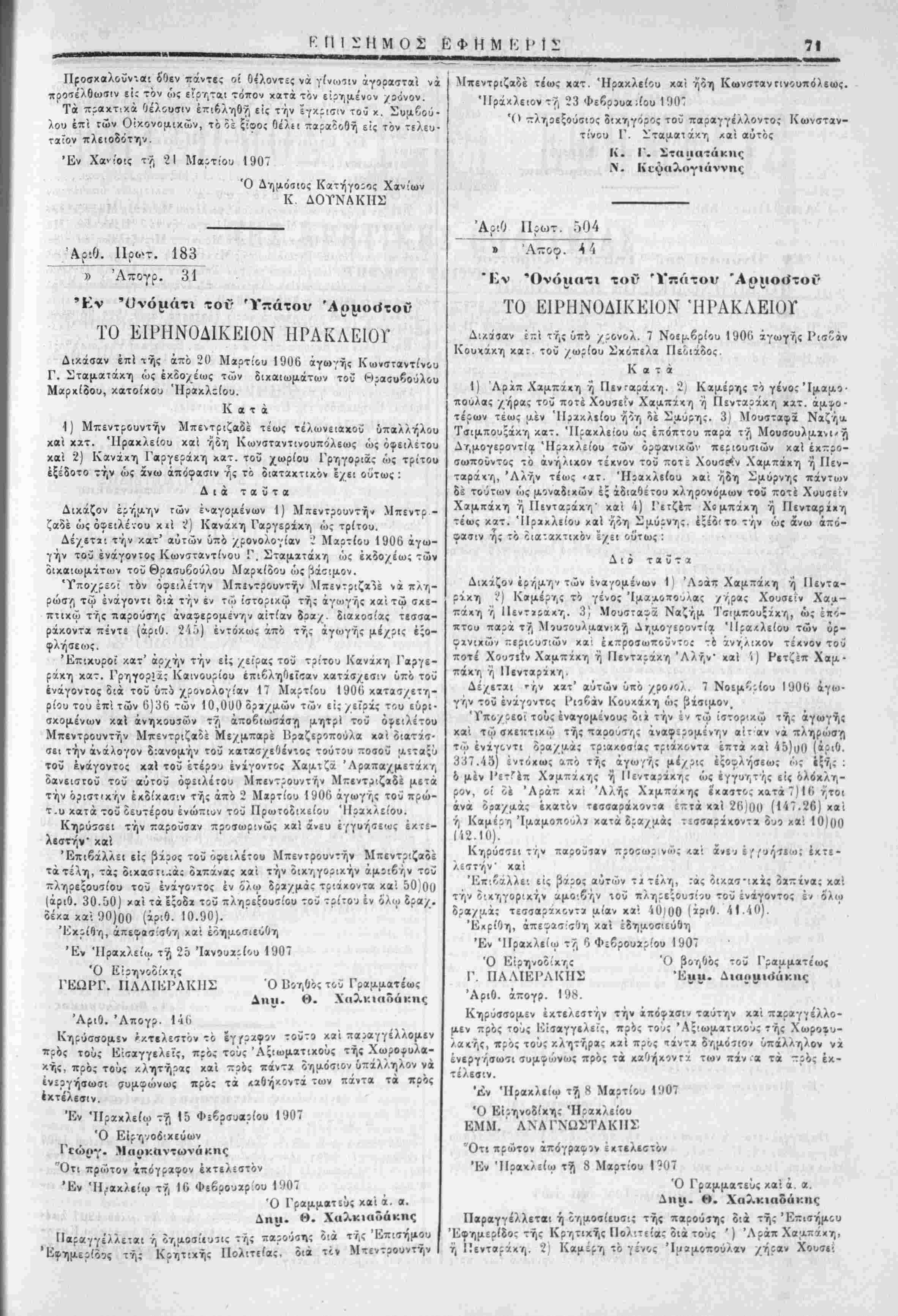 Άποοασίζΐΐ < Δικάζον 5?ήμην τϊΰ έναγίμίνου ν.ιπ τής τρίτης. Δέ-/ετα! την άπϊ 5 Δεκίμδρίου 1906 άγωγήν τοδ ΧαΚ»; Άλή Συ«με·/.άκη ν.ατά Χασάν Συναμ=/άκη. 'Γπ/ρεοΤτόν έν«γόμενς.ν νά ζληρώστ, είς τϊ:ν ένάγοντα ί?^χ- |».άς όκτα/.οσίας δί'ν.α όν.τώ (818) μ?τά τίύ νομίμου τΐκου των χ-Ό τής άγωγής μέχρις έξςφλήσϊως -/.αί των ;ι·/.αστ!/.ών οα'ϊ- νηματων δραχμών εί'/,οσι όν.τώ (28), Δημο-ίίοθήτω ή παροΰσα Βιά τής Έ-ισήμυ Εφημερίδος τ'ΐ; Κρητικής Πολιτείας 8;ά τϊγ Χασάν έφ. Συναμεχάχην άγνώατ;^ νυν δ'.οίμΐνής. Έν Χανίοις τή 26 Μαρτίιυ 1907. Ο τί3 Χαοζή Άλή Σϋναμε/,άκη ζληρεξ. Ιωάν. Α. Αντωνακάκη*; τοι? τής Κιτο'εονήσ'εως