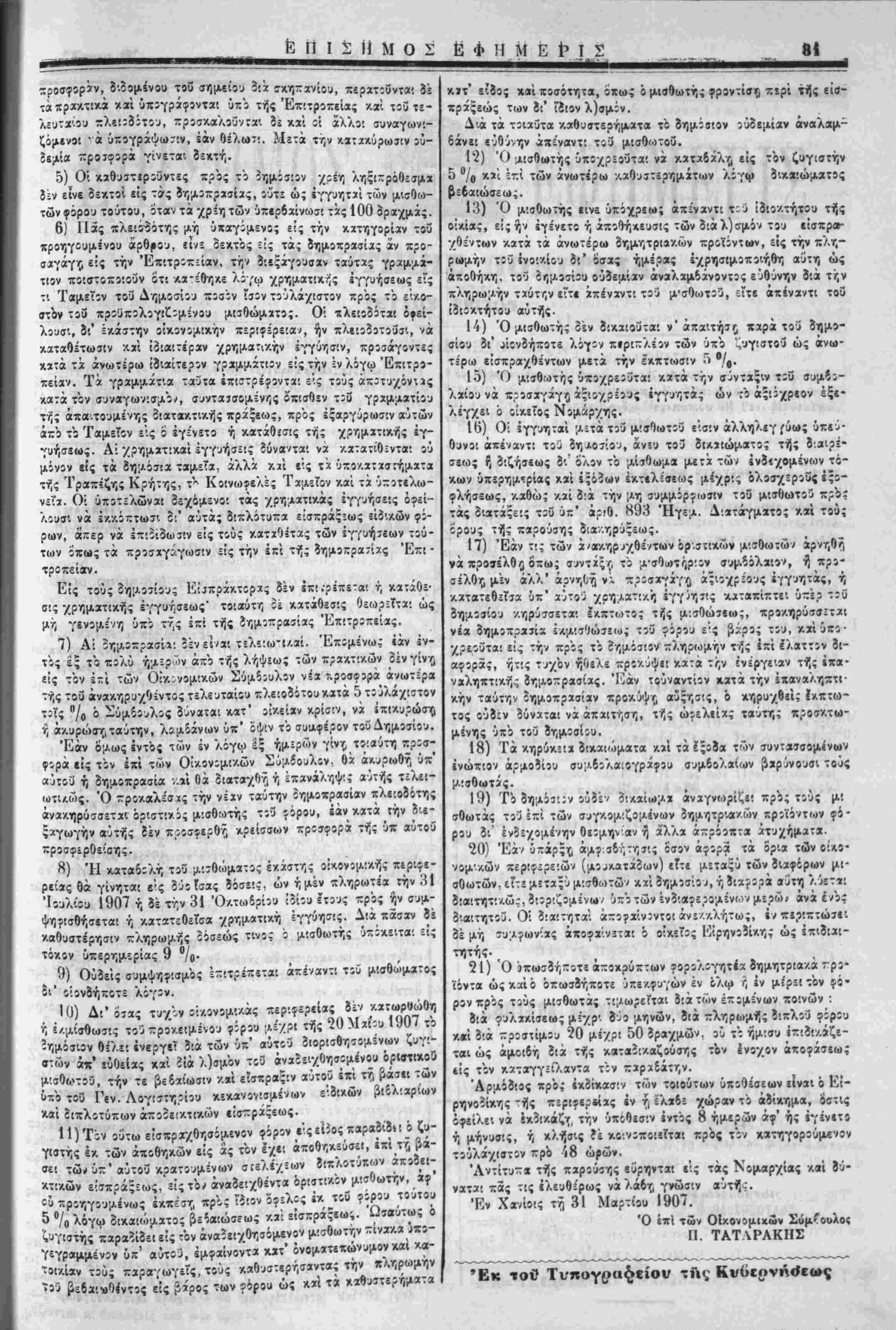 ΙΙ(»Ι ίκα»ϋ0ώο"ιω<; τού φόρον επι των <ίι/γκομι<.οι»ένωνι δηυητρ*ακί« «ροΐόντων παντός ε'ί^οι/ς ό^ά , ; ' τό,ετος 1007 ,. , Ο ΕΠΙ ΤΩΝ ΟΙΚΟΝΟΜΙΚΟΝ ΣΥΜΒΟΥΛΆΣ Δκακηρύττει ότι: ιγ ,,,.^γ__.γ—,'.',".λ^ · '/ Ό Φόρος έπϊ των συγκιμιζομένων οημητοια^.ών ϊρ'οϊόντωνι · „-{ χ/υ^ν.4'..... ,αντός εΓδο,ς, ά^νά εισί τα εξής : '«| ^^_1' . α .— Ο σϊτις, ή κριθή, ή βρώαη, ό χρα;ό*ίΤβ'ς, !ή ύί 28) 29) ,30) Κάμ*ο: 31) ΓΛ „ 32) Βρύσες λ3) νλΓν»"*>". "*'-'Ιί .-' 5 "-"'ί·