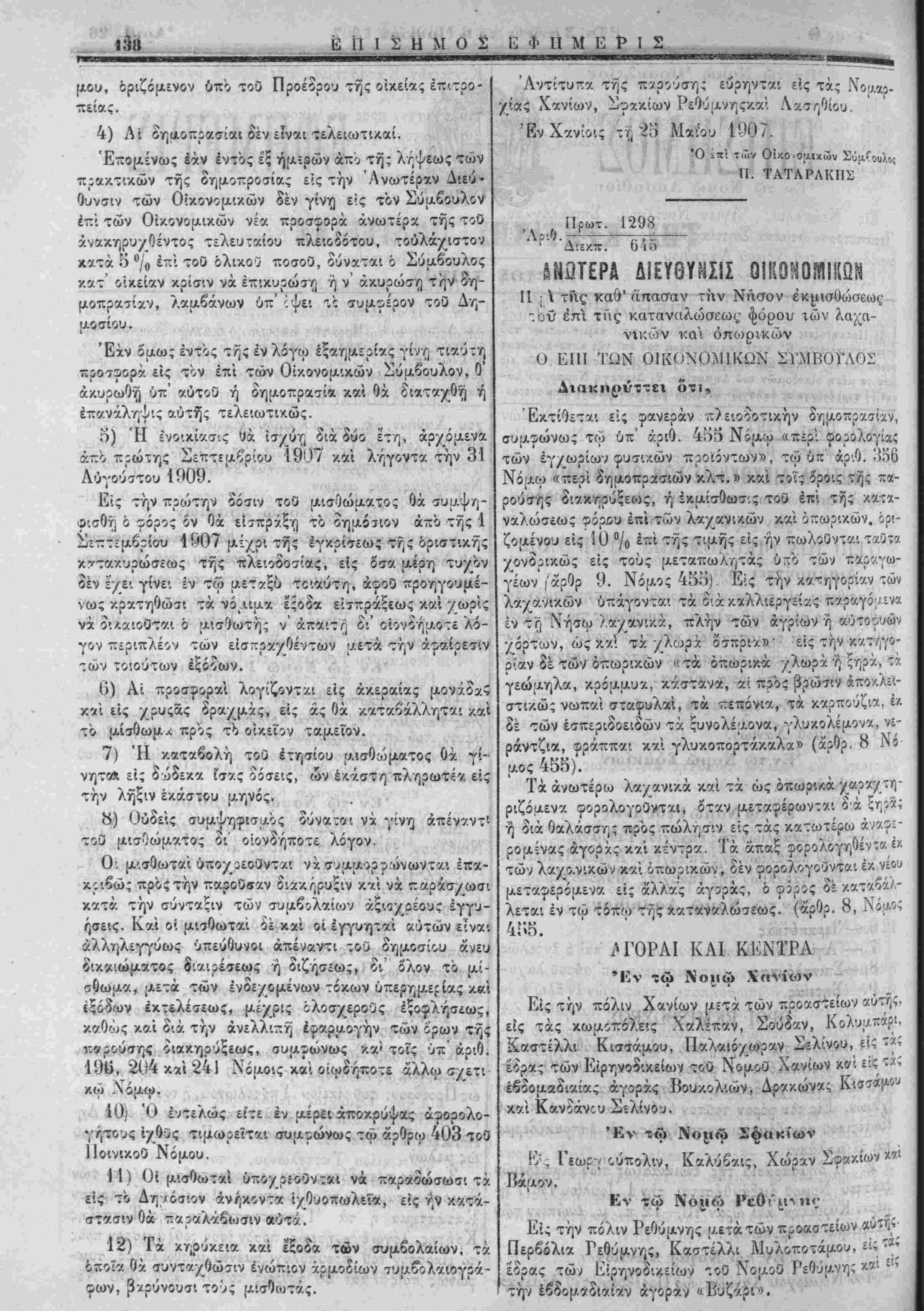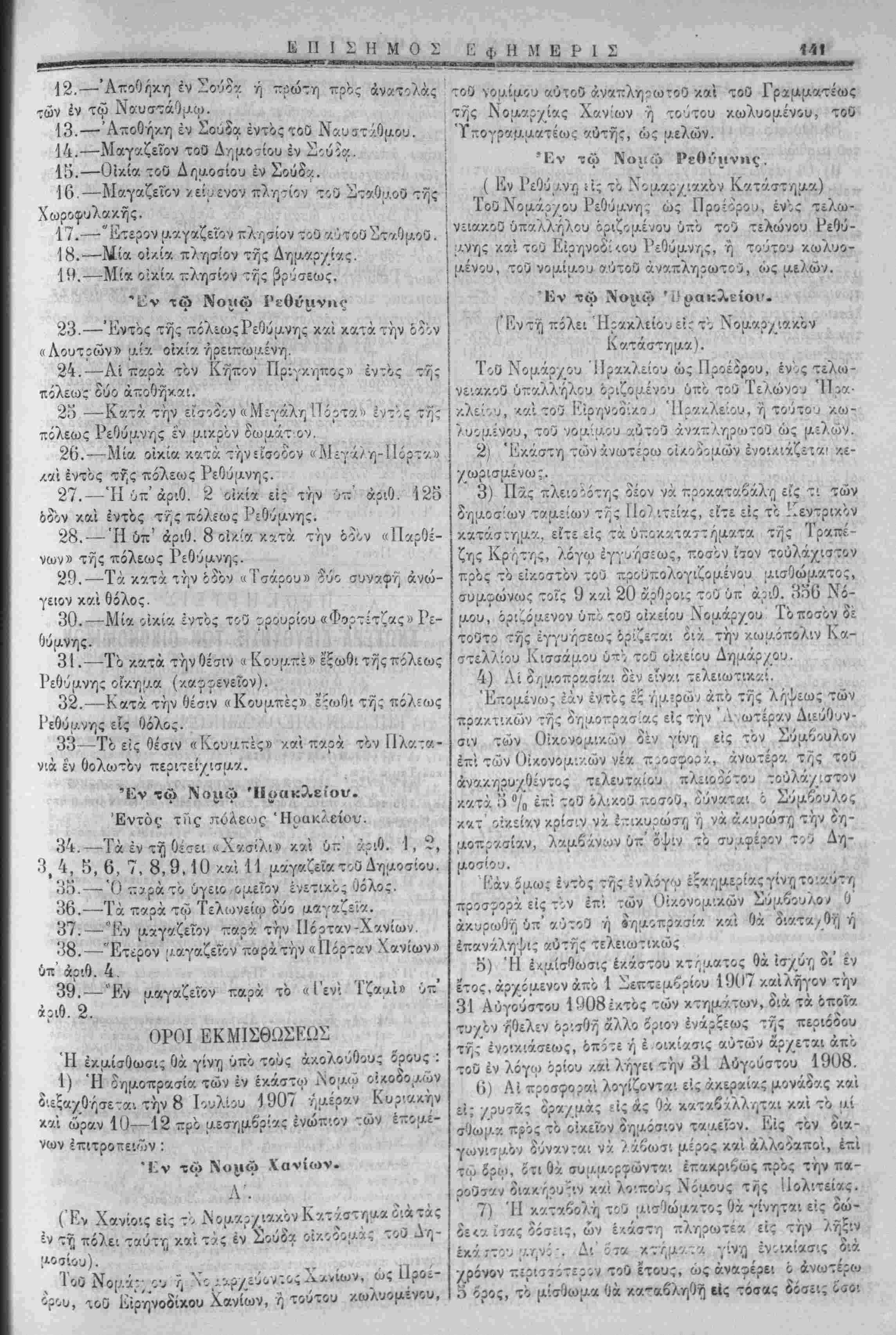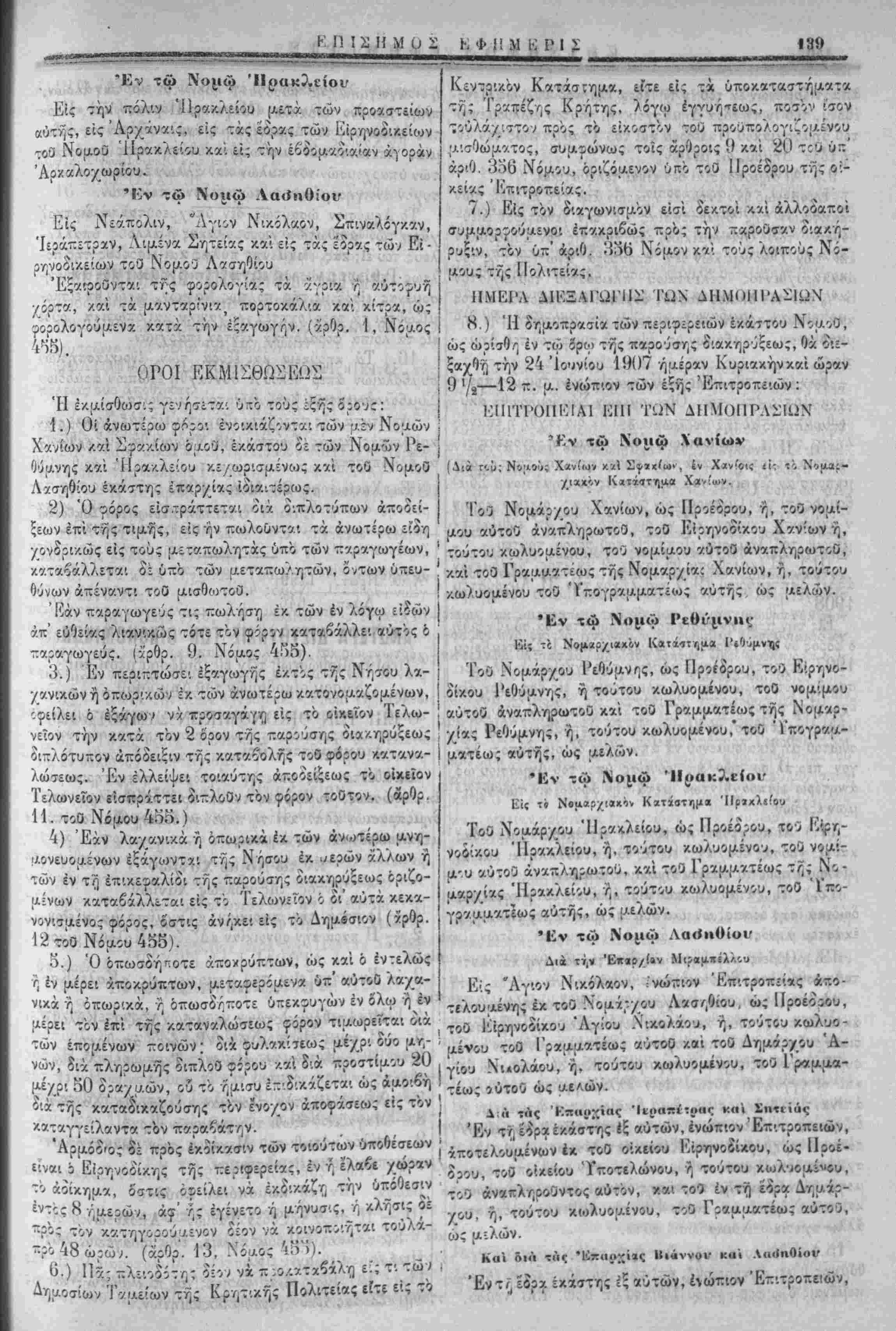 Ταμείον τοϋ Δήαου Χϊνί<ι>; ά»ε(λοντε; φόρον όίθίθιίοις τ<5ν Ιτών 1900 - 19'1ι, <ρό;αυ; φανώ/, σΐιγχο;* ζομε'νων προίιίντωΛ αίγβπρο- 6χτω/, ΤΓοόστιμϊ επί χ,'ροζημΐ'όν πρίτπμα ίπ'βληίίντ» υπό τώ/ διχαττ-.ϋών άρ/ών, δικΐιο'ιματ* 6δρολΐ|ψίας ώς χαϊ παν*ό; άλ/.ου εϊ- 5·.υςφό?ους των κεκλημένων χρήτειον 1900—1905 ίκ καϊ τής τοΰ 1900, 'ίιχ ϊ·'Λ; δεχαπέντ* ημερών άπό τής δηαοσΐϊύ»ιωί, ο·αχη;ύ· ξίως χά: τοι/^ο ιολλήσί',ις τής πχρούσης ποοσέλήωτιν ενώπιον ημών ώς κχί των Δημοτιχών ί'υπραχτόρΜ/ χιί έςοφλήτωσι τί /.ρίη τ<"·< ταυτα, καθόσον μίτϊ την ττίροδο/ τής ε'.ρηαένης πρ'/ϋίσμία;, θέ- λςυσιν ε'4χρμοσΟ?| κατ' αυτώ/ 'ί ύ.τό ου μνησθέντος Νό_λου *«γ- ενα χα' αναγχαβΐιχα μέτρα. Έν Χανίοις τ7, 5 Ίουνίου 1907. Ό Ταμίας τοΰ ΔήμουΧανίιον Δ. Χ.ΠΑΗΛΔΑΚΝΣ 'Κν ονόιιατι τοθ ΊΙγεμόνο·; ΚΛΗΤΗΡΙΟΝ ΚΠΙΚΙΊΜΑ Ό παρά τώ Πΐωτοδιχιίω ΐιραχίων Είσαγγελιύ: ν, οί Μα#οϋ»ος Ροϊίμης λάτοιχο; Άίκΰφου Σφακίων χαί ήίη αγνώστου διαμονήν, *ϊί Εύττρίτι&ς Ζοΰλη; χάτοι/.ος 'Λΐχύφου Σαχκίων. χατηγοροϋ'τϊι ίχ ϋττϊίϋθι τοϋ ότι υπο χοινοΰ συμφε- ροντος χινούμΐνοι συναπειράσισ»ν την εκτέλεσιν τής επομένης ά;·.ο- ποίνου πΐάςεω: χαί 1<εκα ταύτης ουνομολογήσαντΐς πρός αλλήλους άμοίία'αν ευνορομήν, ήτοι ό μέν δίύτεοοί έ; αυτώ* χατά τόν Απρί¬ λιον τού 1905 διαχαΐε/ων '.ί·α κ·νητά πράγ;ί».τα >»«! επί ■;