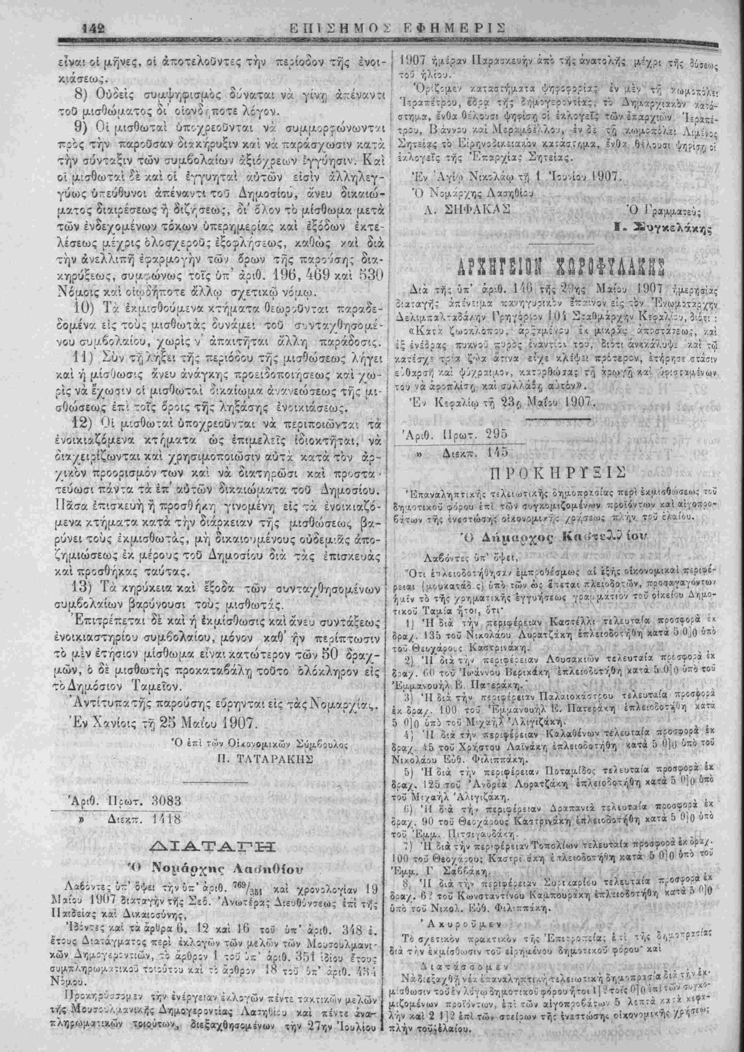 της ο>ατρο<ρής εξ·ία. Παρελθούση; δέ τής προ'ίεσ^ίας Οά ίχτελε- σ^ώσι τα νύμιμχ. Έν Γουστίχοις τ>) 2 Ίουνίου 1907.