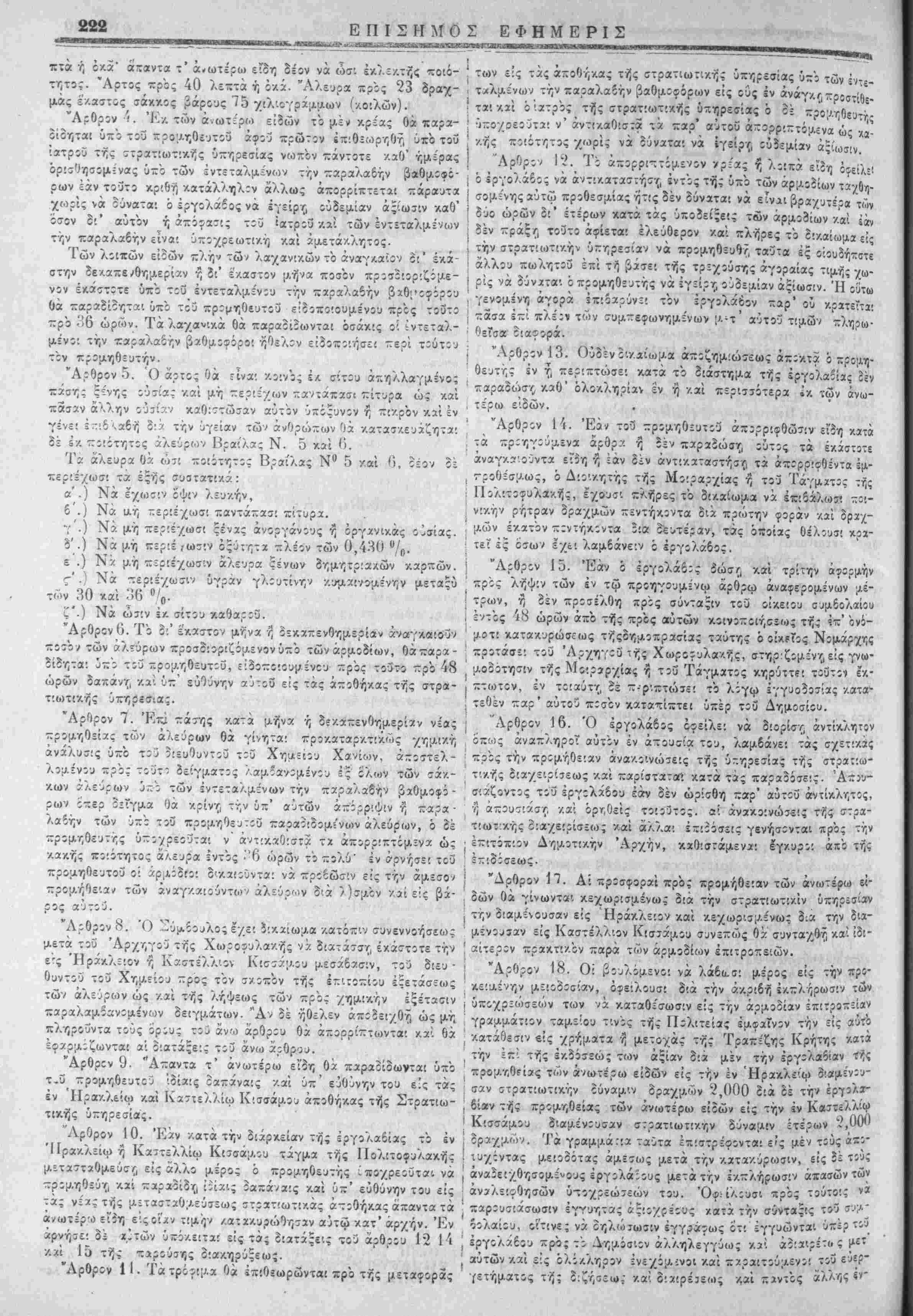 Τα άλευρα θά ώσι ποιότητος Βοαίλας Ν0 5 /«ι <), ίεον οε »ναγ·/.:ί·.οϋντα ει'2η · έαν οΐν αντ-.χαταστή^, τα άπϊρριφθίντα 3μ- ϊμίχωα τα εξής συστατικά: . Γροθέσαως, ο Διοιχητης τής Μοιραρχίας ή" τού Τάγμζτος τής α.) Νά εχωο-ιν όψιν λευκήν, | Πολίτοφυλακής, έχουσι πΛήρες τό 3(/.αίωμα νά έ-δάλω* πο-- 6'.) Νά αη ζεριέχωσι παντάπασι πίτυρα. . ; ν!^ν Ρ'ί"<τ?3ίν 3?*Ζί»·ών -ίντήκοντα διά πρώτην φοράν ·/.« δρα-/- γ'.) Νά μή περ'έχωσι Εένα: άνοργάνους ή1 19-<τη%χς ο^ίας. ; '^·ών εκατόν π:ντήκ;ντα ο:α δί^τέραν, τίς οποίας θέλουσι κοϊ- δ'.) Νά μή περιέ ,"ωσ:ν ό;ύ;ητα πλέον των Ο,4ΗΟ %· ' Τεϊ '^ °σω'' Ιχ6! λαΙα·6α:νε:ν = «ΡΥ-λοιδθί. ε.) Νά μ.ή περϊέχωϊ'.ν ά'λευρα ξένων δημητρια/ών καρπών. ] "Αρθρον 15. Εάν ό έργολάδ;ς 3ώσ{, καΐ τρίτην αφορμήν ς'.] Να -τεριέχωτιν ύγράν γλουτίνην -/.υμαίνομΒνην μεταςύ ' πρός λήψιν των έν τω πρίηγουμίνω αρθρω αναφερομένων μέ- το>ν 30 καί ο6 %. τρών, η 3έν προσέλθη προ; σΰνταξιν τοθ οίχείου συμδολαίου