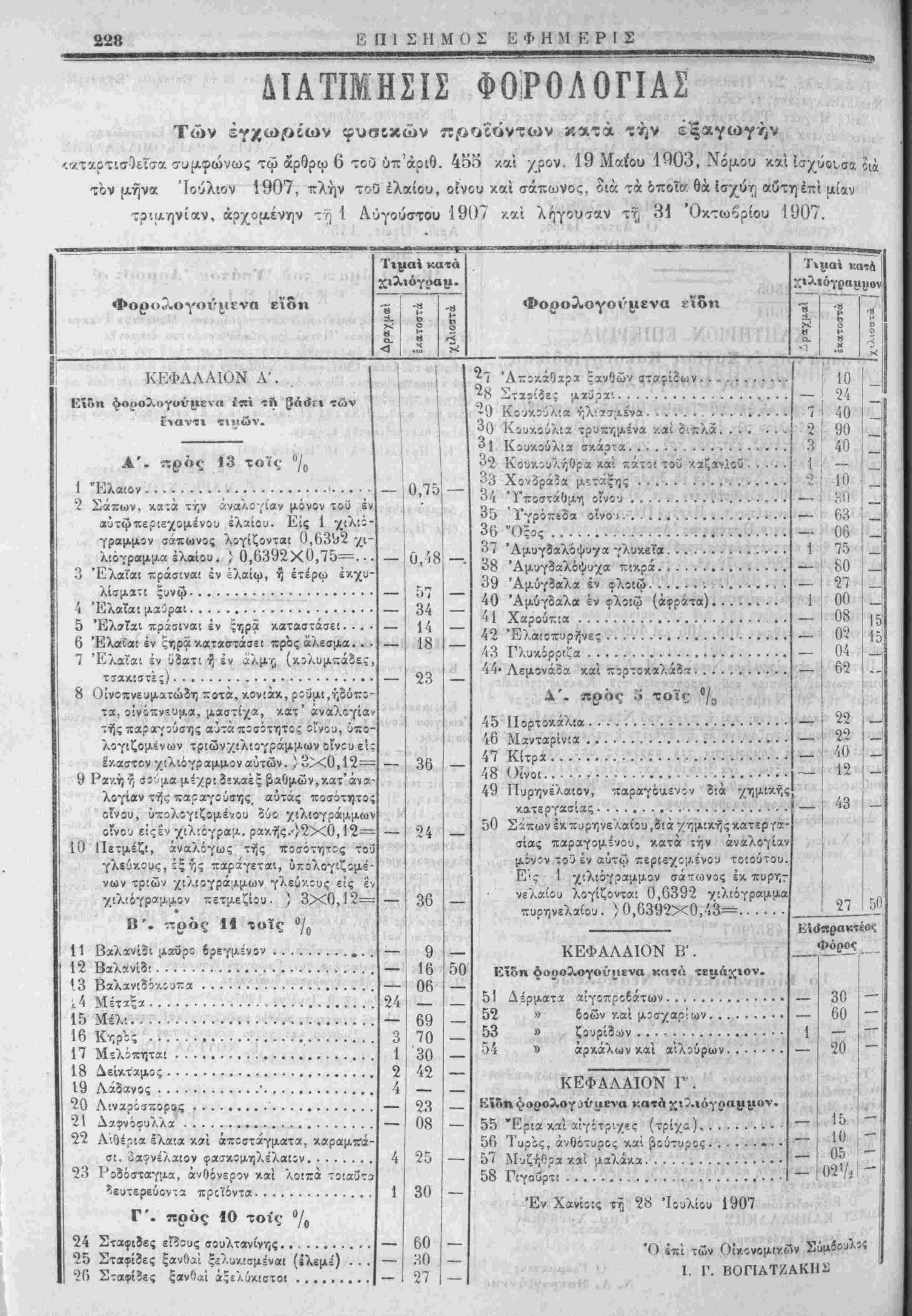 τον μήνα Ιούλιον 1907, πλήν τοθ ελαίου, οίνου καί σάπωνος, διά τα δποΐο- θά Ισχύϊ] αυτή επί μίαν