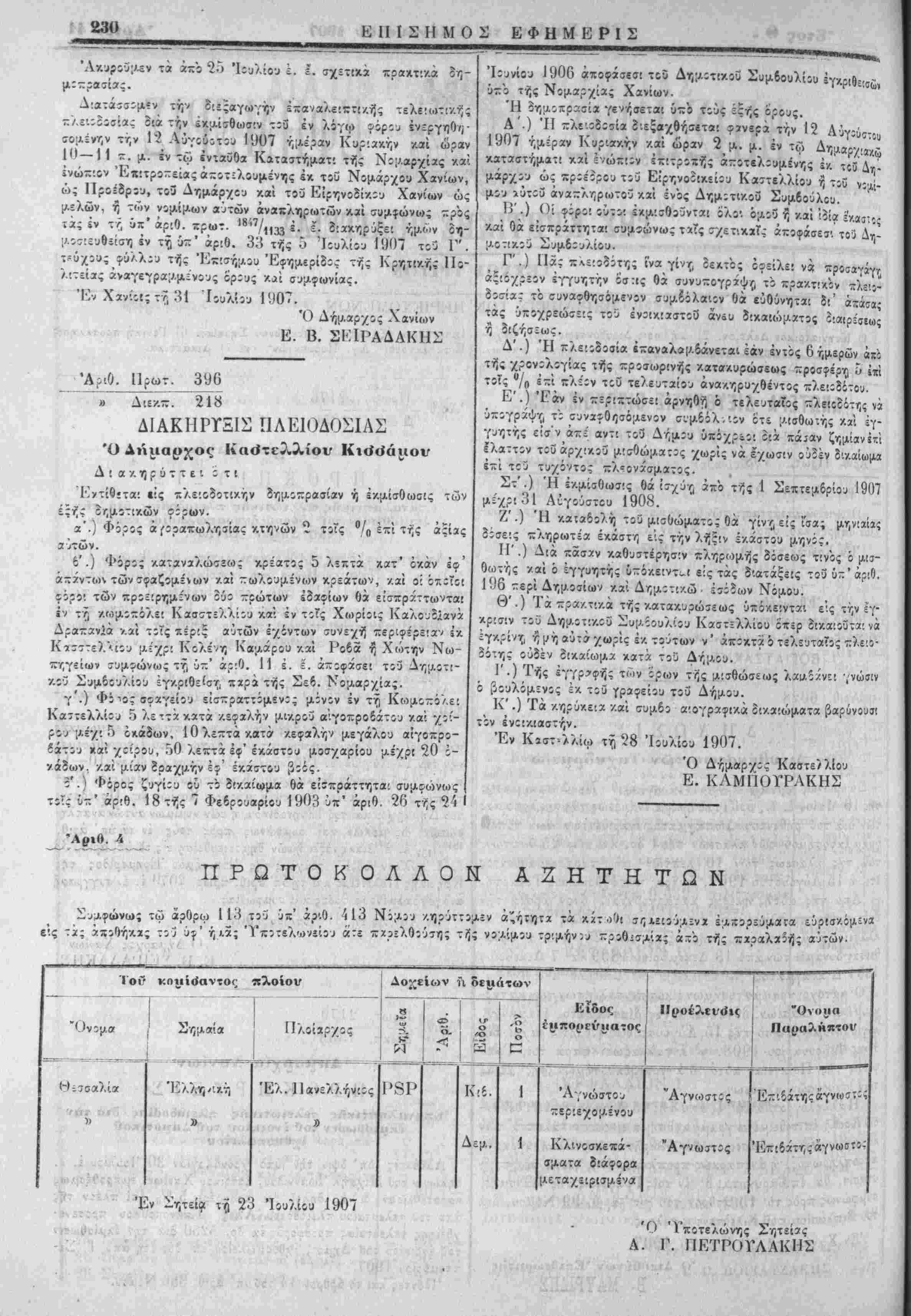 ΰπ' αριθ. 12 τής 31 Ίανουαρ'ου 1907 "έκθεσις τής Χωρο-