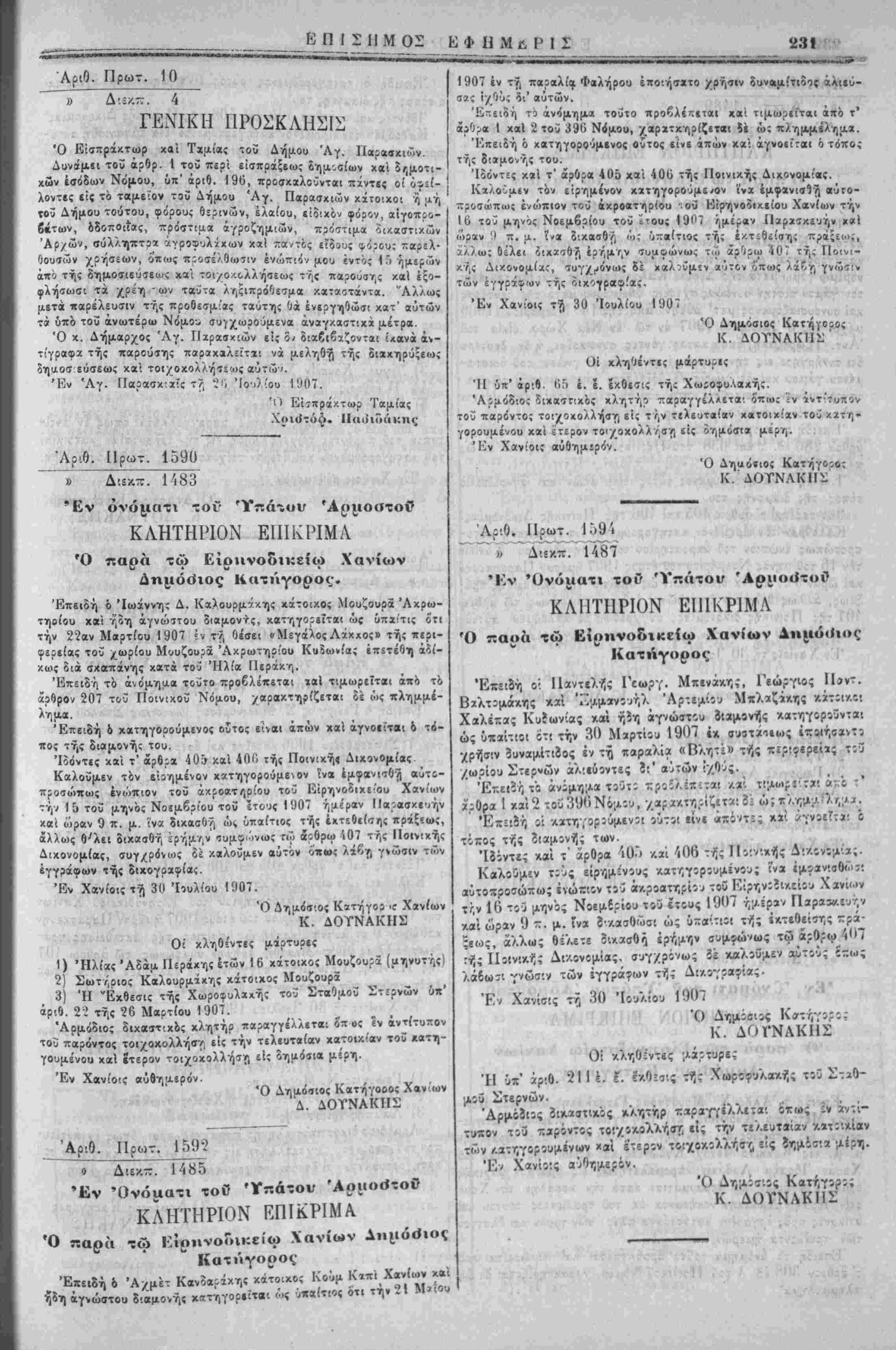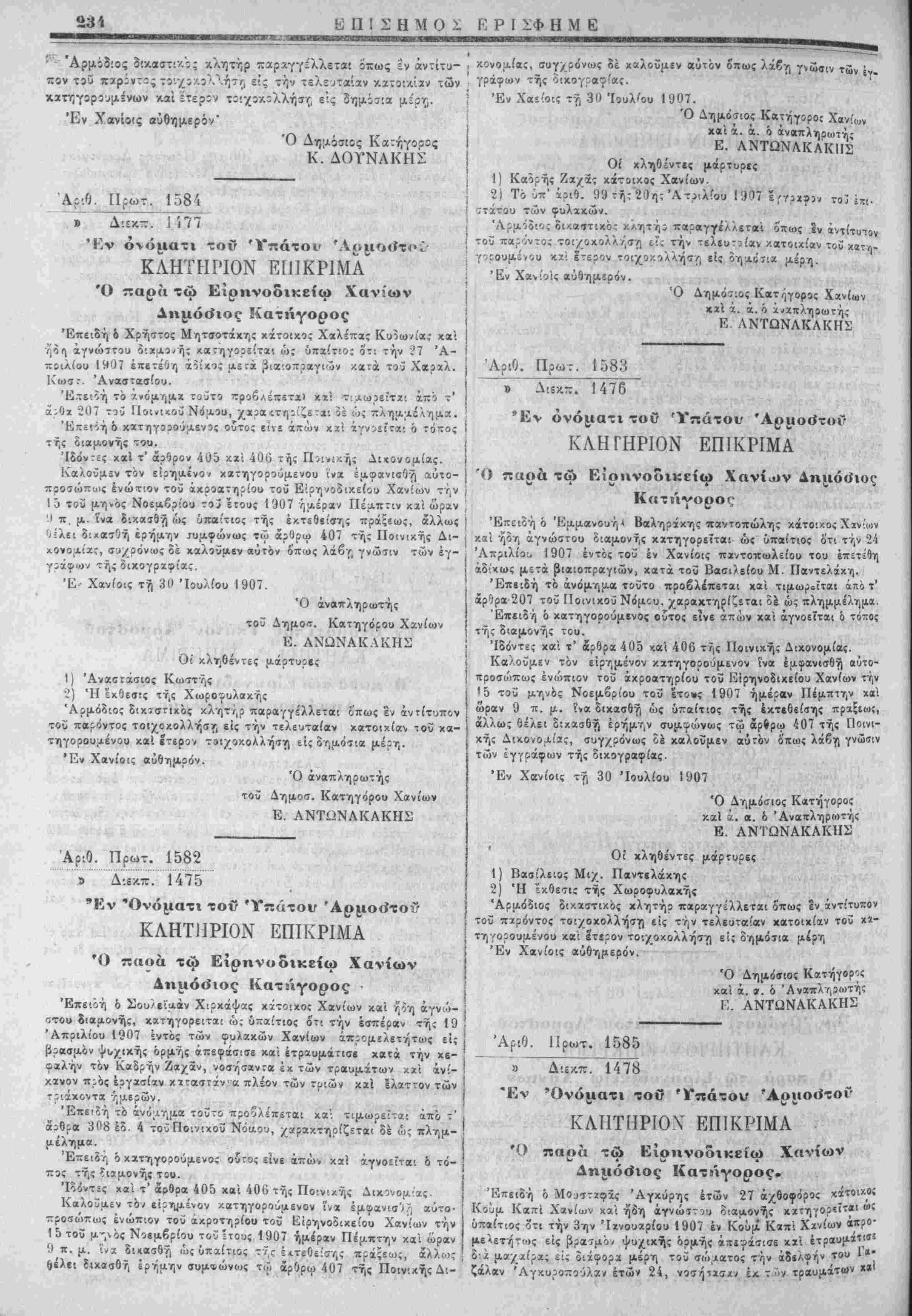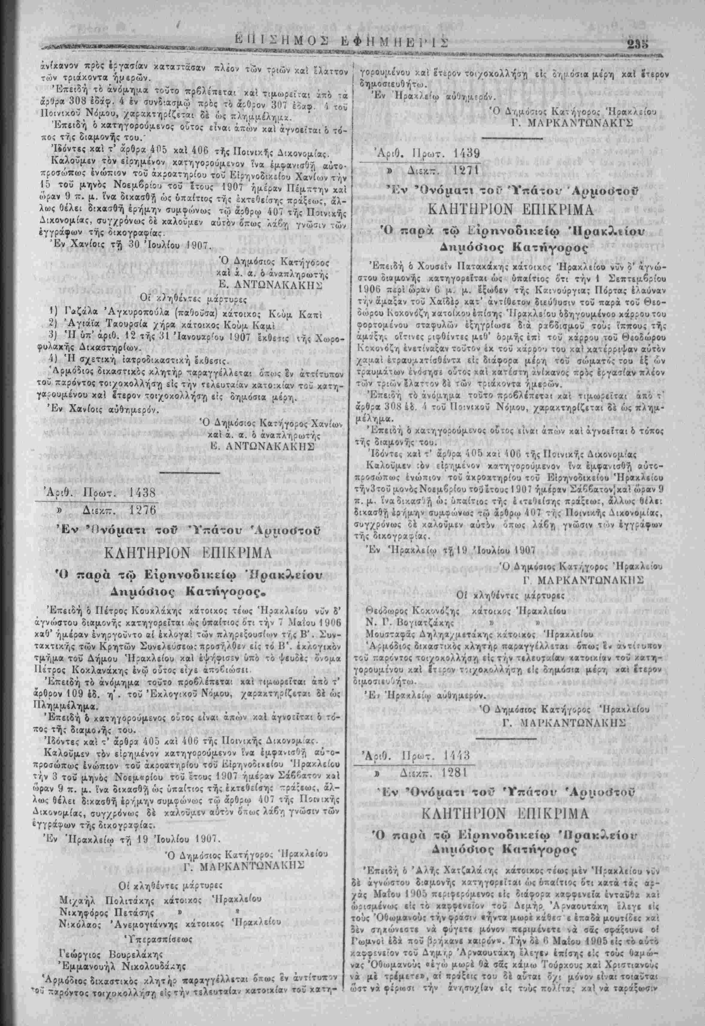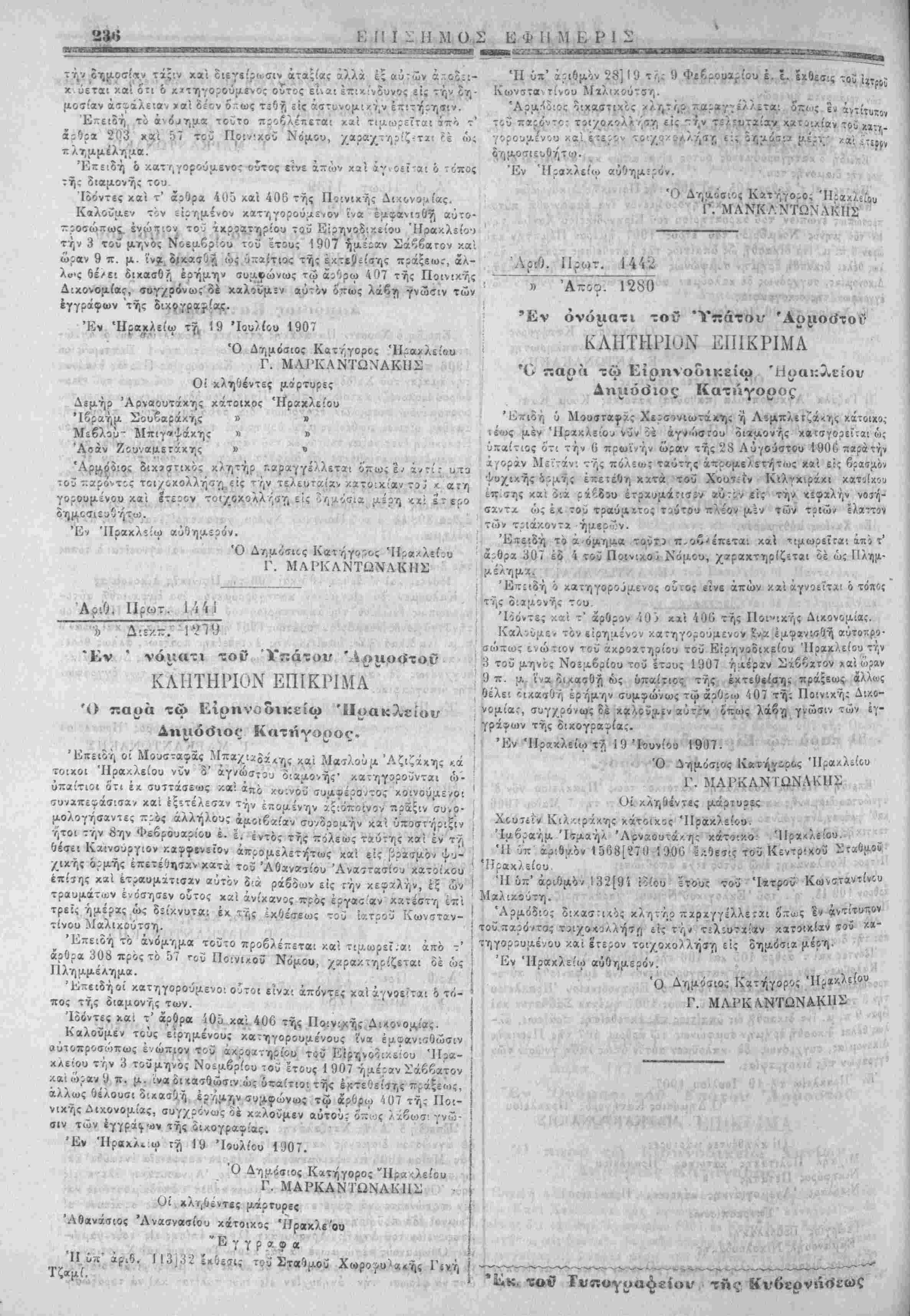 μολογήβαντες π:ός αλλήλους αμοιβαίαν συνδρομήν χαί ύποστήοιξιν ' Χιυΐίί» Κιλ/.ιρχΛης χά/τοιχος ΊΙραχλε'ΐ.0. ' ν,«/>,τ<.Λ»*9 /■;τοι την 8ην Φεβρουαρ·ου έ. έ. ί¥τόΤ τής πόλεως ταύτης καί έν'τ/, ' Ίμβραήμ. 'Ιίμαήλ 'Αραουτά/η; χάτ^.κο Ίίρ*<νέ%8Λ 6εσει Καινουργιον χα^ενεΐθί άπρομελετν-τως χαί εί; 'ιίοίσμό/ ψυ- '1! ^ ου'β/όν 1568[270 1900 ί/.9ει-ς τοϋ Κεντρ-χοϋ -< /ιχτ,ς ό:μίις επετεθησαν κατα τί·,,νΛ(1,ν^,'«,, ά..,^,,^λ. »»,λΛ,... ' Ίίραχλείου 'ΙΙ ΰπ' άρι%ό^ Ι32[94 ϊϊ'ου ετους ταϋ Ίΐτρου Κωνσταντ Γ. ΜΛΡΚΑΝΤΩΝλΚΗϊ Έπειδήοι χατηγοροΰμενο· οίτοι ε'ινα· άπόντε,- χαϊ άγνοε^ται ό τή- Τίος της οιαμονης των. 'Ιοόντες χαι τ' άρθρα 103 καί 406 τής Πο-ν^ής Δι«νβΛ.'βί. Καλούμεν τους είρτ,μένου; χατηγορουαε'νους ϊνα έμβα'νσβώσιν αυτοπροσώπως ε.ωπΙΟν τοϋ άκρο^τηοίου τοΰ Είρηνοοι/.εΐου Ή3α- χΑειου ΤΓ,ν 3 τού μηνός Νοεμβριού -ου ετους 1 907 ήμέ^ν ϊάδζατον τεθείσης π^άξειος, άλλως θέλουσι δικασθή ερ,,μην συμφώνως τώ άοΟρω ι 07 τή; Ποι- νιχης Δικονομΐίς, συγχβονως οέ καλούμεν αυτού-- οττ',,ς λ χδωσ- γνώ¬ σιν των έγγρα^·«ν τής αΐΛθγραφίας. ν^ίΐ.ί ι ,ί. . ,,ί^ϊί' Έν Ήρβχλι ω ΐ>ί ΐυ Ιουλίου 1907. . ' " -; ιτ·νγ^ ϊ