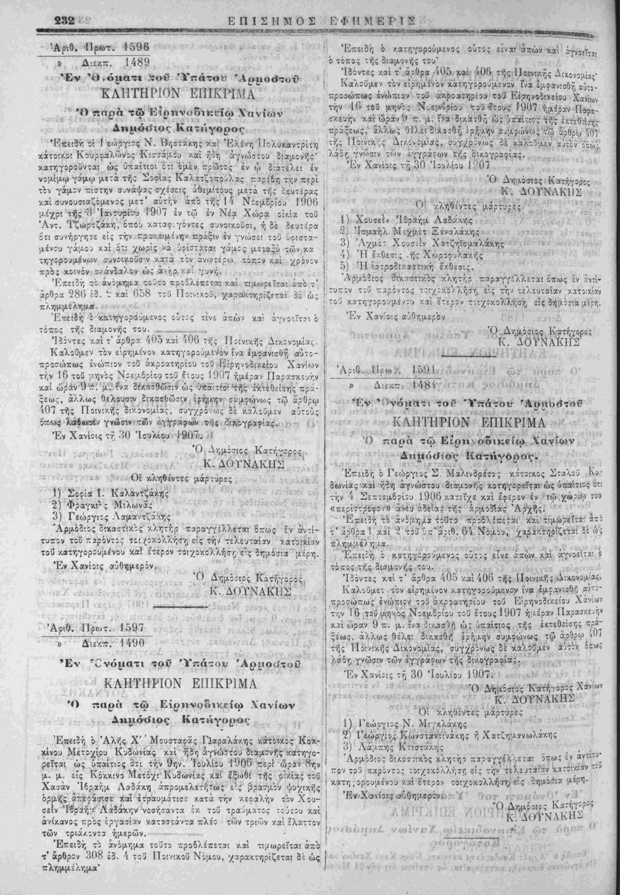 '.Ι π. μ. <χ δικασθή ώς ύπαίτιο; τ7; |*τεθε.'σης πράξε(υ;, άλλως 6«λει δικβσθή έρήμην συμφώνως τω άρθρω 407 τής ΠοινκήςΔι- Αριθ. Πρωτ. 1585 ,ιΓ). » Διε^π. 1478 Έν Όνόματι τοί? 'ΪΉάτον ΚΑΗΤΗΡΙΟν ΕΠΙΚΡΙΜΑ Ό παρά τώ Εΐρηνοδικείω Χανίων, Δηπόίίιος Κατήγορος. *«"' 'Επειδή ό Μο^7τ39ας Άγχυρης έτών 27 άχθοφόρος κάτοιχο; Κούμ Καπί Χανίων χα'ι ήδη άγνώττιυ 8'αμονής κΐτηγορ'.ϊτ"1 ωί ΰπαίτιος ότι την 3ην Ίανουαρίου 1907 έν Κούμ Καπί Χανίων ««Ρ°_' μελετήτως είς βρατμόί ψυχιχής όραής άπεφίσισε κΐϊ βτραομ*τ'σ- δ-ά μα/αίρα; εί; διάφορα μέρη τοΰ σώ.-ιατοί την άδίΛφήν τού 1»· ζάλαν ;Αγκυ;οτ:5;λαν έτών 24, νοσ/)ΐ*σ*/ έ- -" ■ —»»'^*">ν ««'
