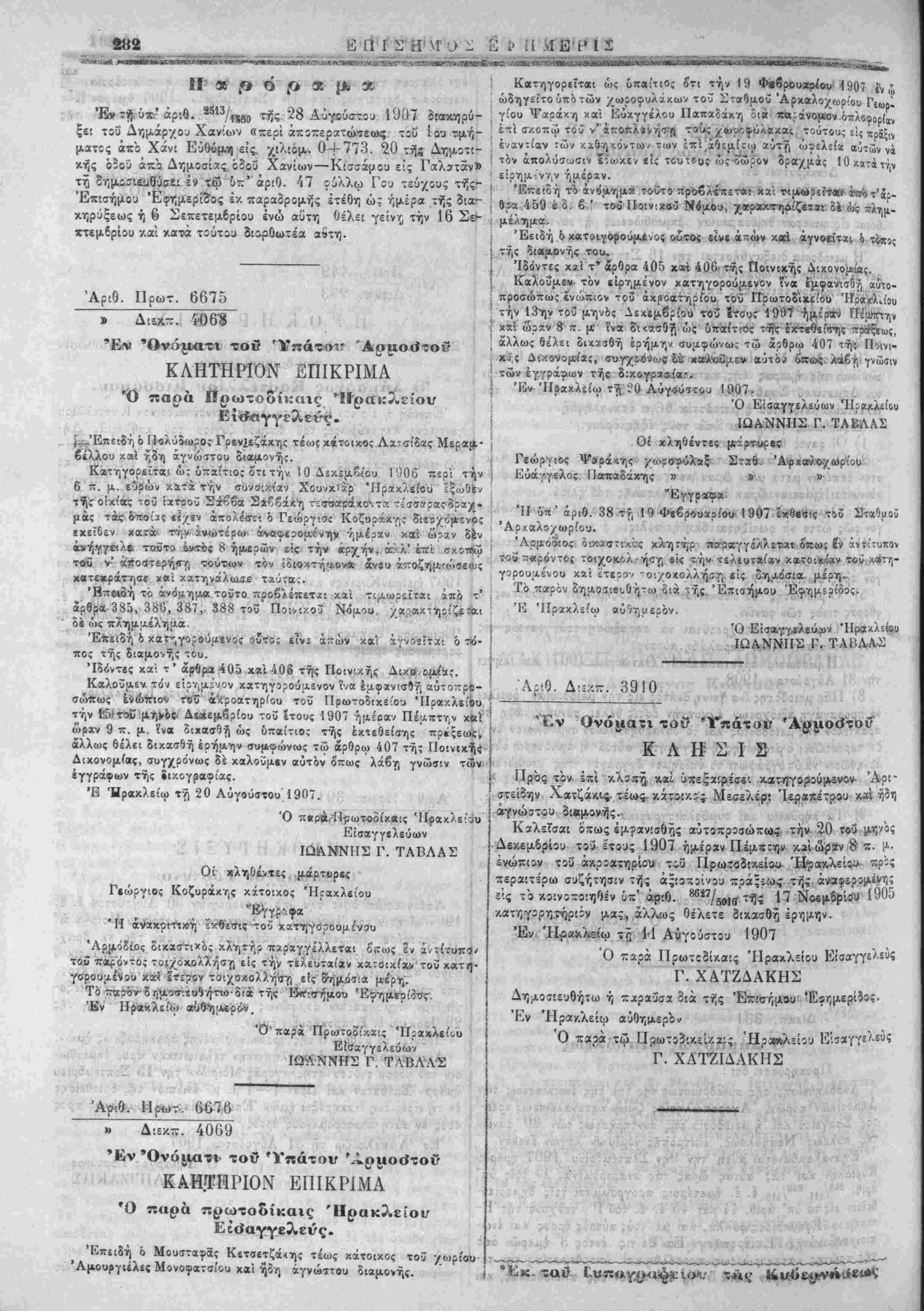 άλλως θέλει δικασθή έρήμην σομ<ρών<ος τώ άρθρω 407 τή; Ποινικήί Διχονομ(ας, συγχοόνως δέ χαλοϋμεν αυτόν όπως λάβγ; γνώσιν Τ< εγγράφων τής ϊικογραφίας. 'Β Ηρακλείω τ^ 20 Αύγβΰστου 1907. Ό πβρϊι, ΙΊρωτ·οοίκ*ις ' Είσαγγελεύων ' " ' ΙΩΆΝΝΗΣ Γ. ΤΑΒΛΑΣ Οί Άΐρχα«)τ>.χο)ρτΌΐλ