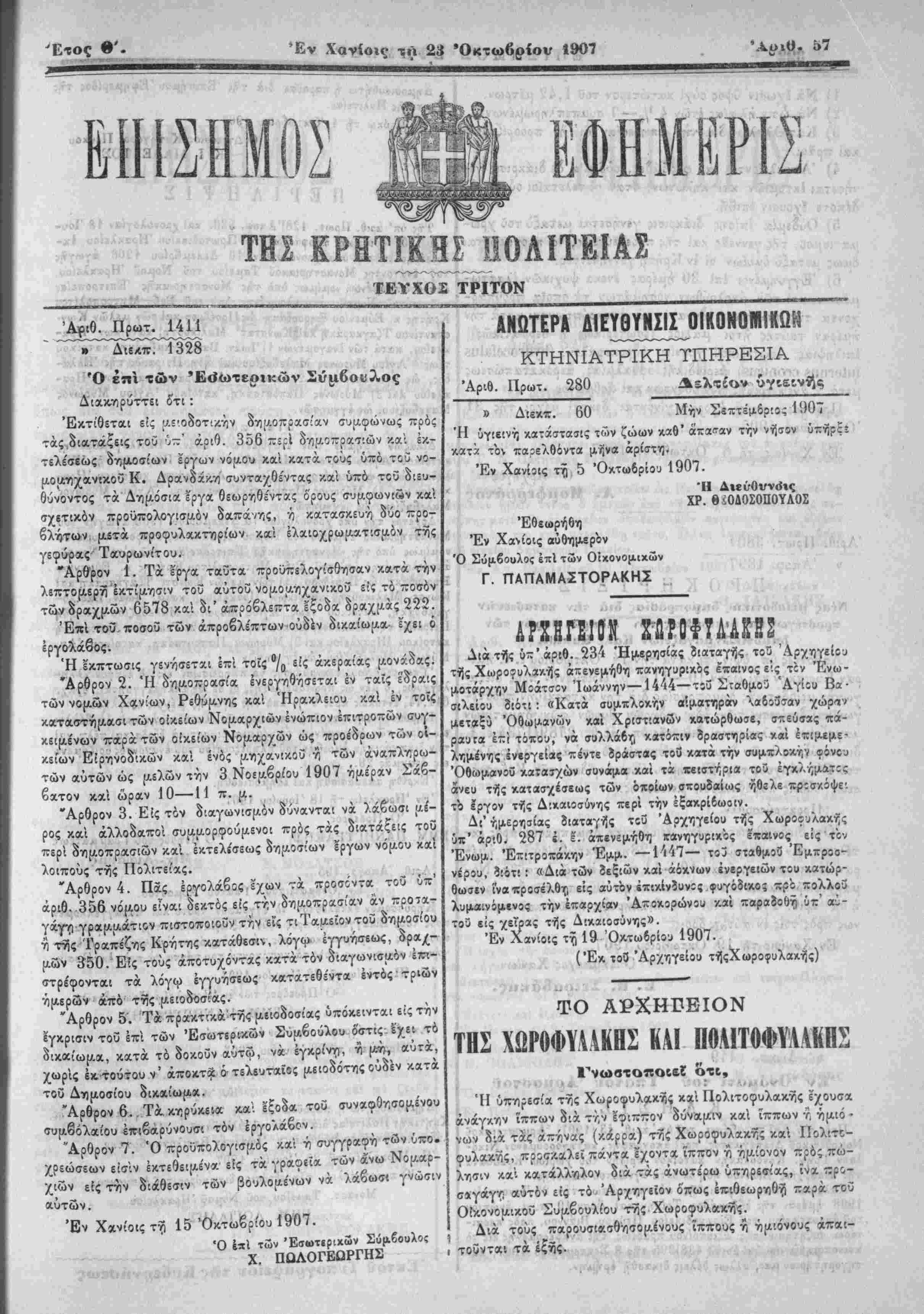 χιών είς την διάθεσιν των βουλομένων νά λ«βωσ< γνώσιν αυτών. Έν Χανίοις τχί 15 Όκτωβρίου 1907. Ό 4*ί των 'Εσωτβρικών Σύμ6ουλος χ. ΠΩΛ0ΓΕ0ΡΓΗ2 ; . ΑΝΩΤΕΡΑ ΔΙΕΥΘΥΝΣΙΣ ΟΙΚΟΝΟΪΤΙ!ΚΩ - 5 !' * ' ΚΤΗΝΙΑΤΡΙΚΗ ΤΠΗΡΕΣΙΑ ν:.- Αριθ. Πρωτ. 280 Δελτίον ύγιεινής » Διεκπ. 60 Μην Σίπτέμδριος 190" Ή ύγιεινή κατάστασις των ζώων καθ" άπασαν την νήσον ύπήρΗ* κατά τόν παρελθόντα μηνα αρίστη. Έν Χανίοις τη 5 Όκτωδρίοο 1907. "Η ς ΧΡ. βιΟΔΟΣΟΠΟΥΑΟΣ Εθεωρήθη Έν Χανίοις αυθημερόν Ό Σΰμδοολος επί των Ο'ικονομικών Γ. ΠΑΠΑΜΑΣΤΟΡΑΚΗΣ λ ρ:: η γ ξ ι α >;