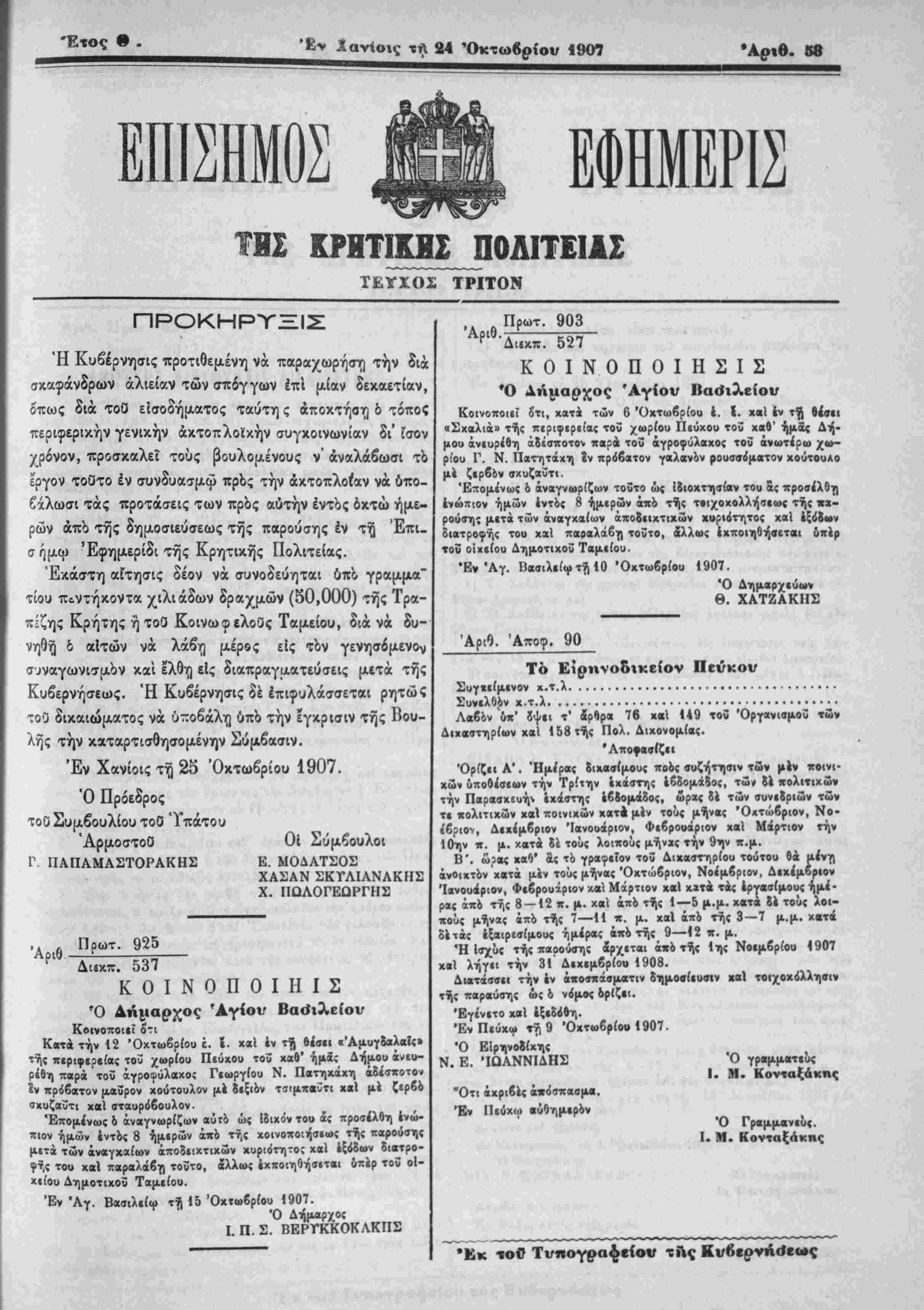 Έν Χανίοις τη 25 Όκτωβρίου 1907.