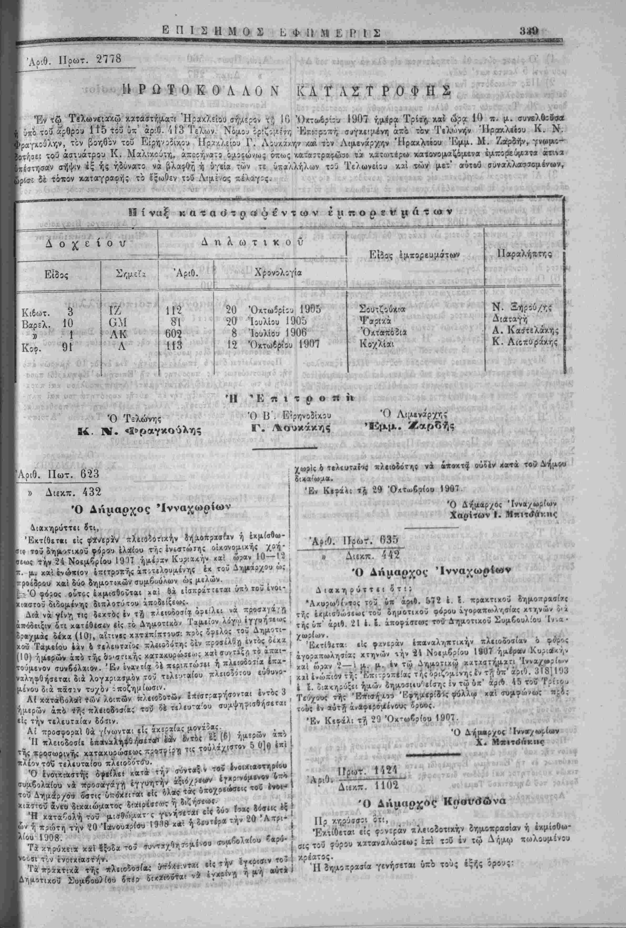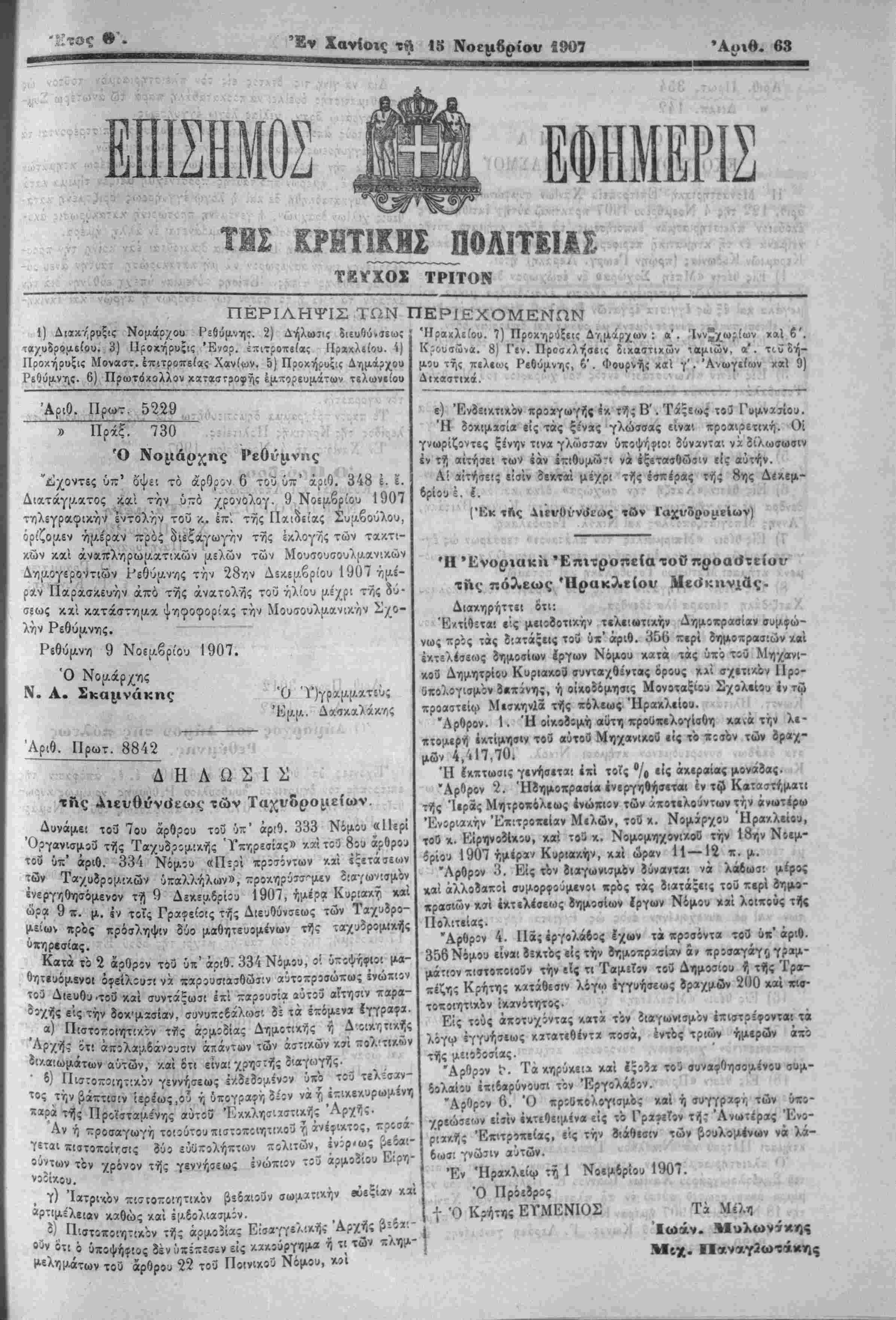 Δι«.τάγ|ο.χτος καί την υπό χρονολογ. 9 Νοεμβριού 1907